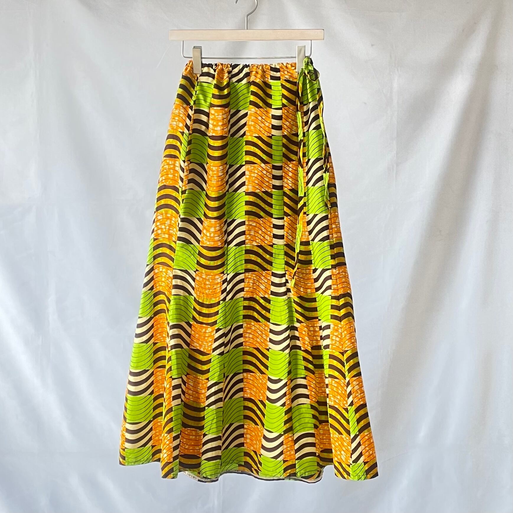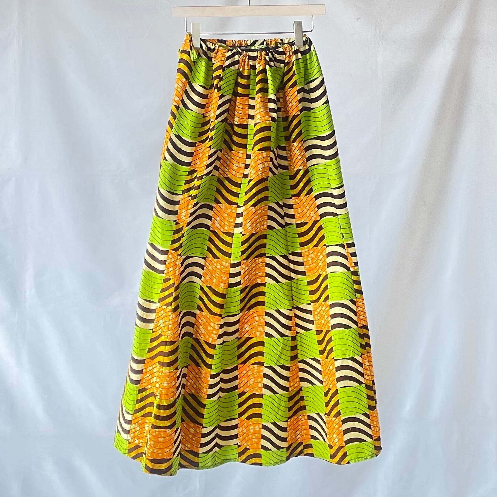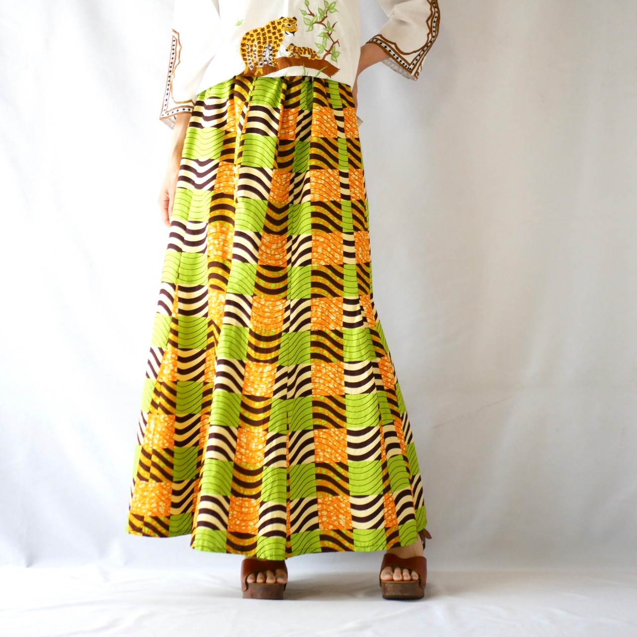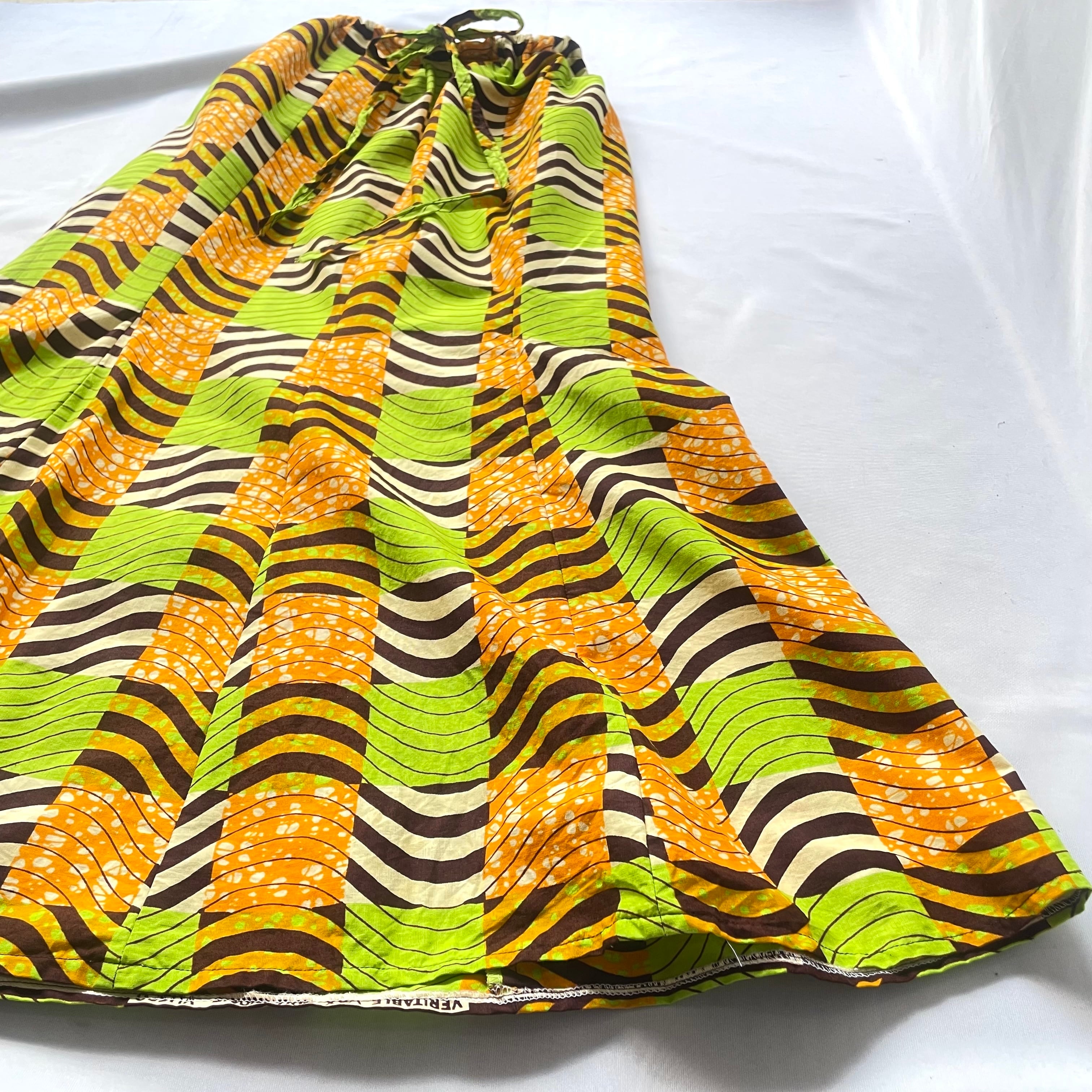 オレンジ ライトグリーン ブラウンの総柄が素敵な アフリカンバティック ワックスプリント マキシ丈 マーメイドスカートです。膝位まで内側にブラウンのライナーで2枚仕立てになっており、透けません。膝辺りからフレアシルエットになったマーメイドラインで、ウエストの紐を前に持ってきてもサイドに持ってきても楽しめるデザインです。