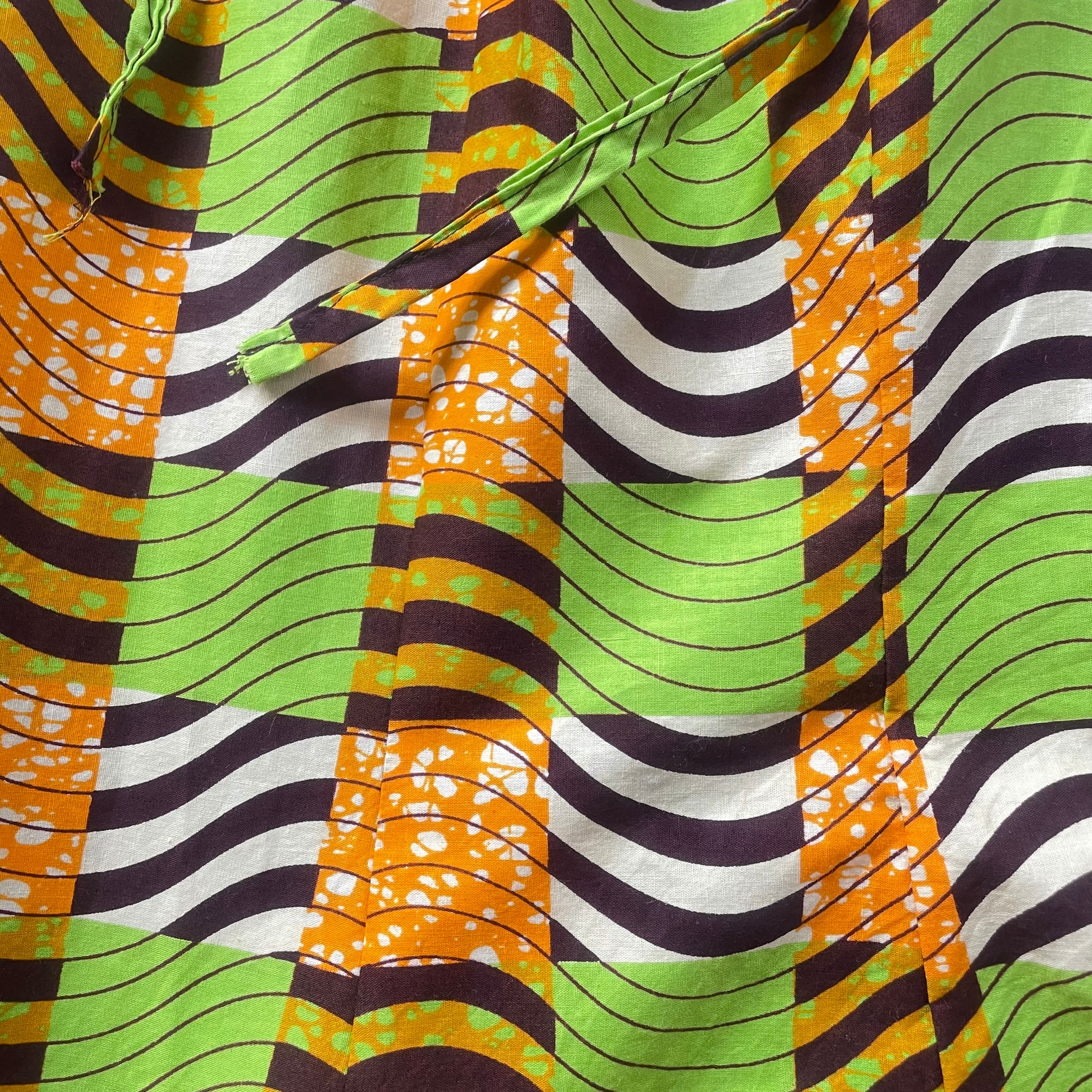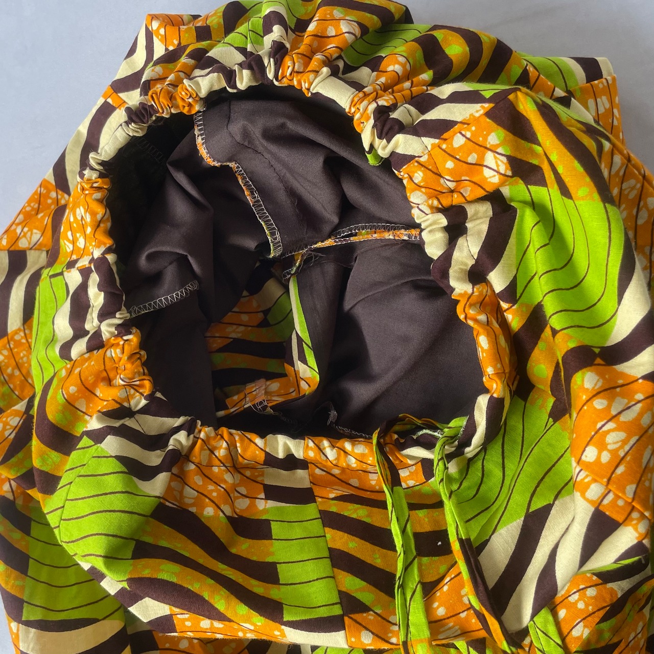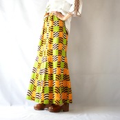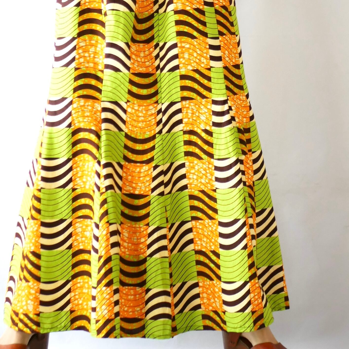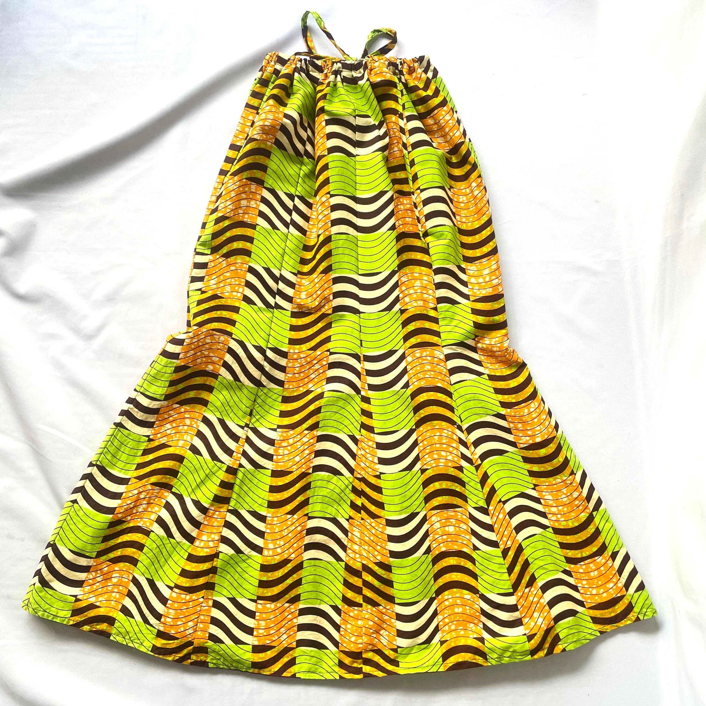 オレンジ ライトグリーン ブラウンの総柄が素敵な アフリカンバティック ワックスプリント マキシ丈 マーメイドスカートです。膝位まで内側にブラウンのライナーで2枚仕立てになっており、透けません。膝辺りからフレアシルエットになったマーメイドラインで、ウエストの紐を前に持ってきてもサイドに持ってきても楽しめるデザインです。