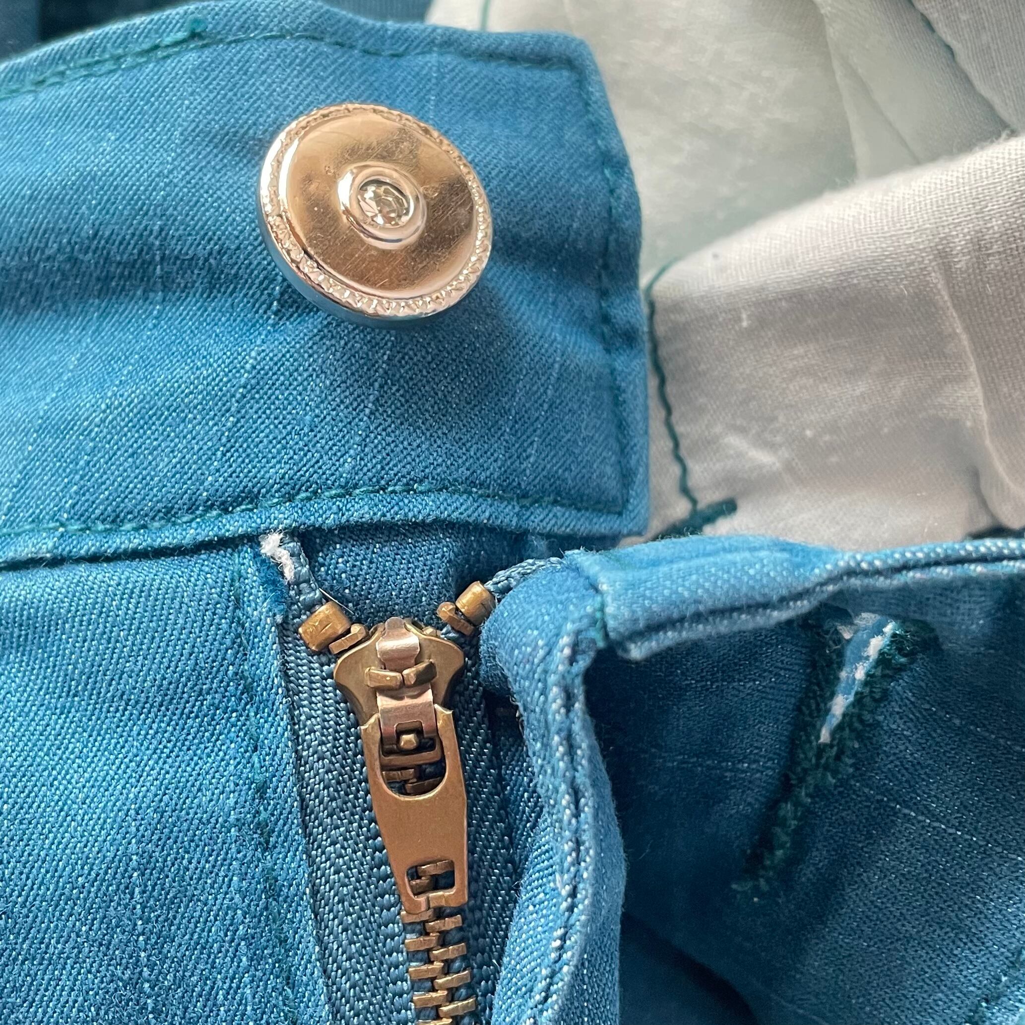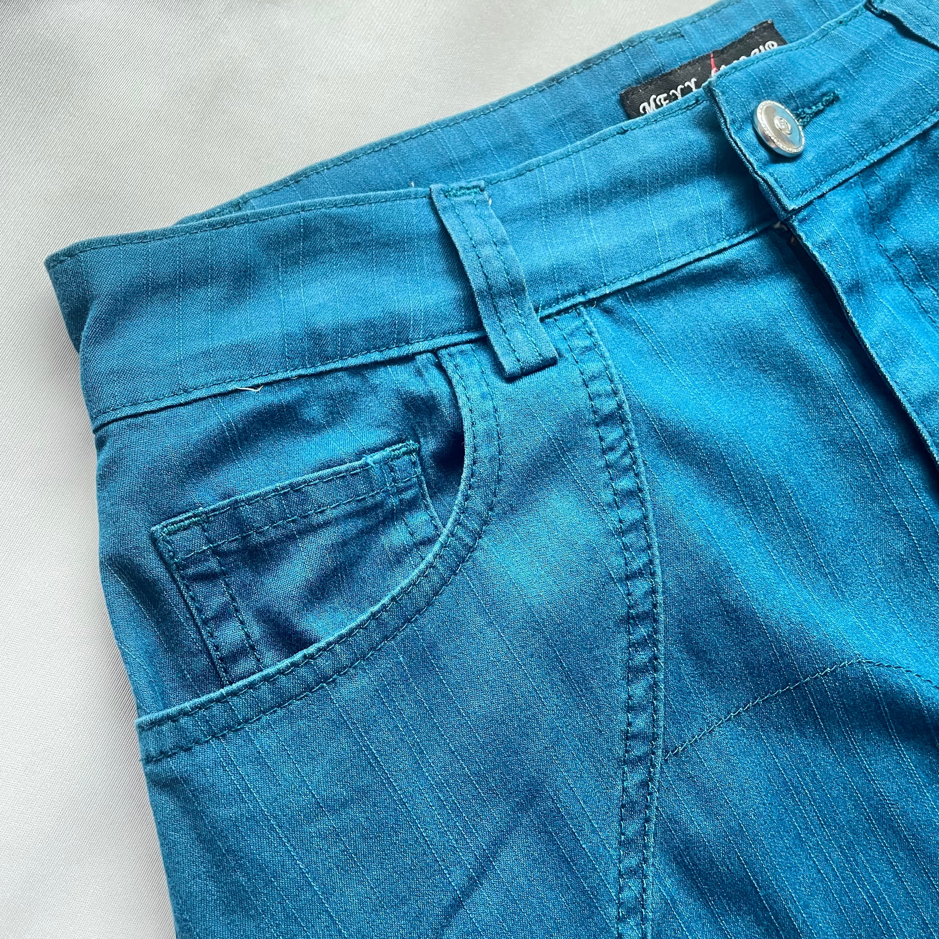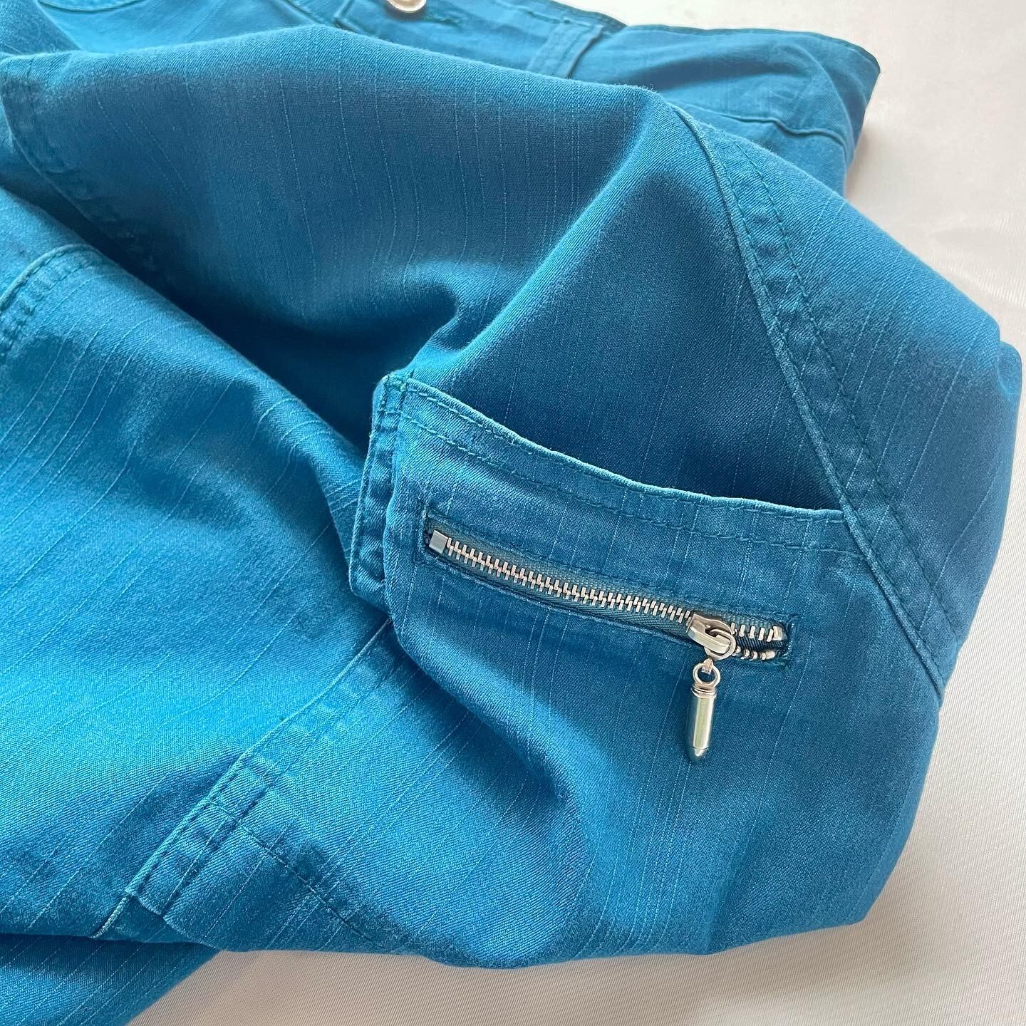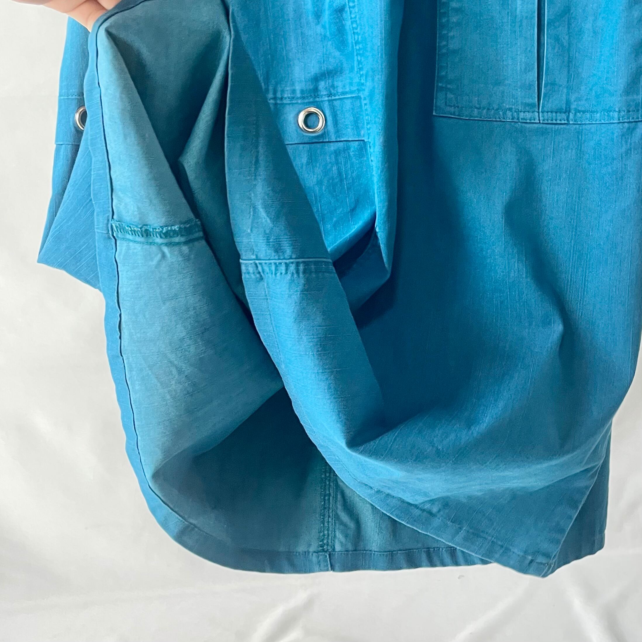 沢山付いたポケットやハトメ装飾が可愛い、ストレッチ素材のターコイズマキシ丈スカートです。