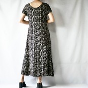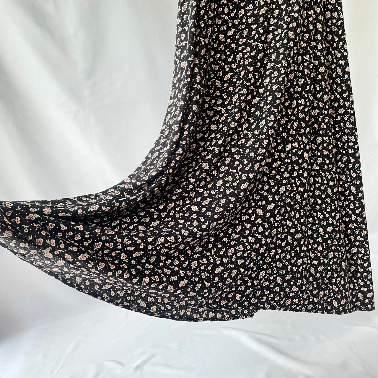 90年代頃のヴィンテージ 黒小花柄 レーヨン フレンチスリーブロングワンピース です。