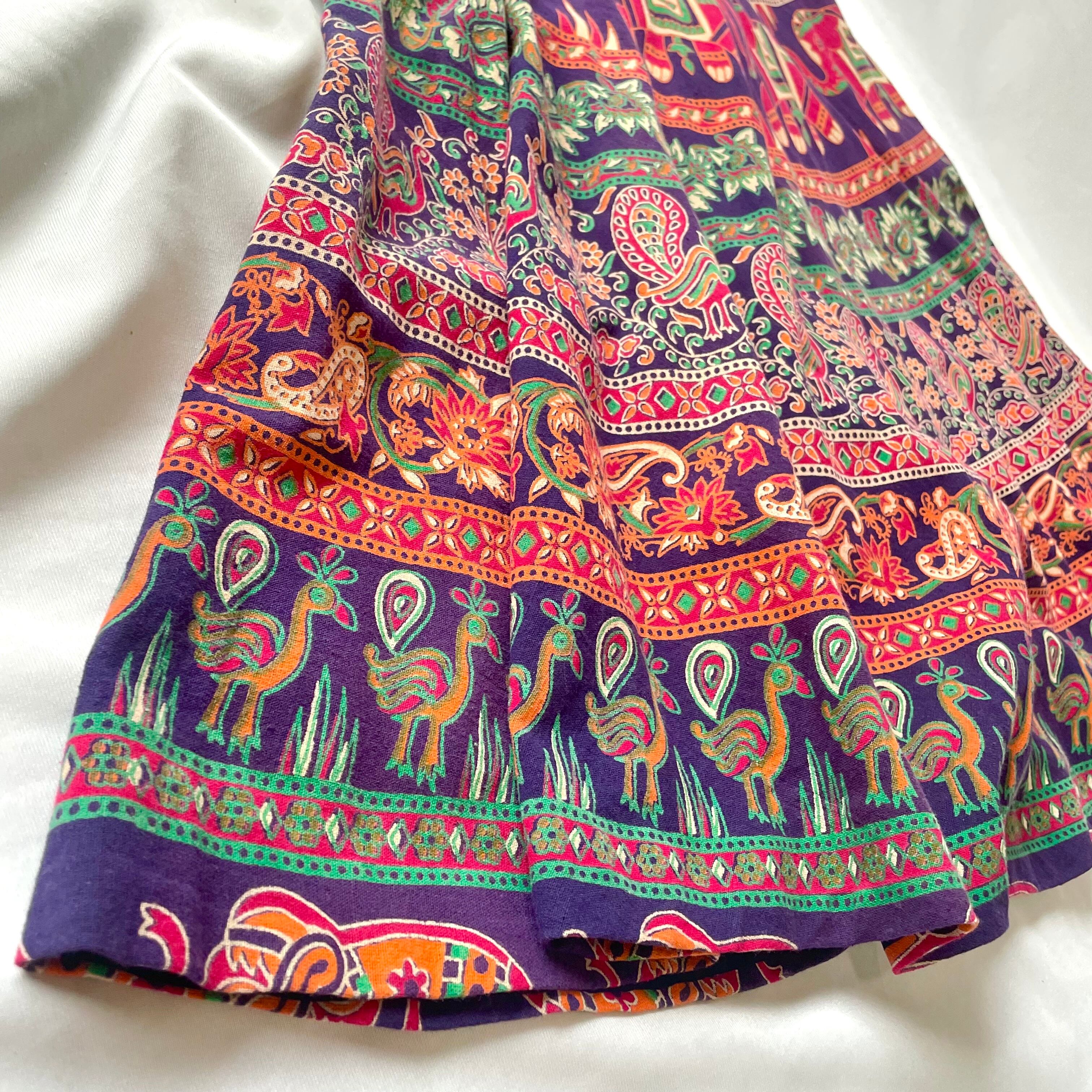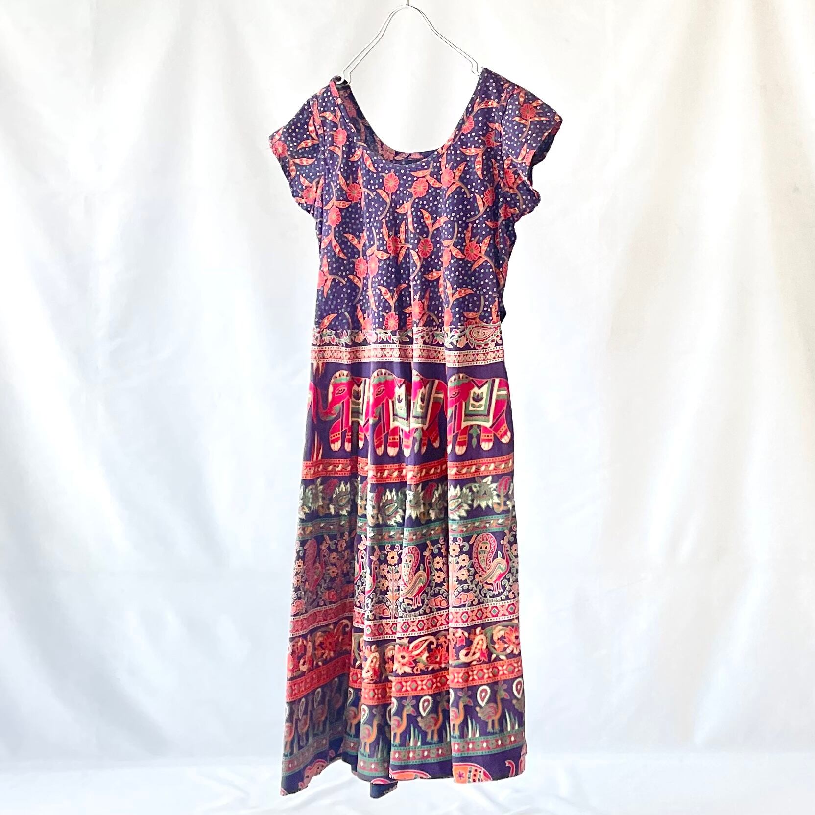 パープル系渋め鮮やかカラーの象&ペイズリー柄が可愛い、80s頃のヴィンテージインド綿ワンピースです。左にのみポケット付き