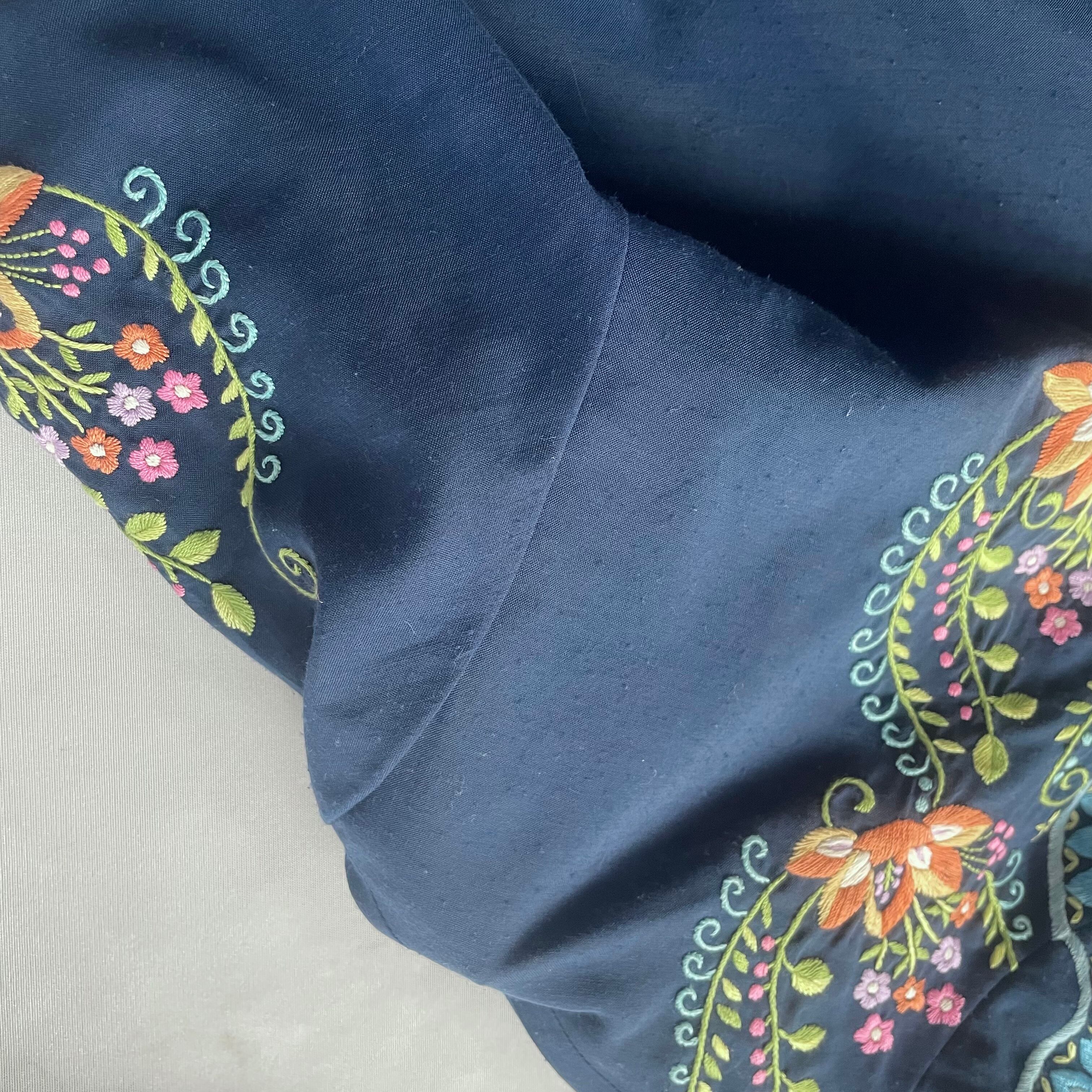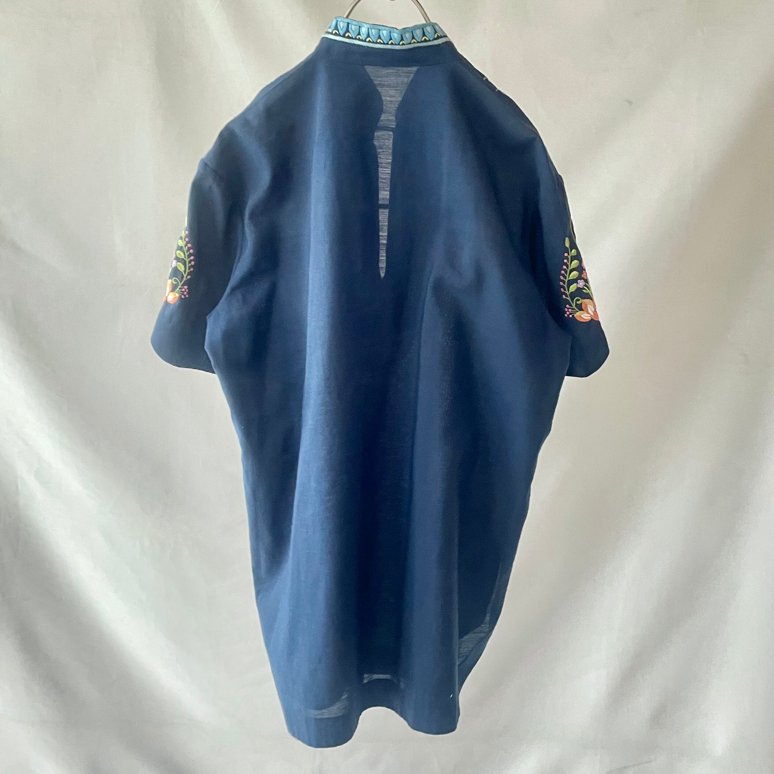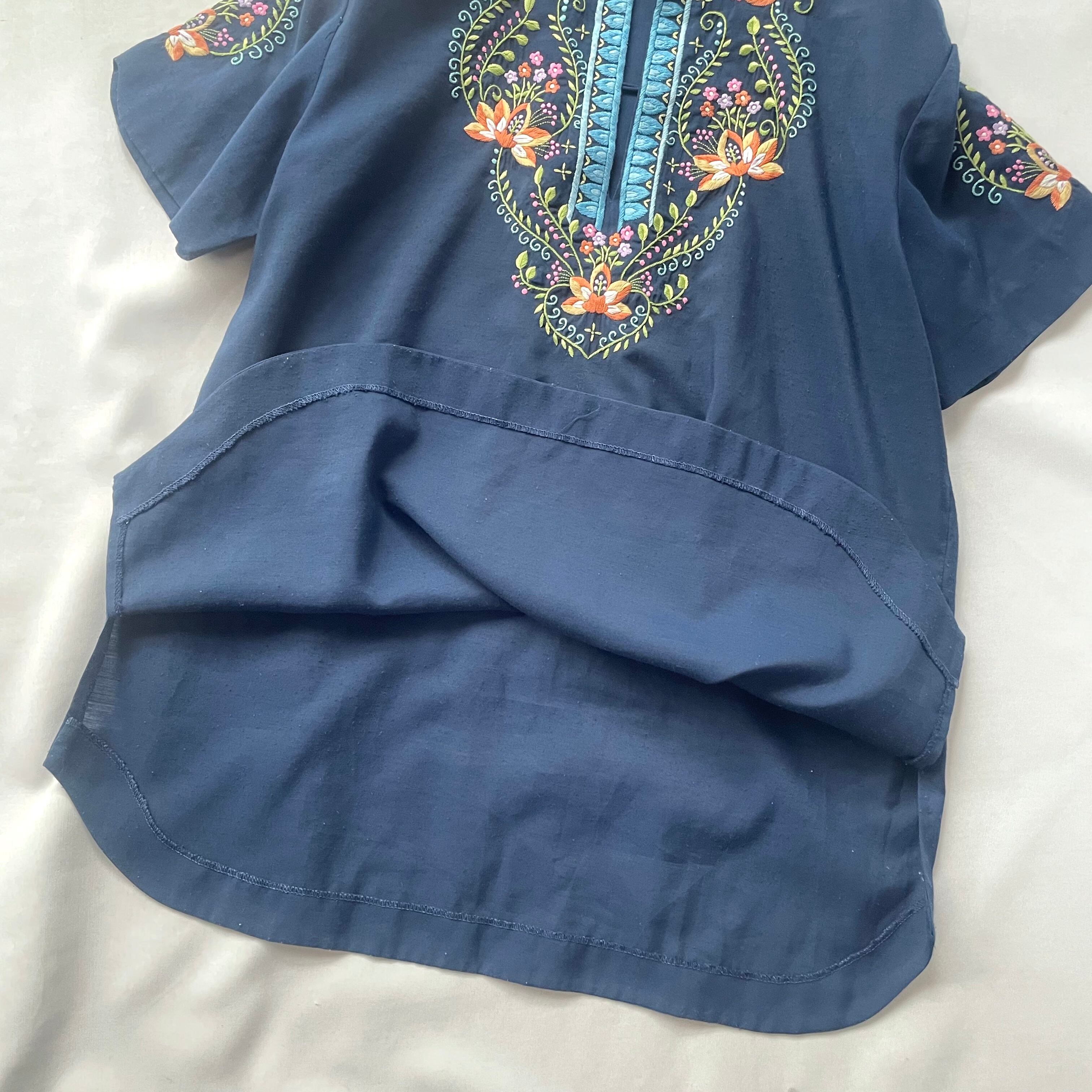ネイビーにカラフルな刺繍が入った、70年代ヴィンテージ チャイニーズ刺繍 プルオーバーブラウスです。