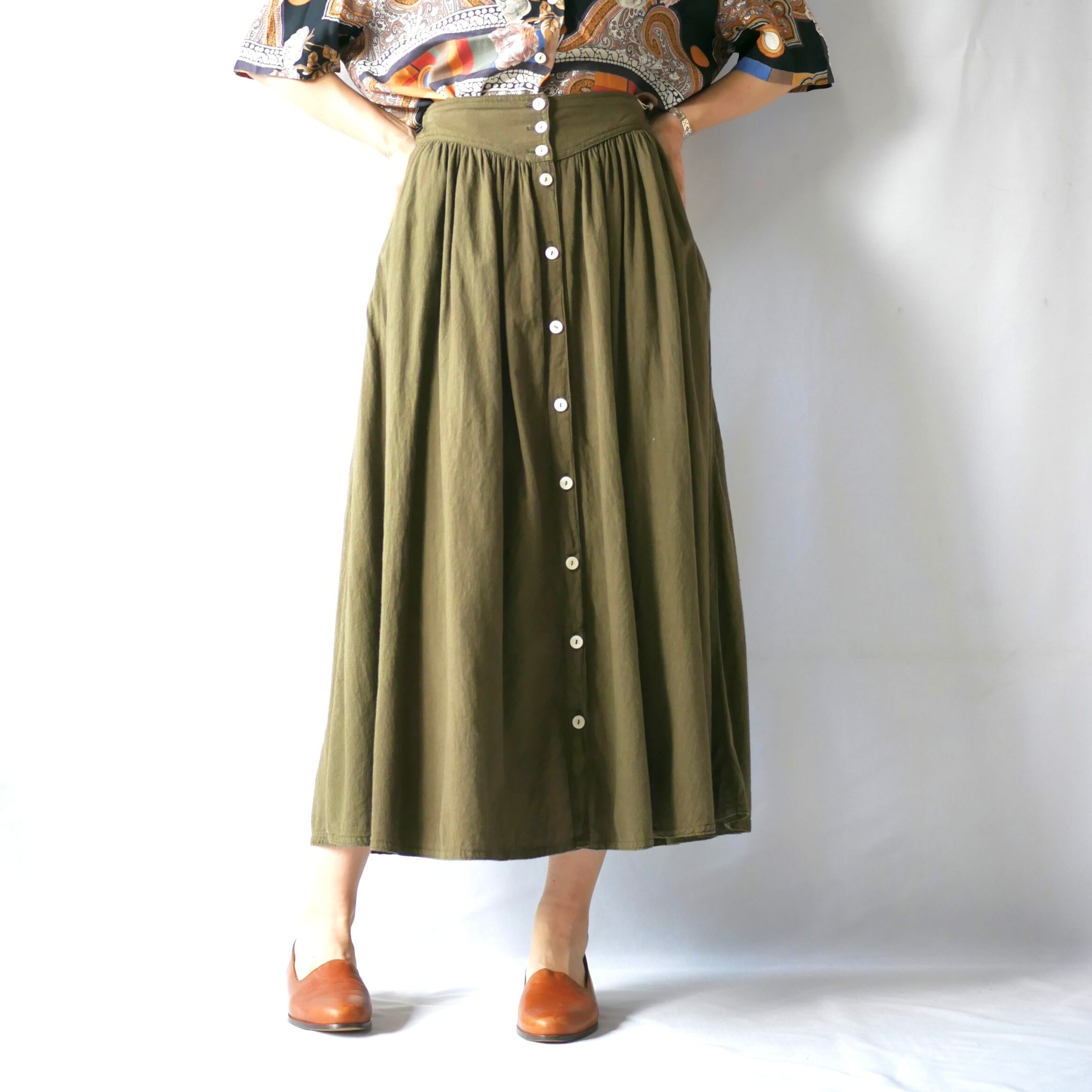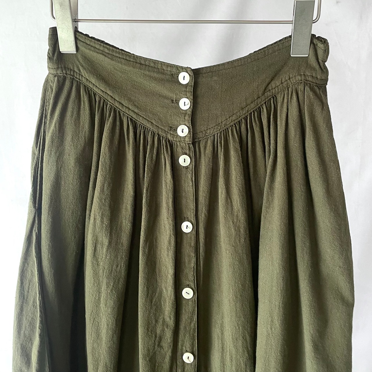 80年代ヴィンテージ アメリカ製コットン100%オリーブグリーン前ボタンフレアスカートです。ポケット付き。Color me cotton by L.A.drawstrings 100% american cotton