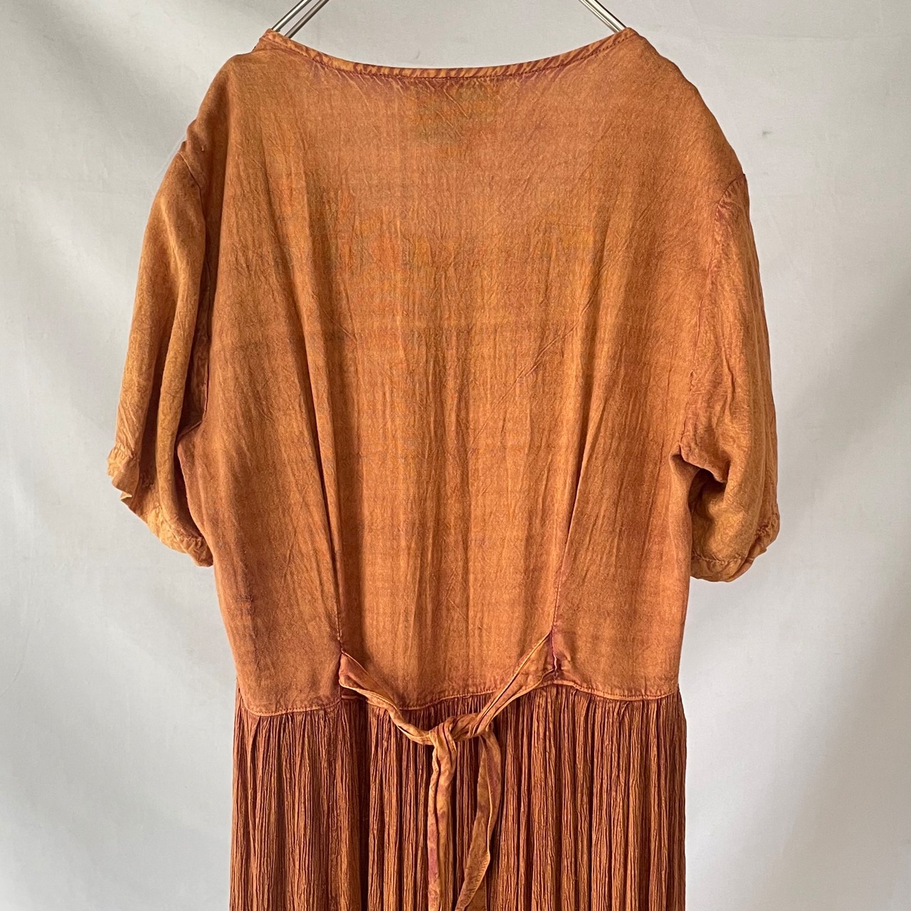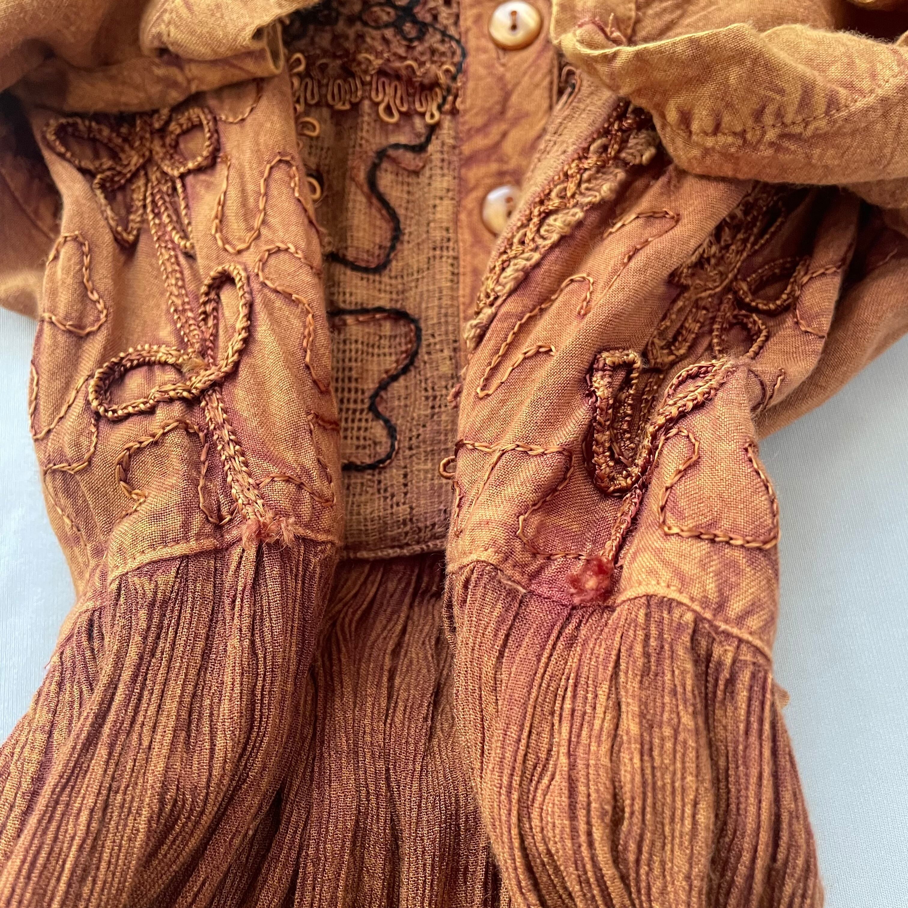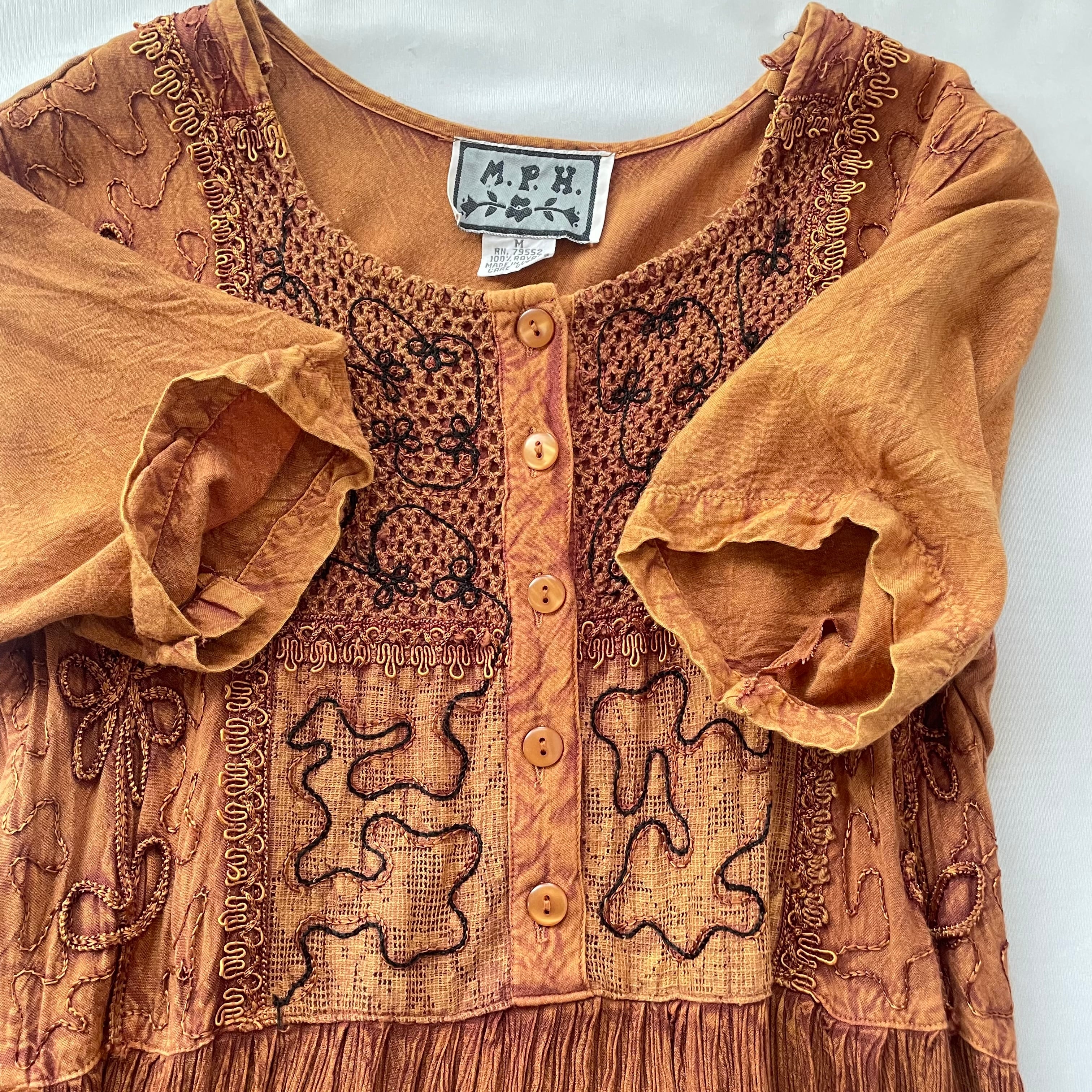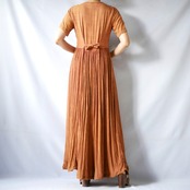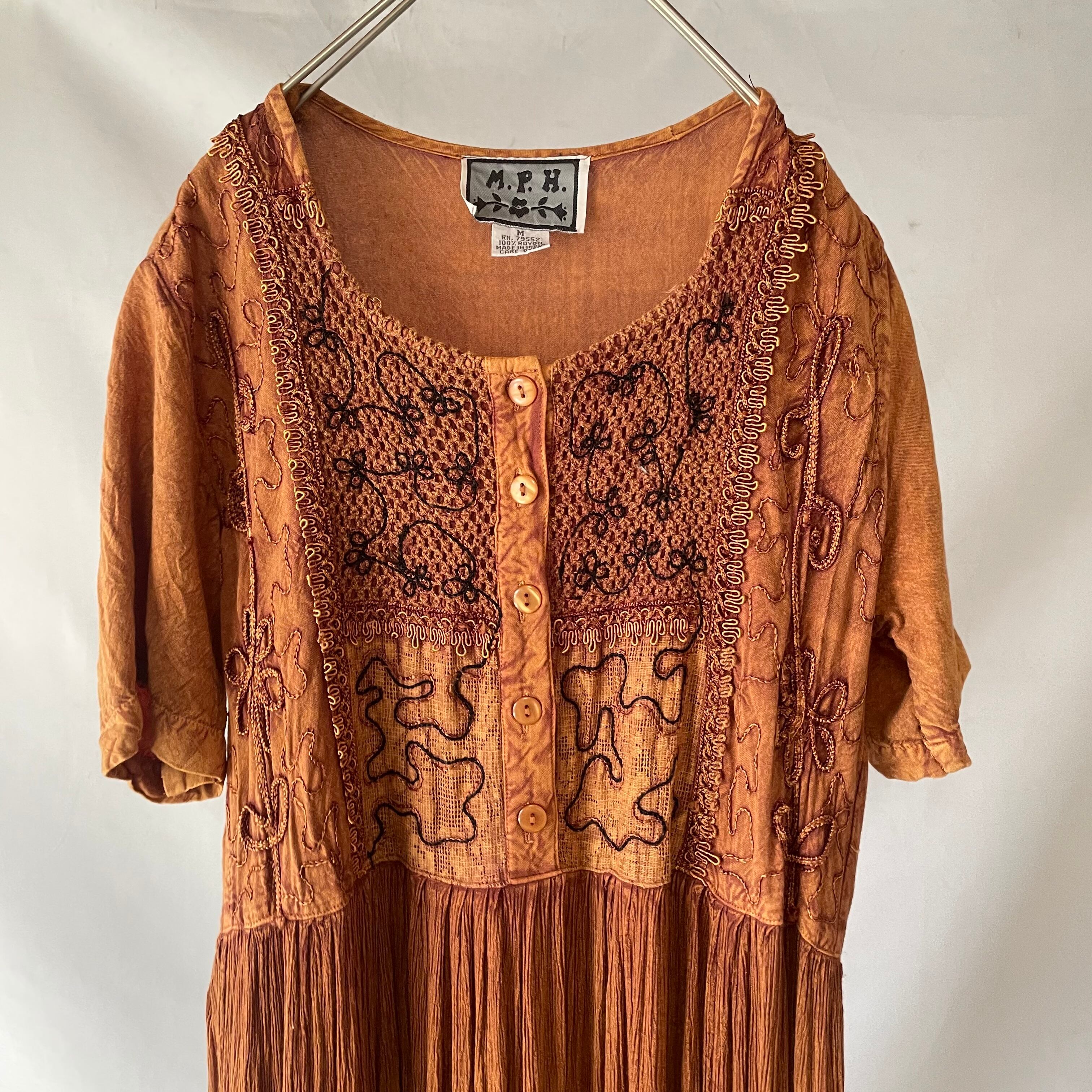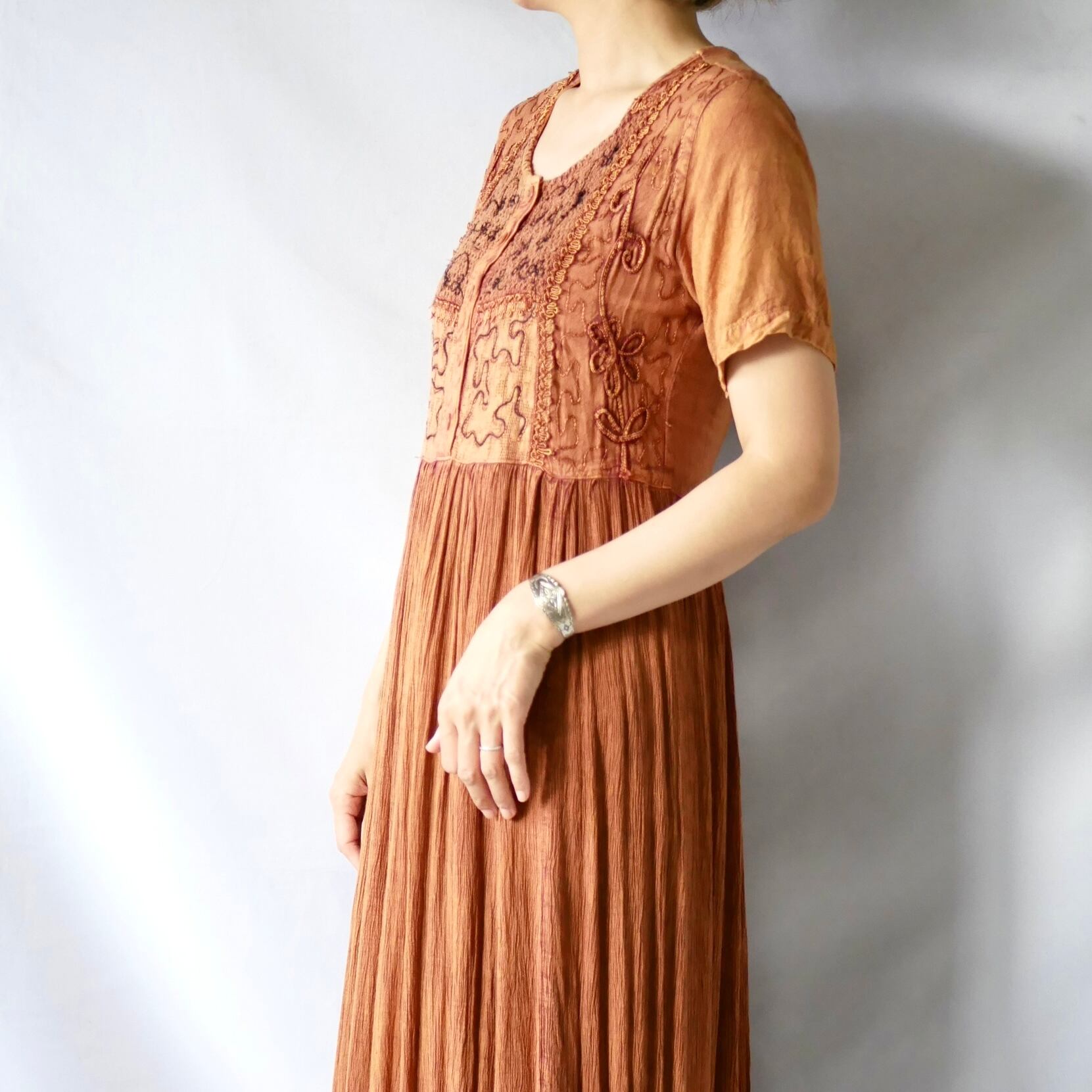 胸元の同系色刺繍が大人可愛い、80s頃のヴィンテージ ブラウン インドレーヨン 胸下切替 マキシ丈 半袖ワンピース です。