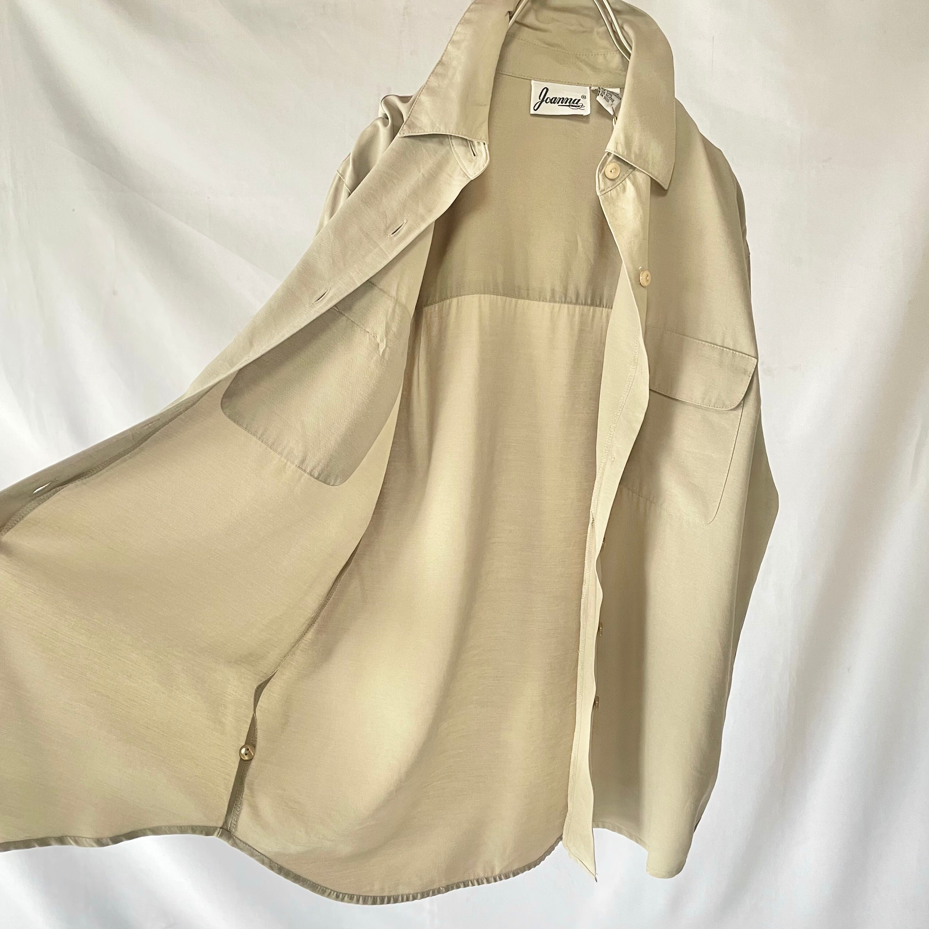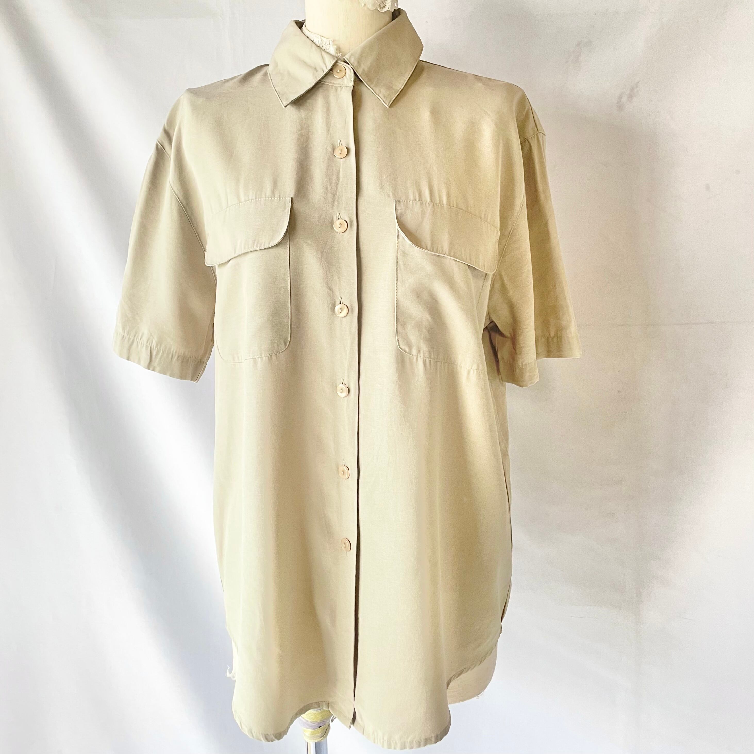 両胸にフラップポケット付きの、レーヨン100%ベージュ無地ヴィンテージ半袖シャツです。
