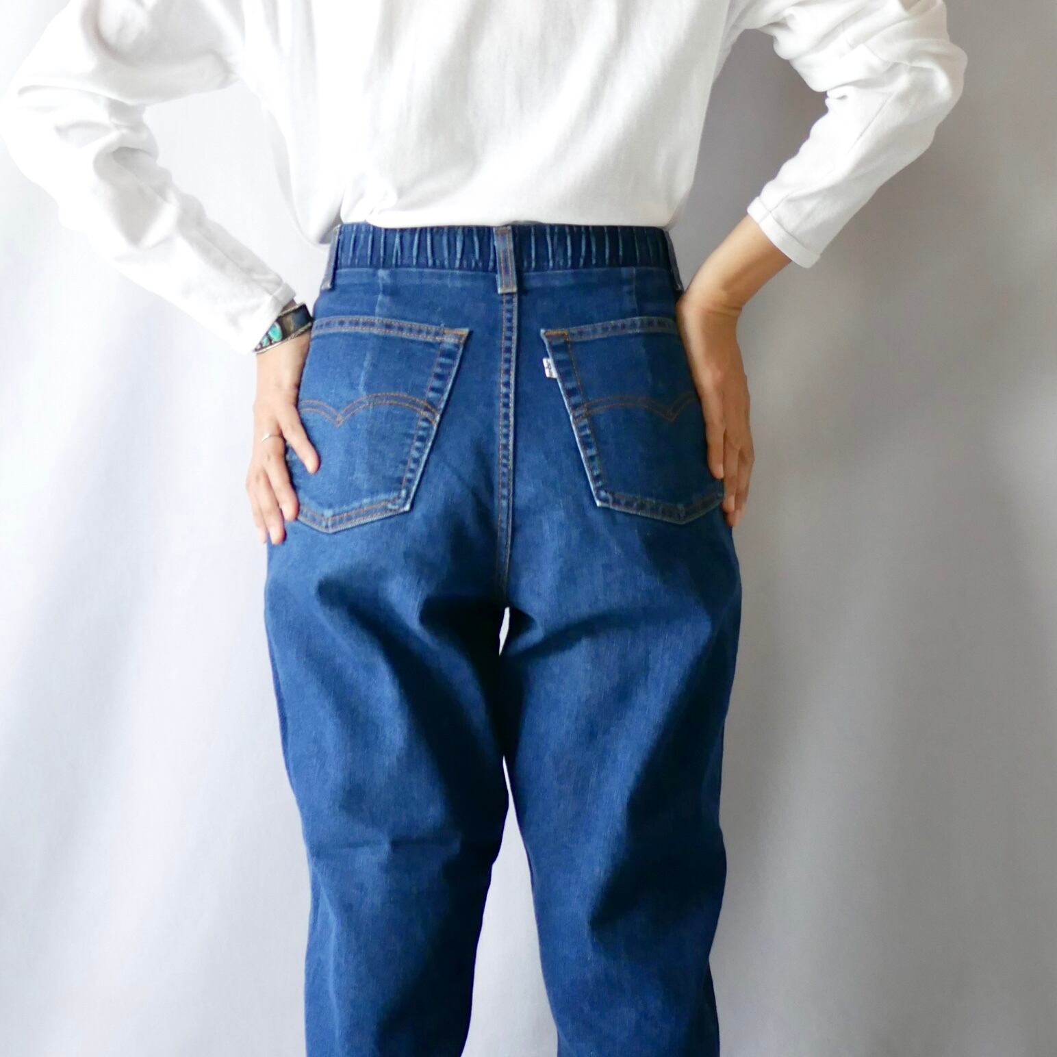 後ろウエストにゴム入りの女性らしいテーパードシルエットで、ゆったりしつつもすっきり履ける、90年代ヴィンテージ アメリカ製リーバイス 濃紺デニムパンツです。若干伸縮性のあるストレッチ混合と思われる素材です。
