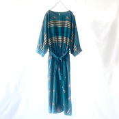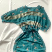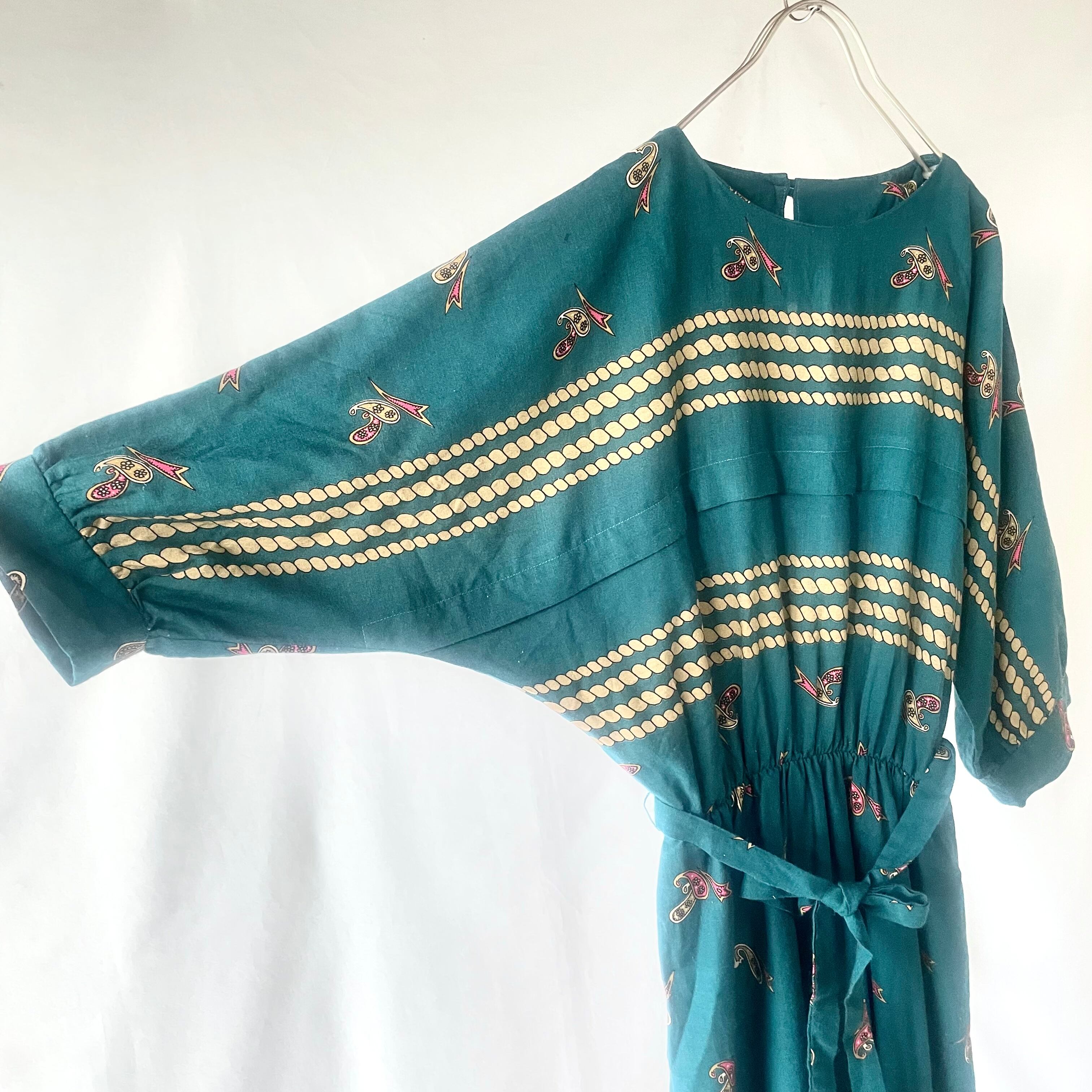 イラストの様な縄とペイズリー柄が素敵なカナダ製ダークグリーンドルマンスリーブ七分袖ワンピースです。
