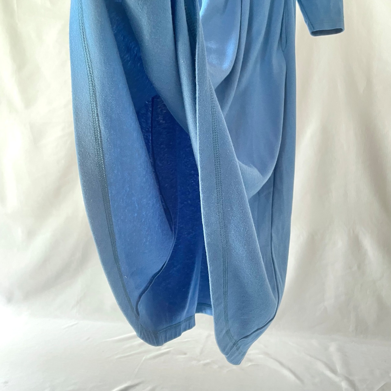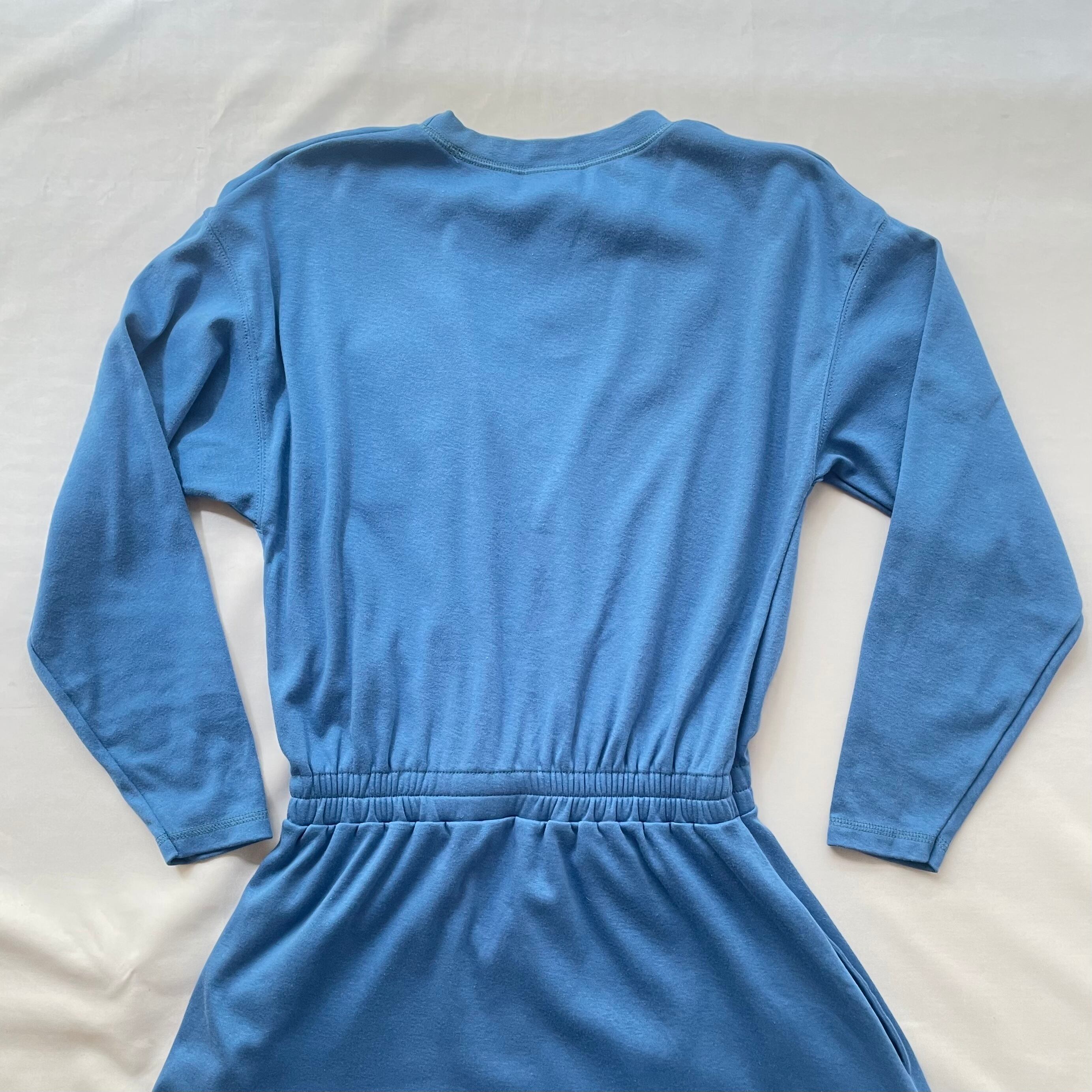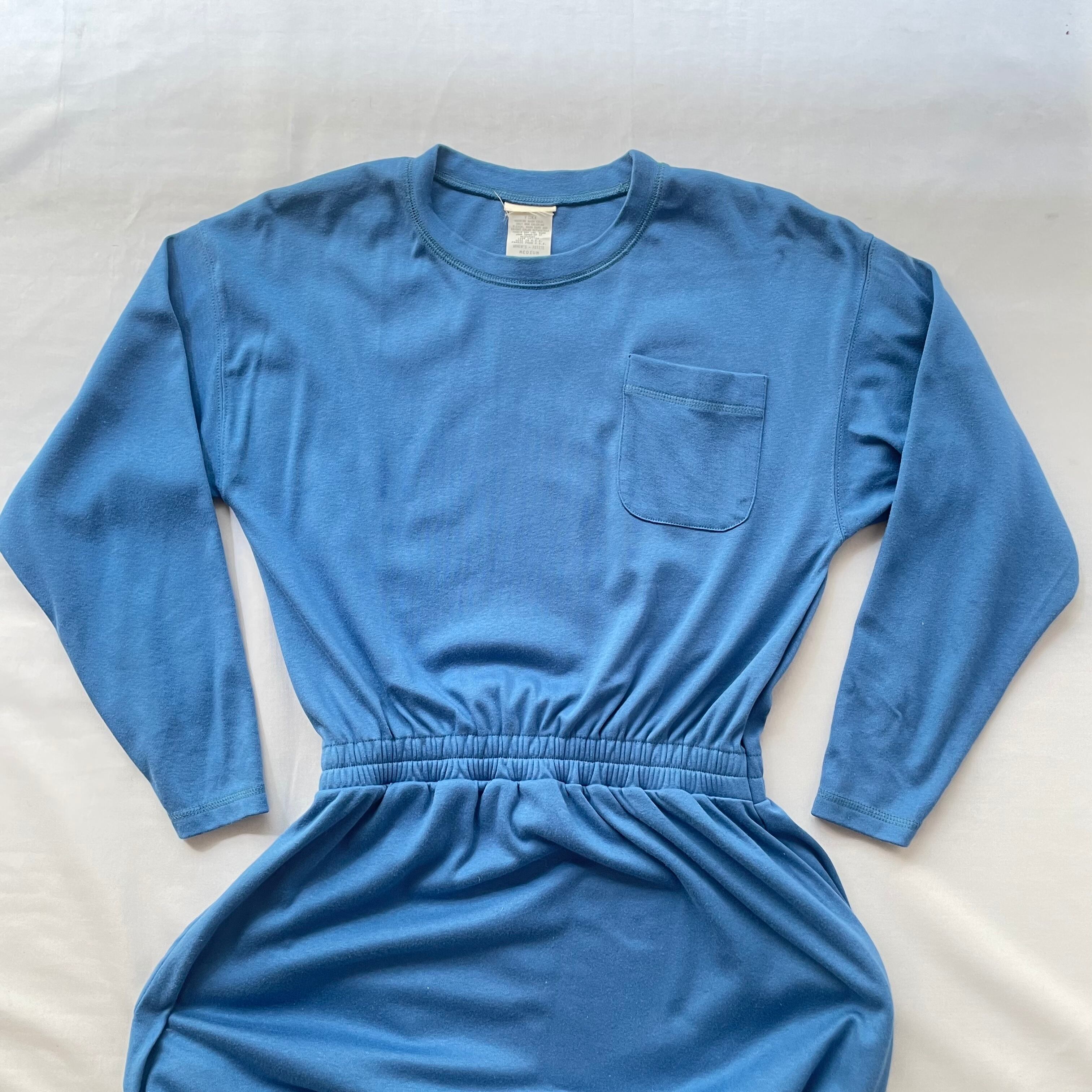 薄いスウェットの様な柔らかな厚手カットソー地のいつもいつまでも着られそうなシンプルデザインが良いアメリカ製胸ポケット付きウエストゴム入りワンピースです。ポケット付き