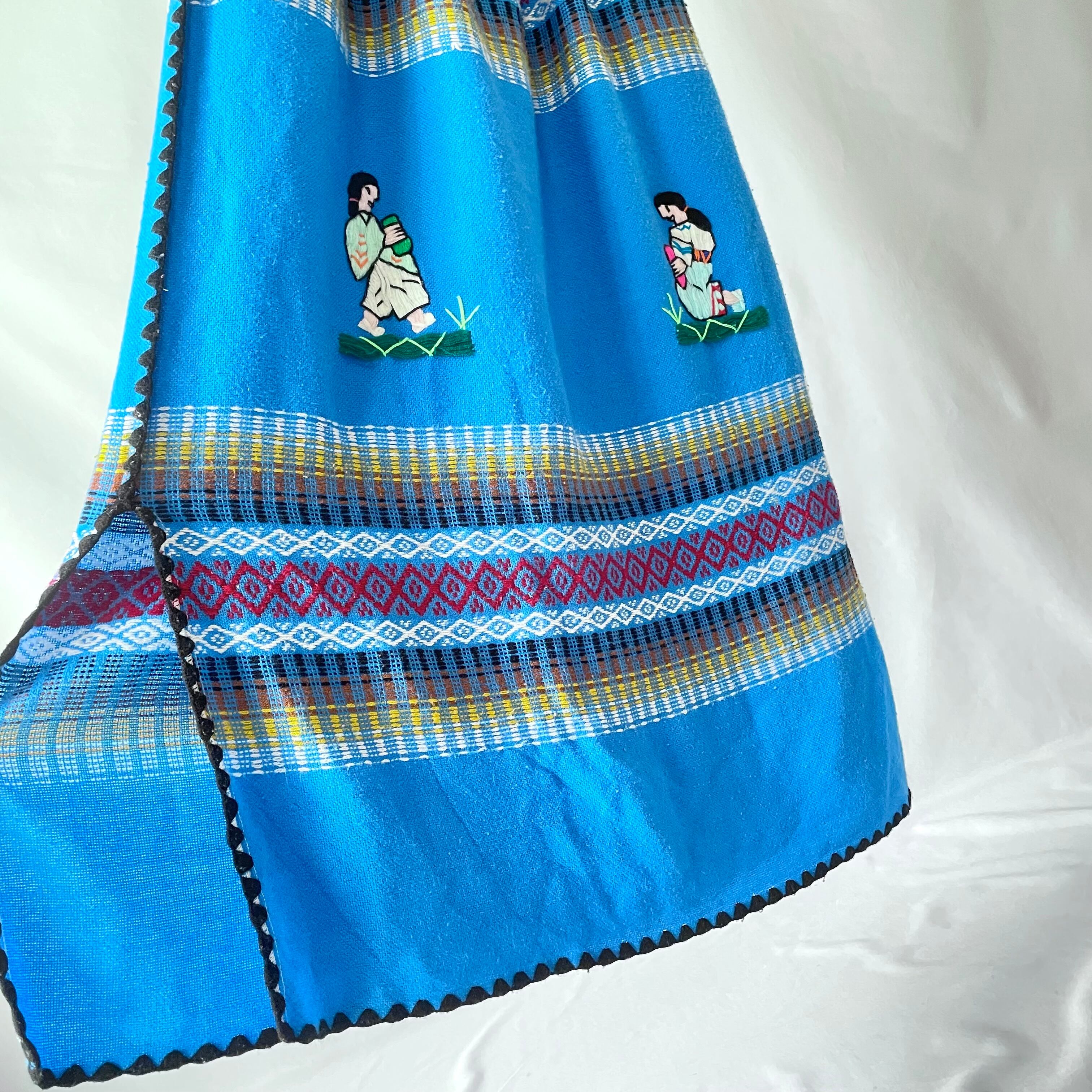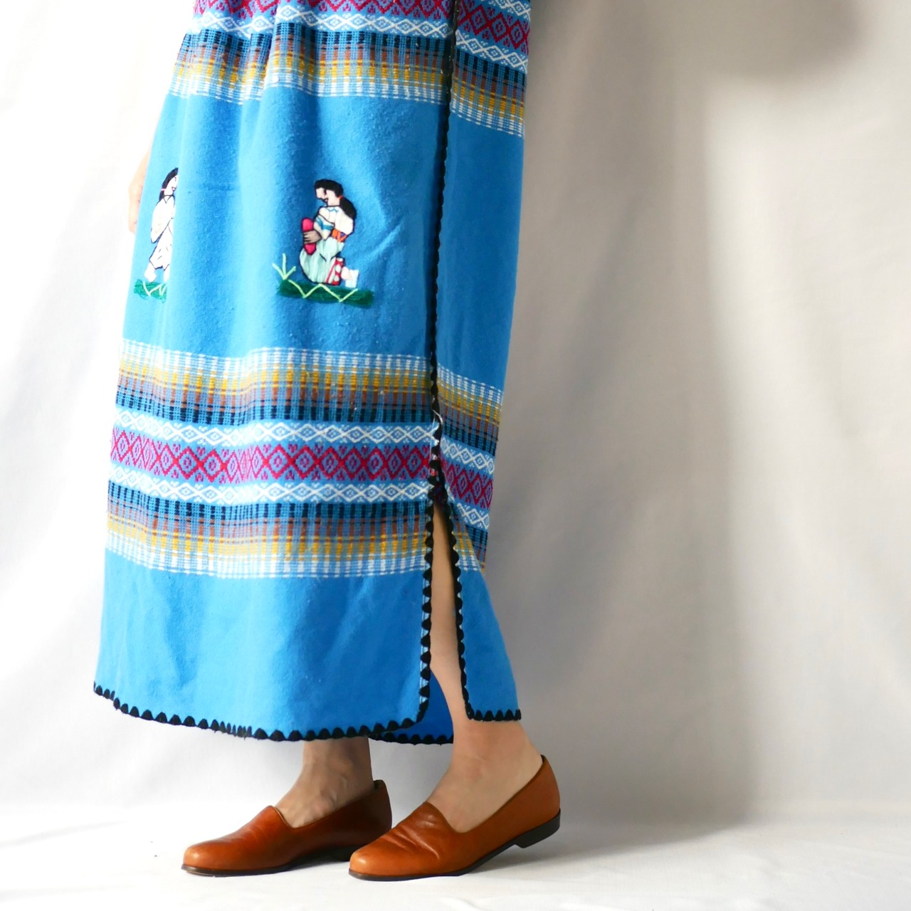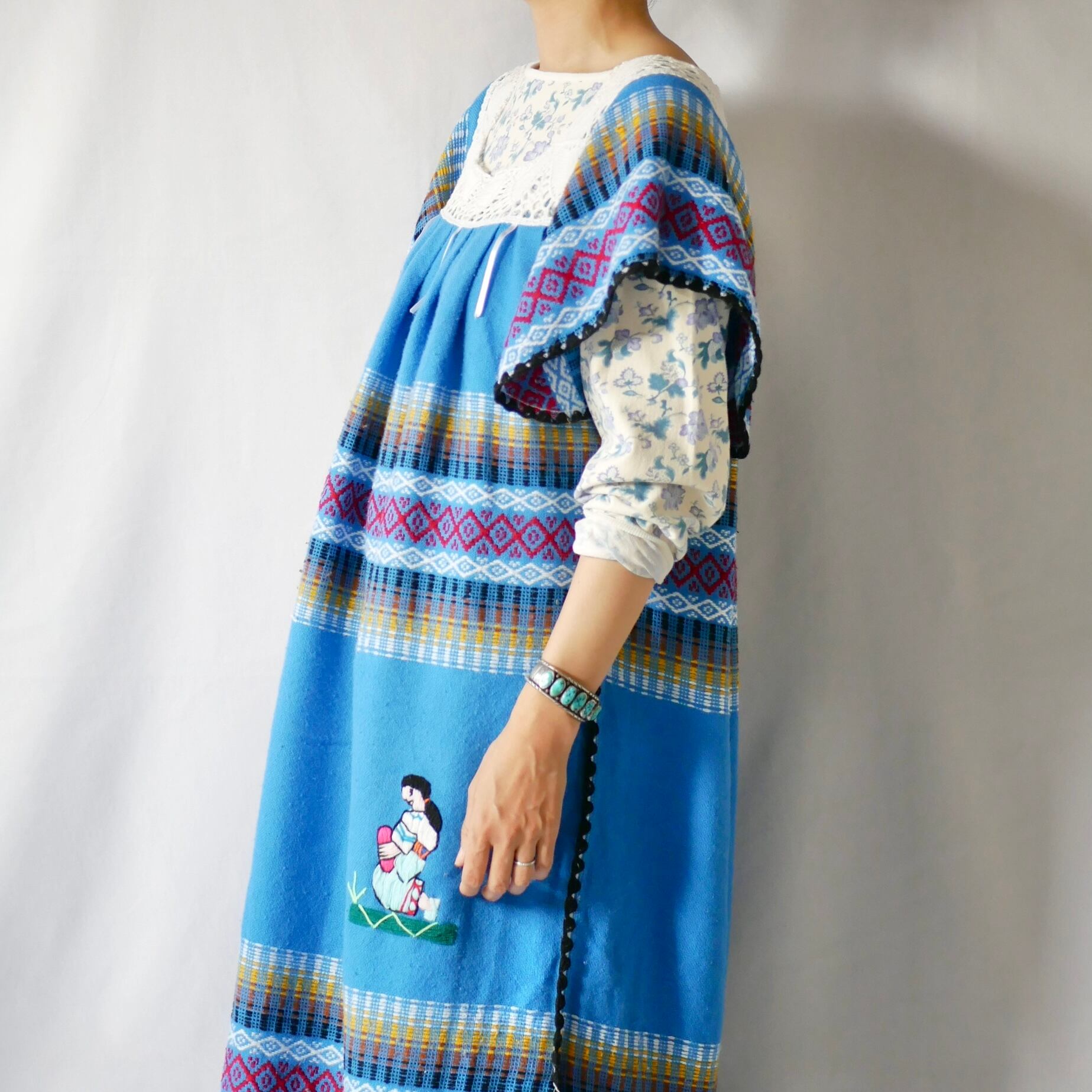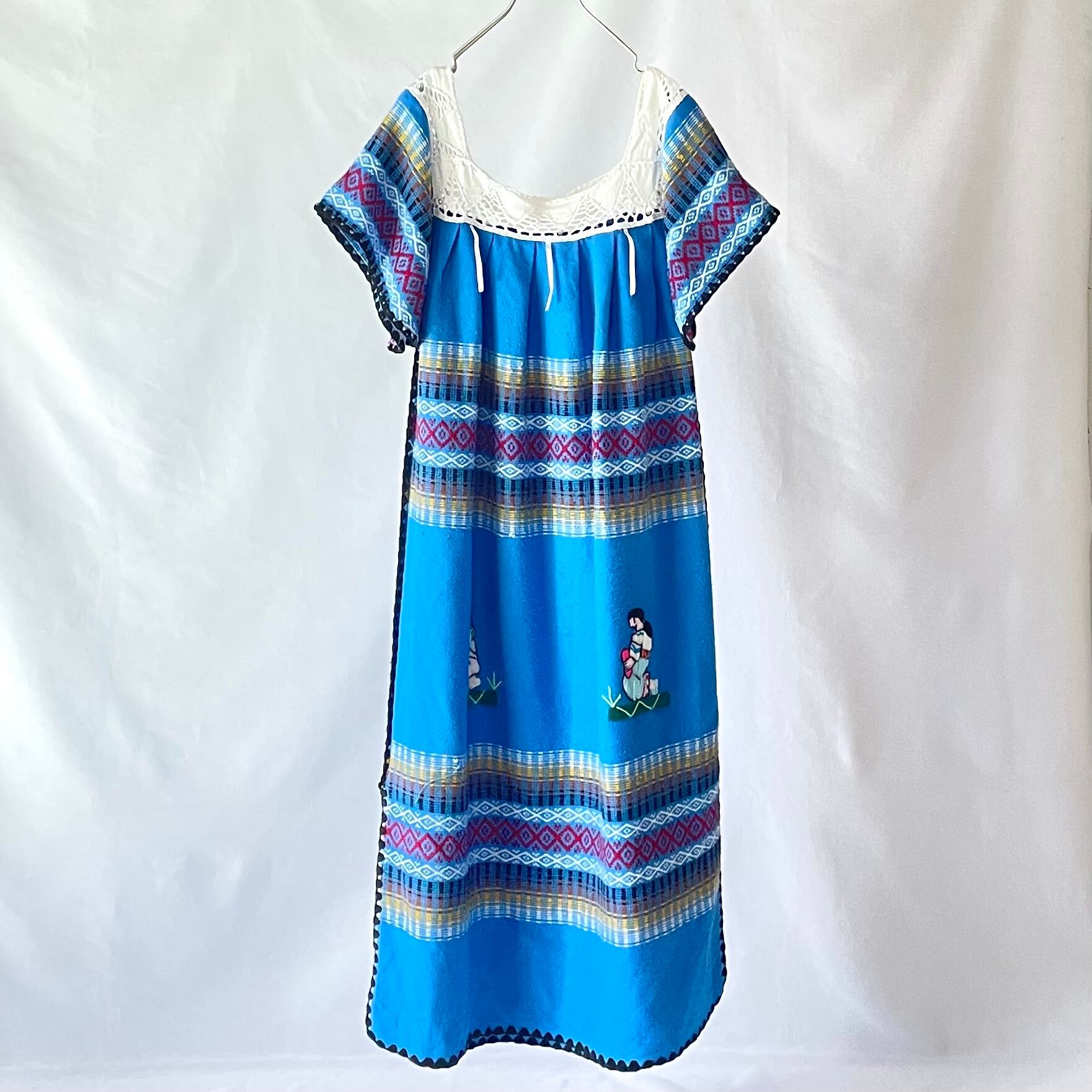 きれいなターコイズブルーに農作業人間などの刺繍が施されたエクアドル刺繍ワンピースです。
