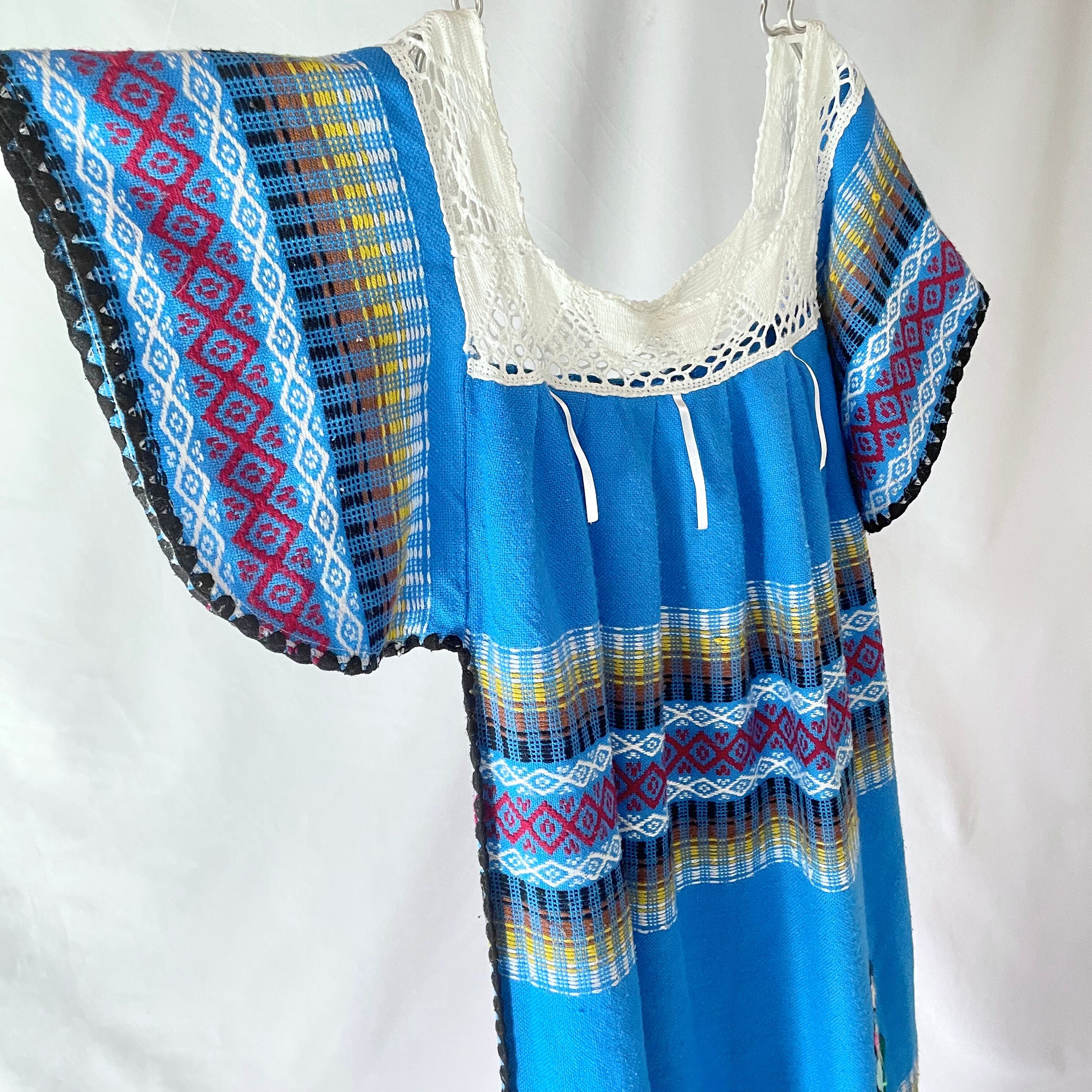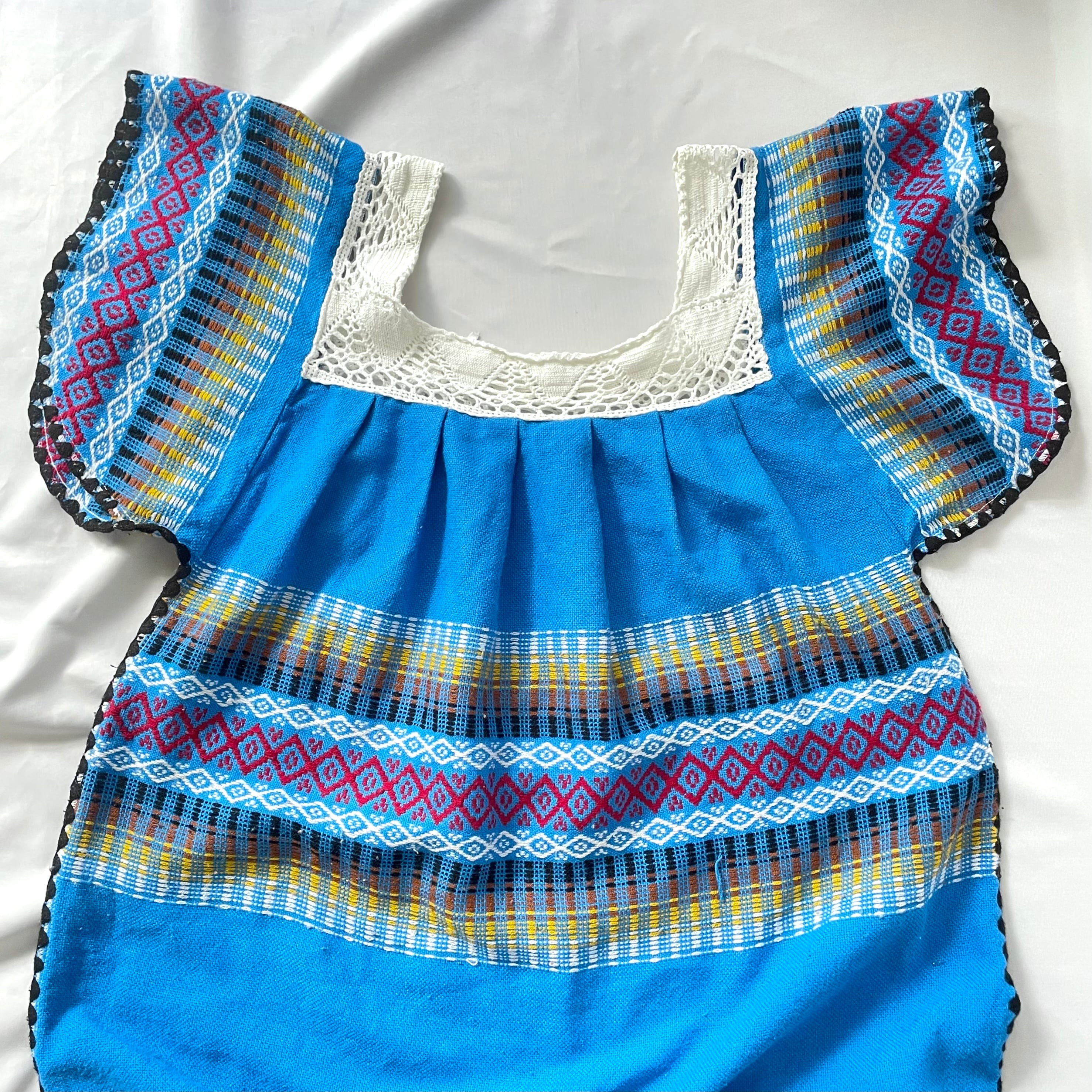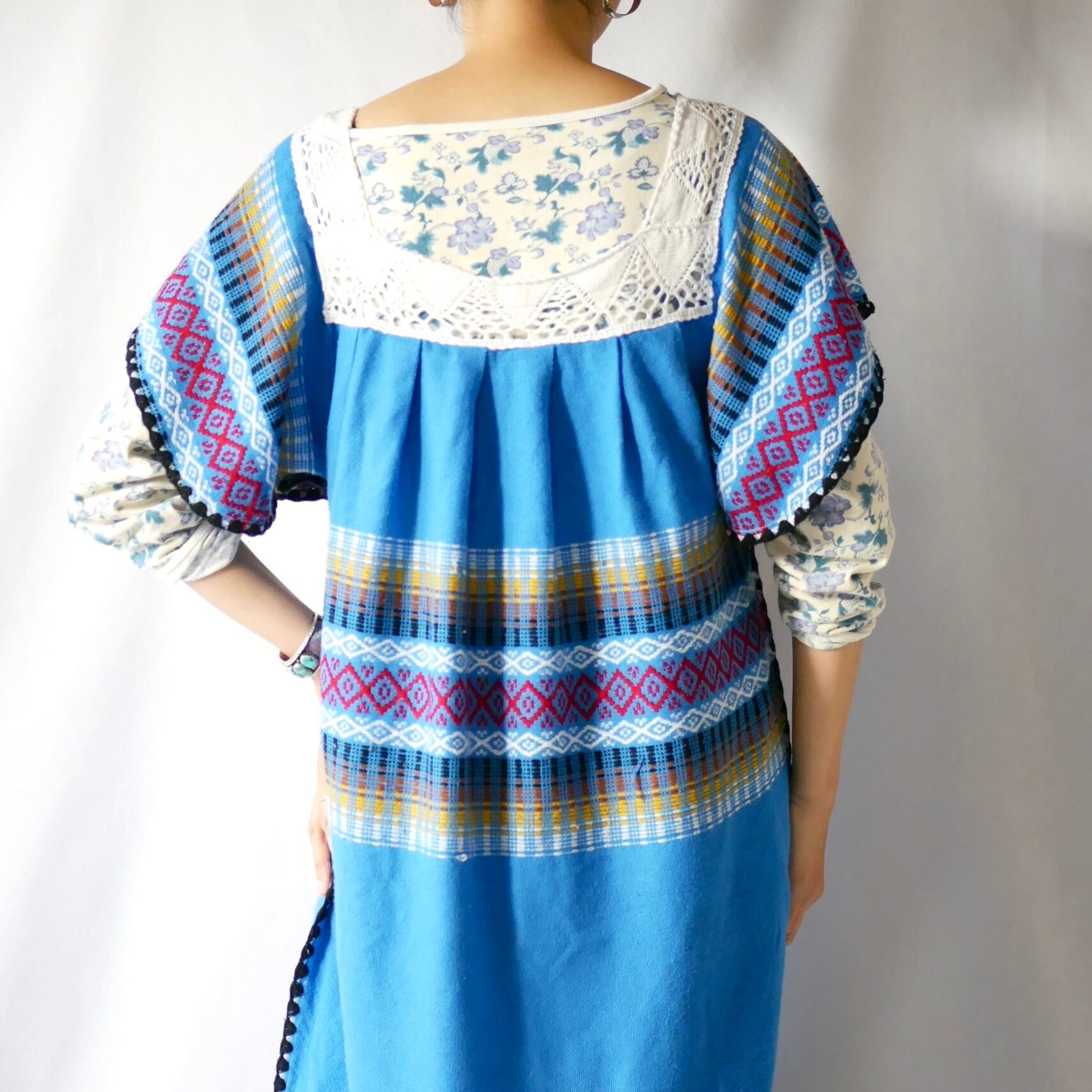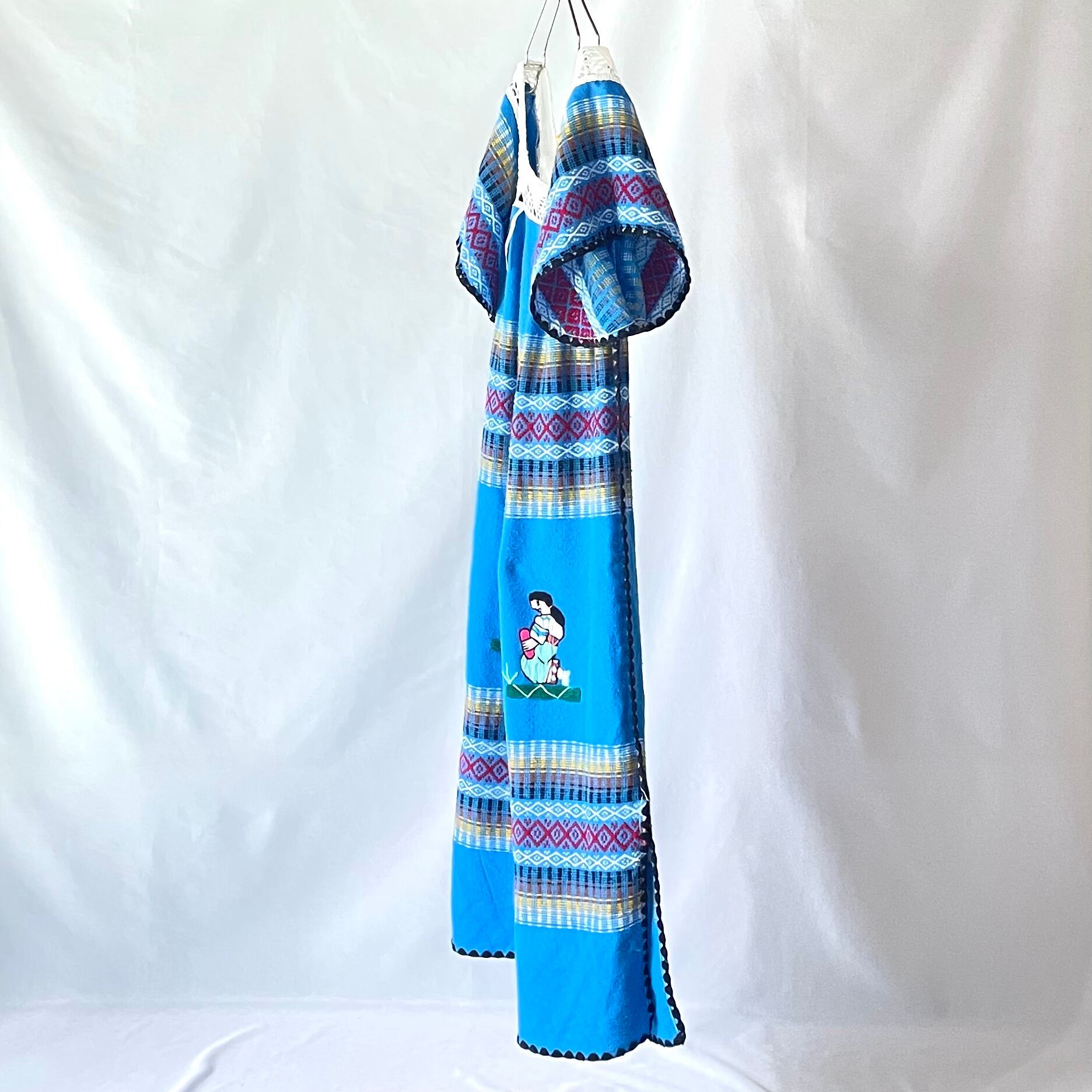きれいなターコイズブルーに農作業人間などの刺繍が施されたエクアドル刺繍ワンピースです。