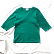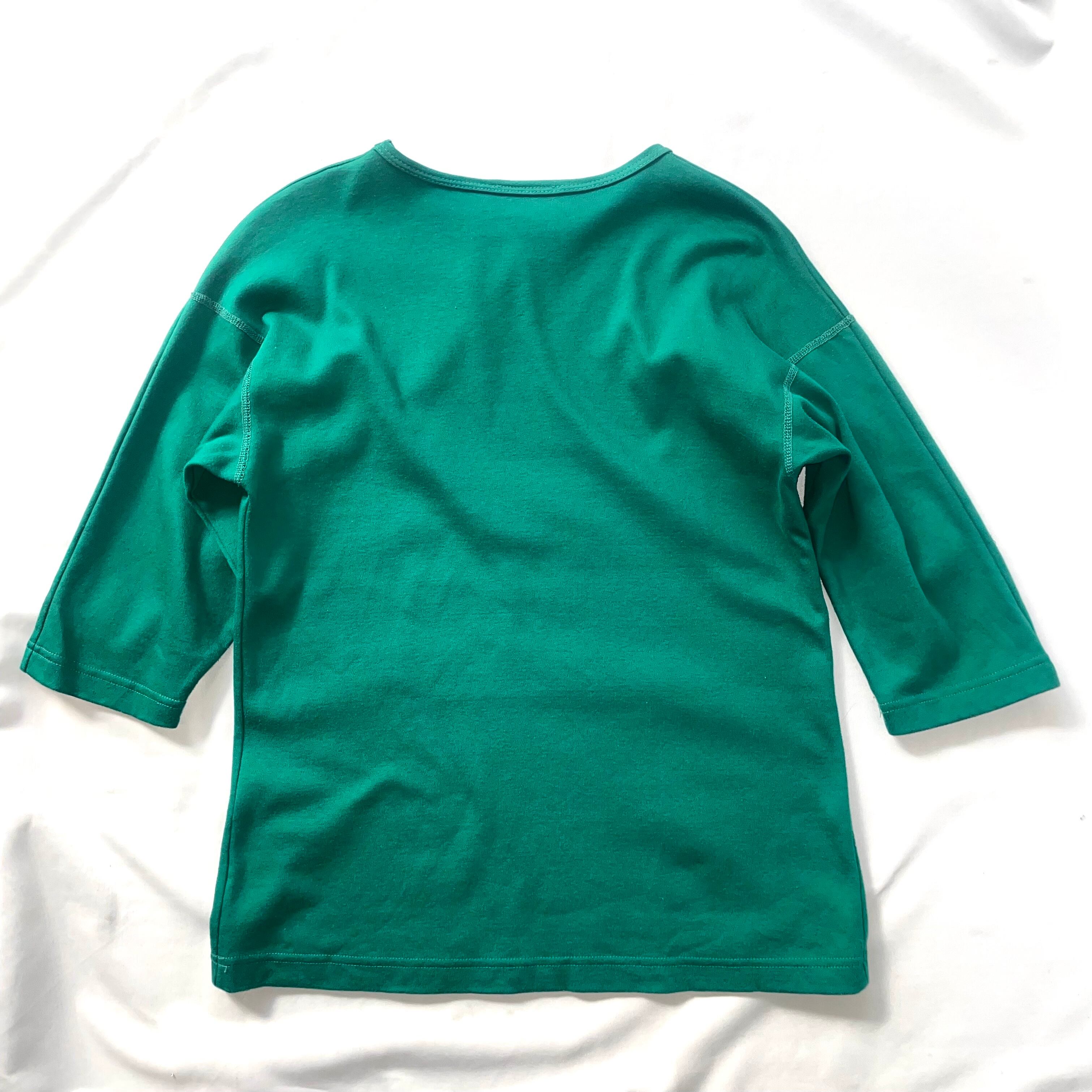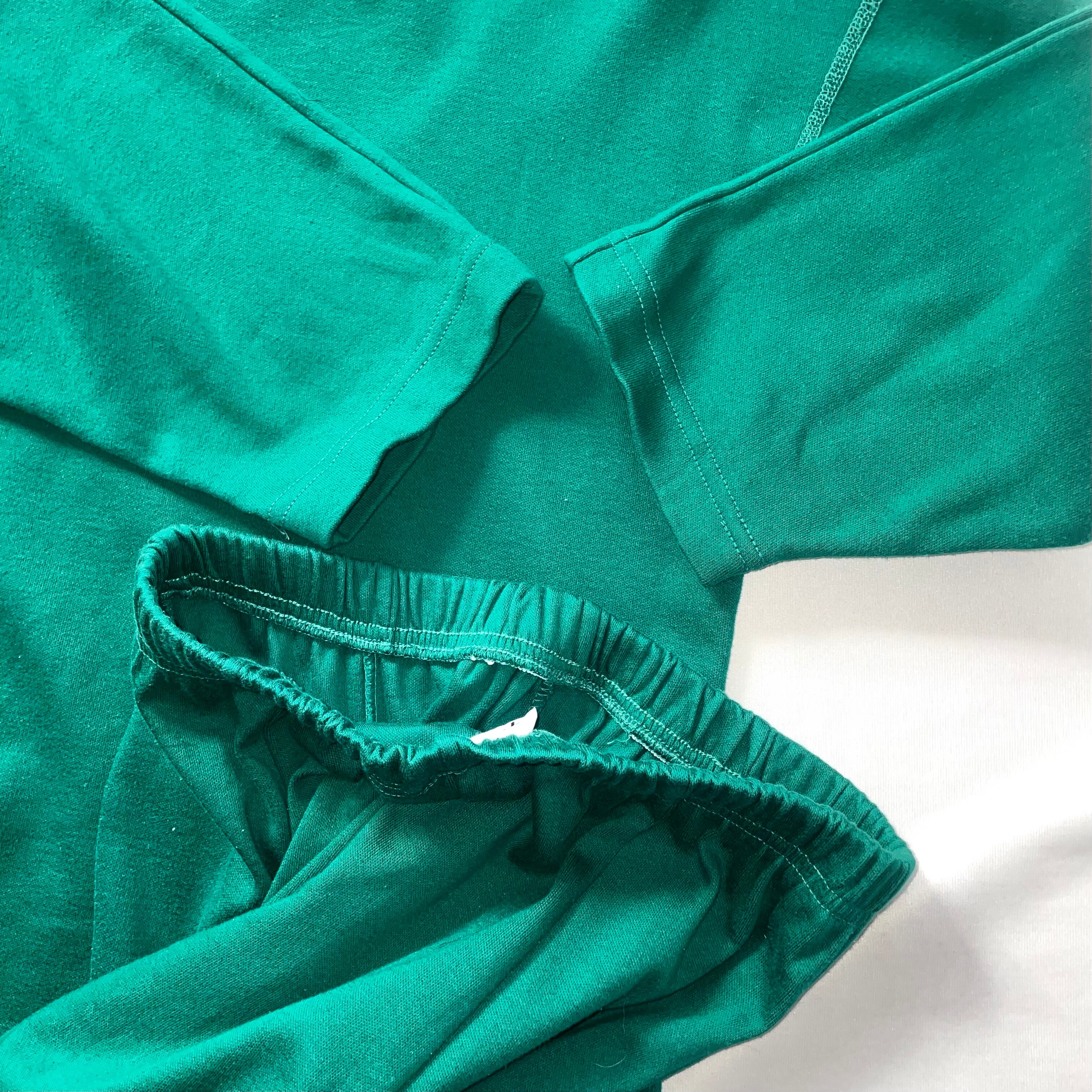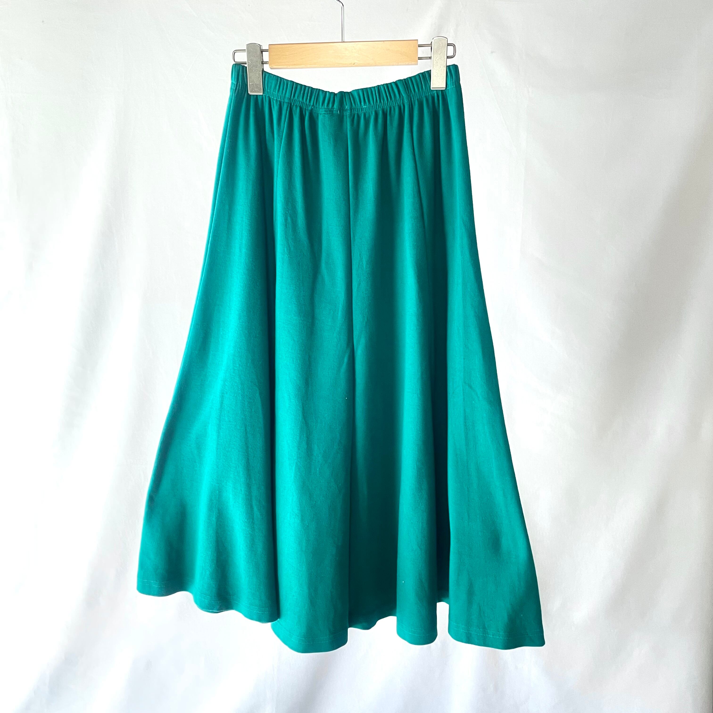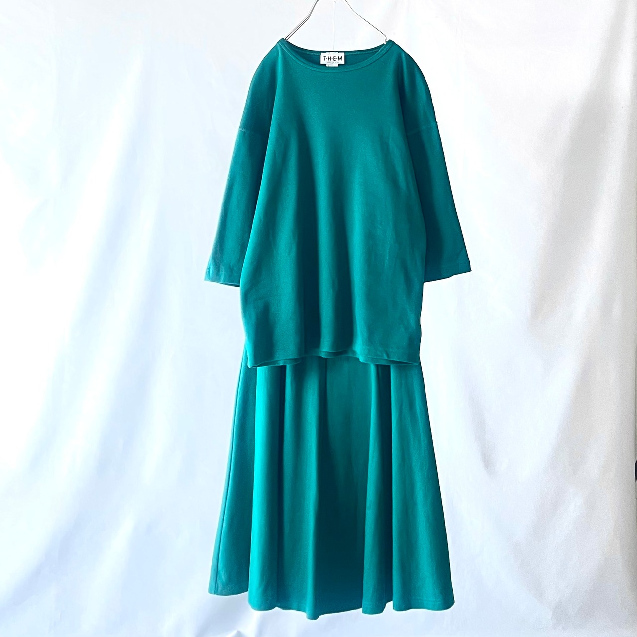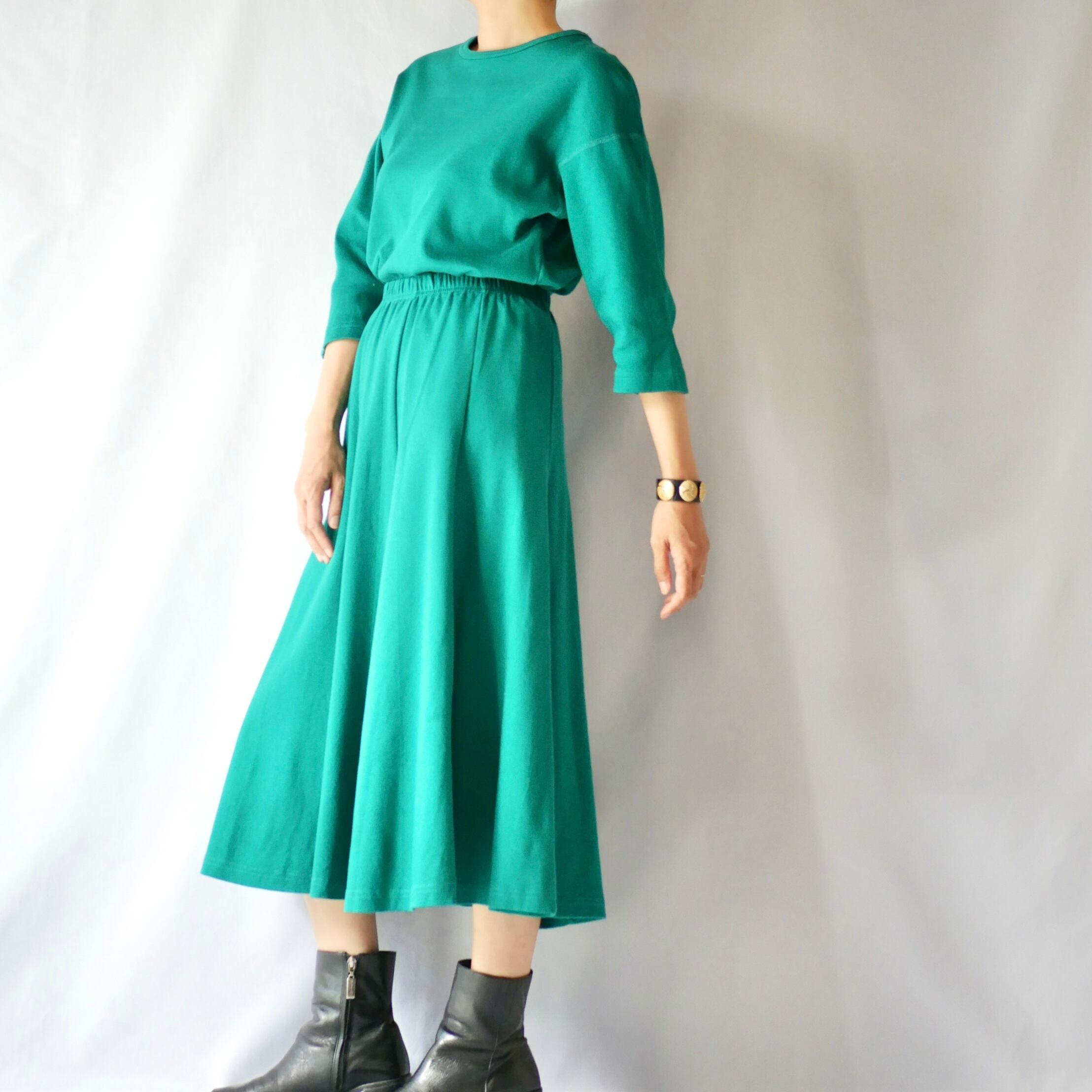 パキっとしつつ落ち着いたグリーンの薄手スウェットの様な生地感のアメリカ製七分袖トップス+フレアスカート セットアップです。コットン50%ポリエステル50%