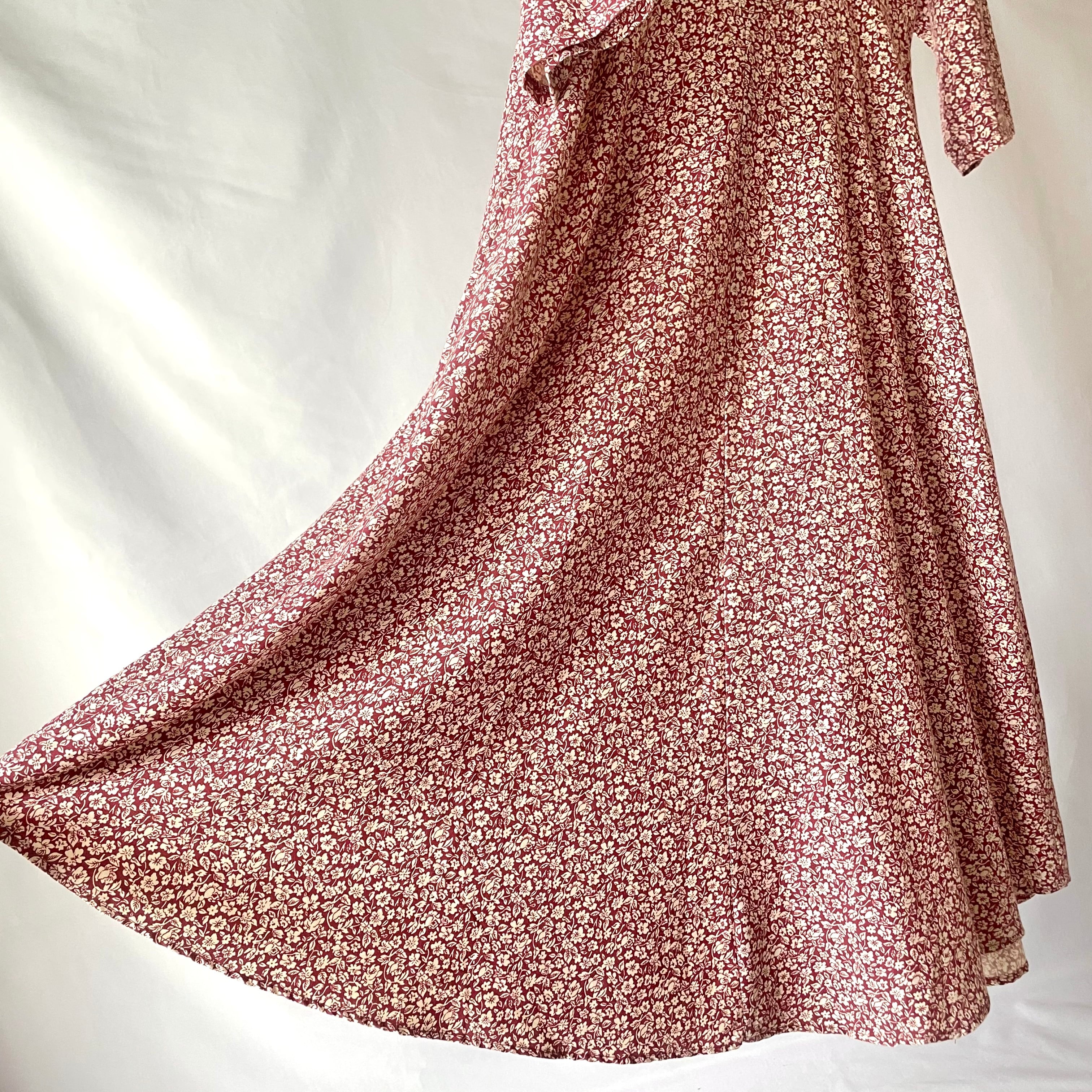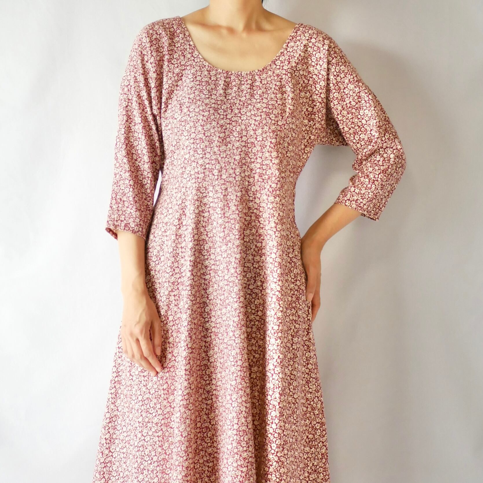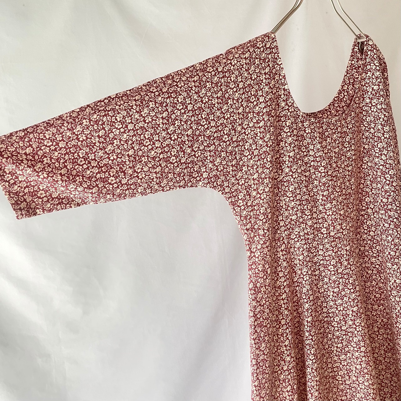 落ち着いたバーガンディー寄りの赤花柄レーヨンポリエステル50/50ドルマンスリーブ長袖ワンピースです。アメリカ製
