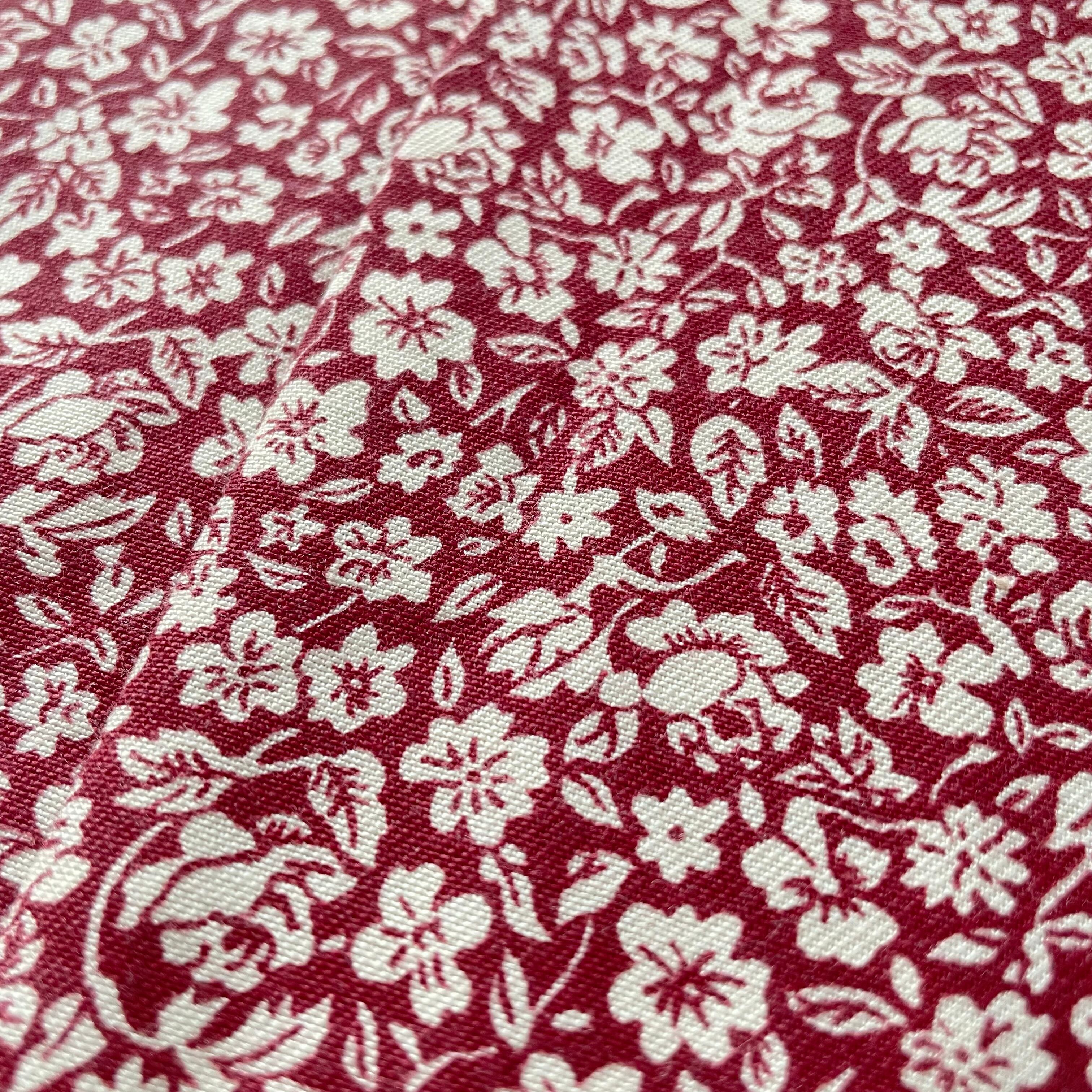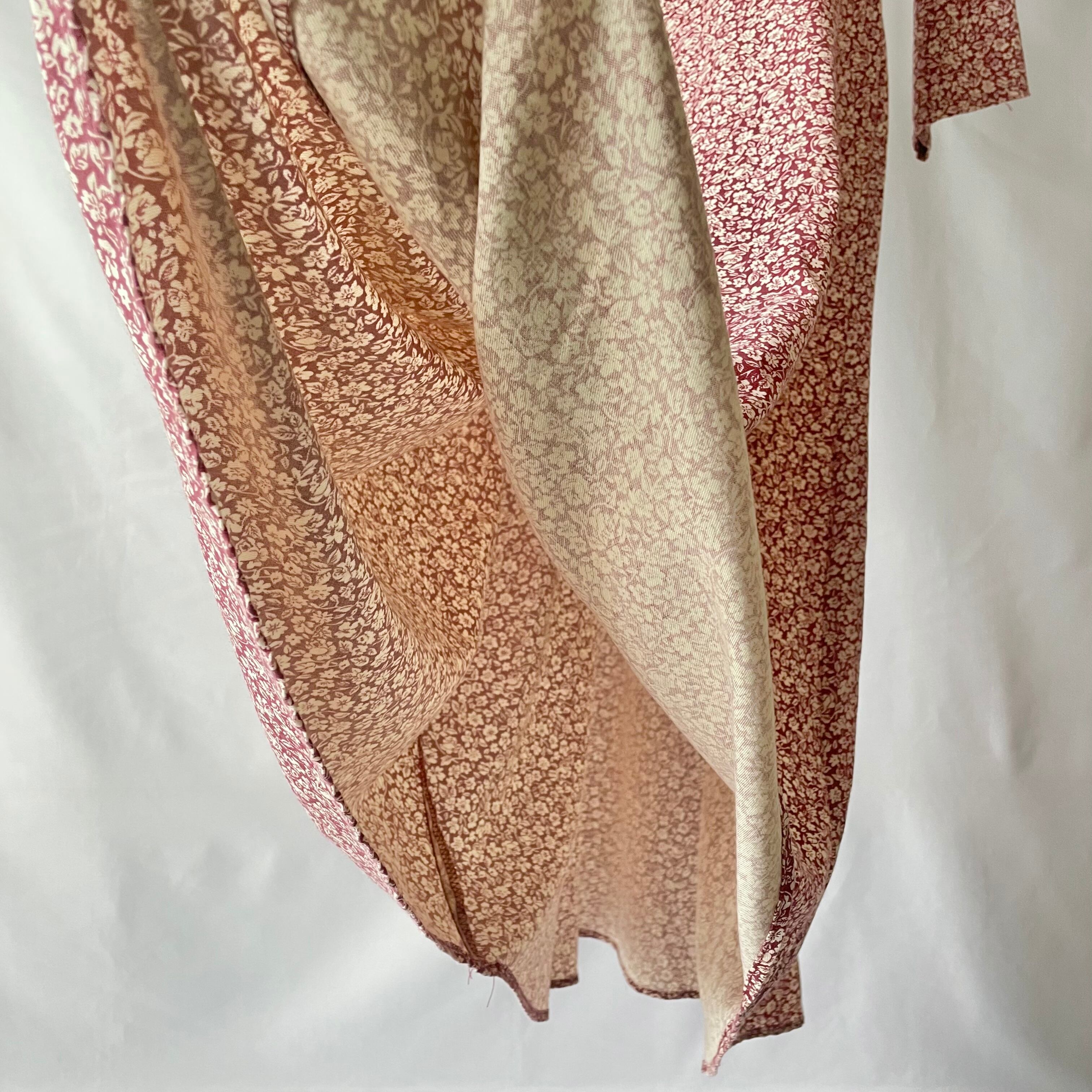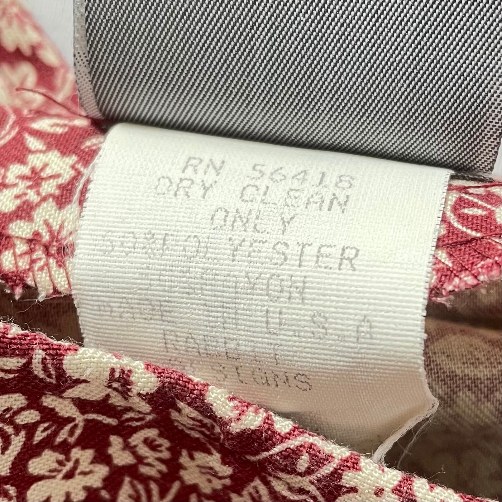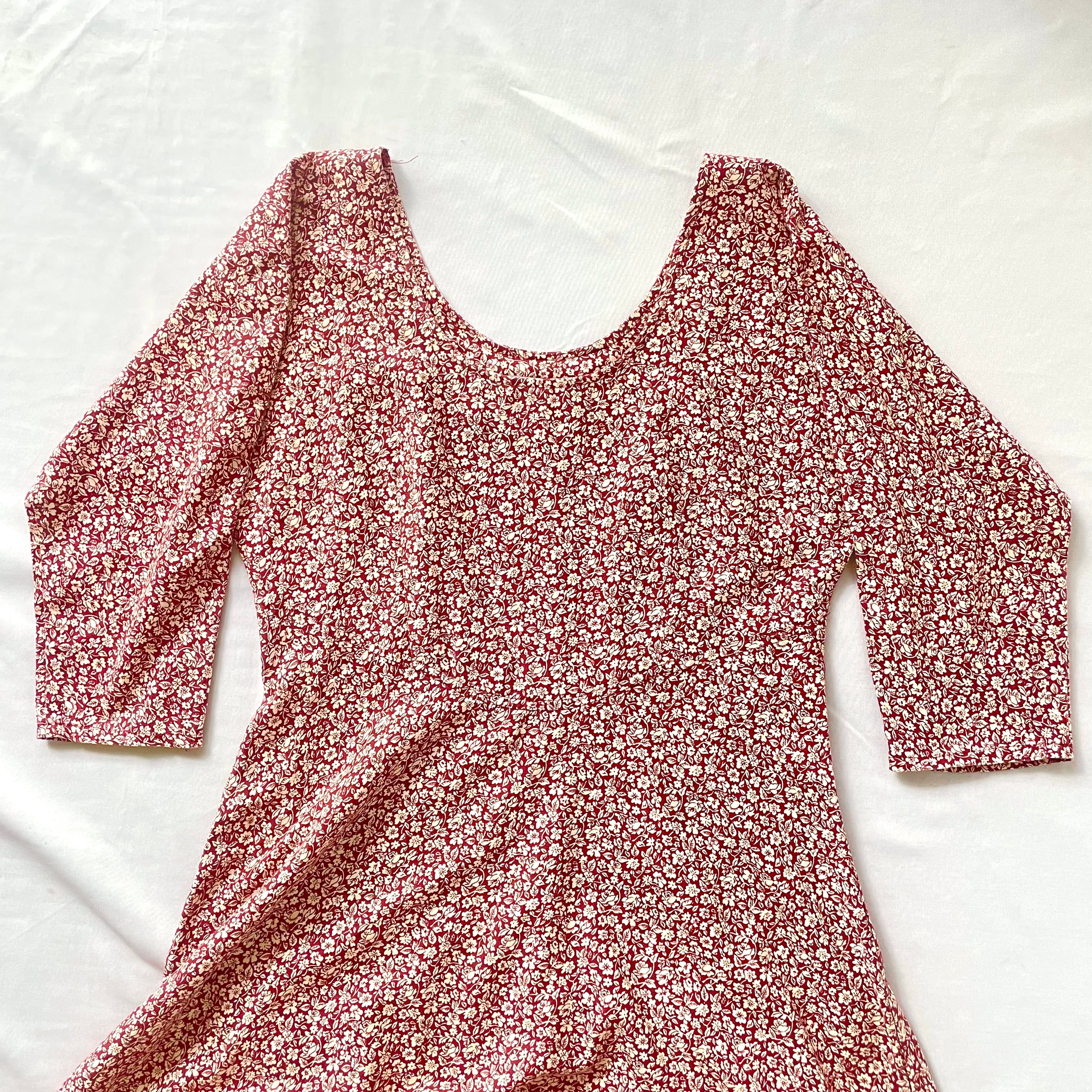 落ち着いたバーガンディー寄りの赤花柄レーヨンポリエステル50/50ドルマンスリーブ長袖ワンピースです。アメリカ製
