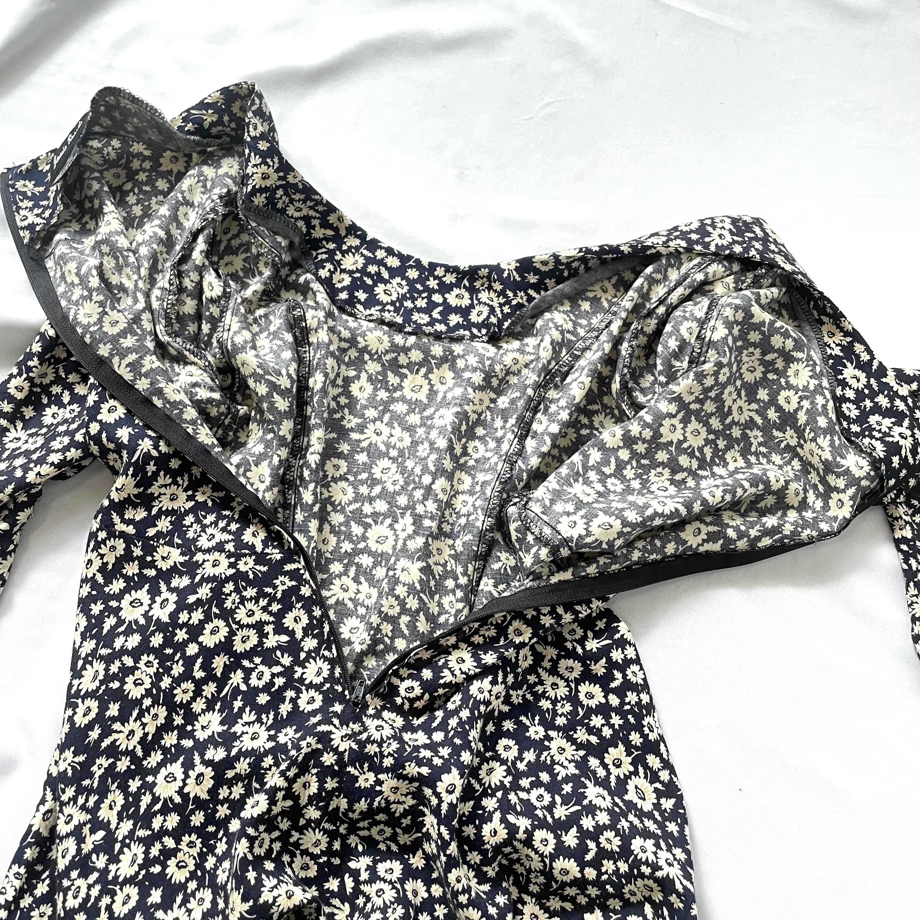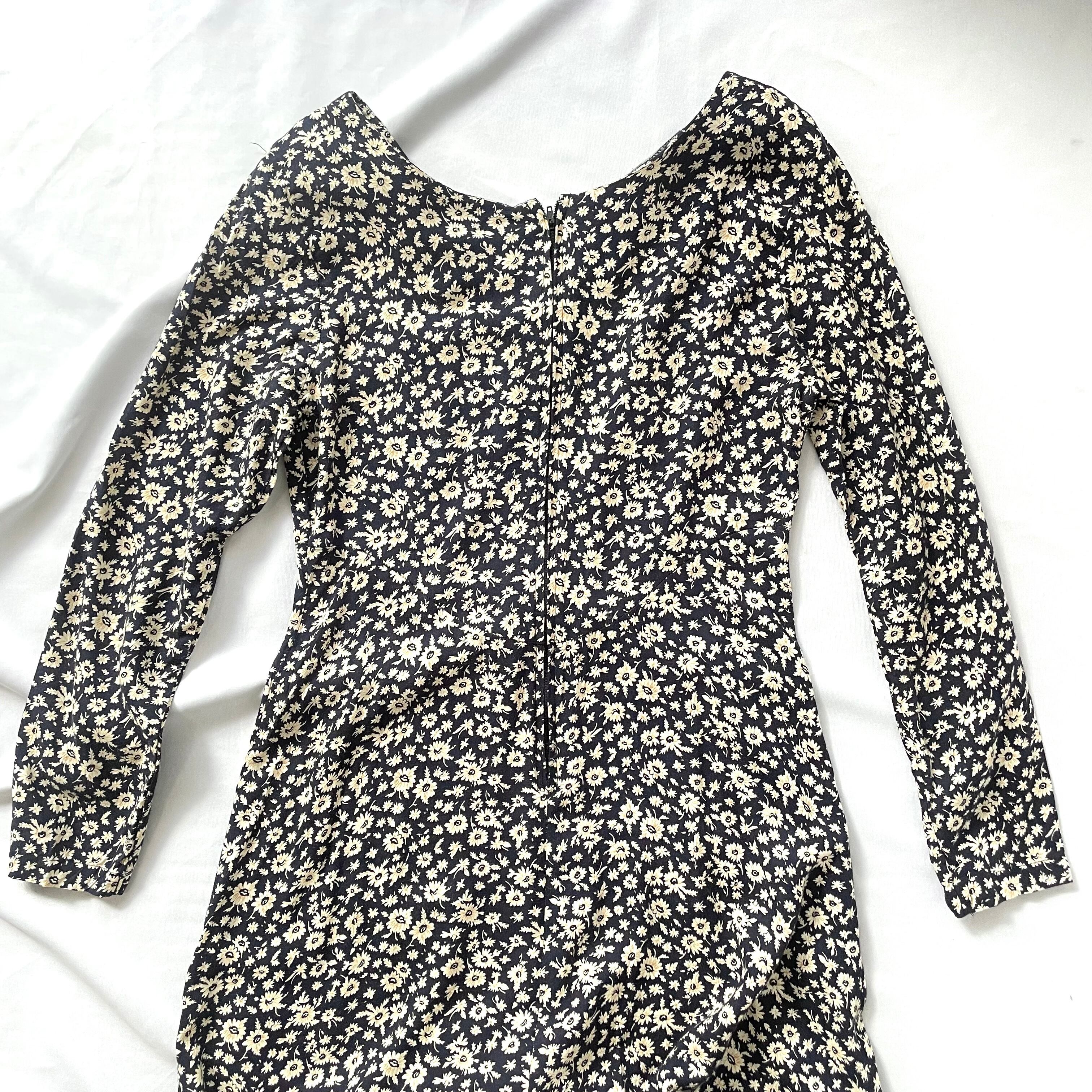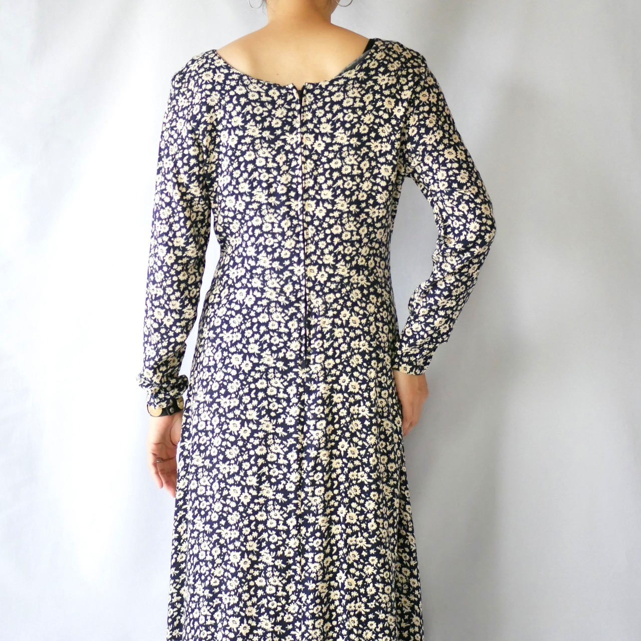 シンプルで大人可愛い黒花柄100%レーヨン マキシ丈 長袖ワンピースです。