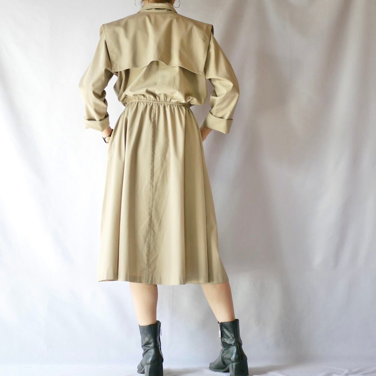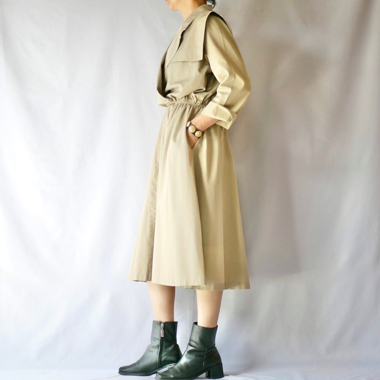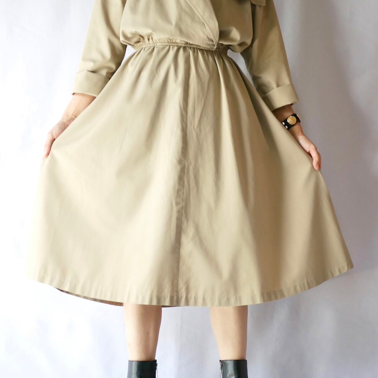 トレンチコート風デザインがかわいい、ベージュのフレアシルエットワンピースです。