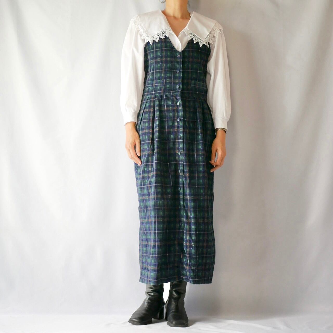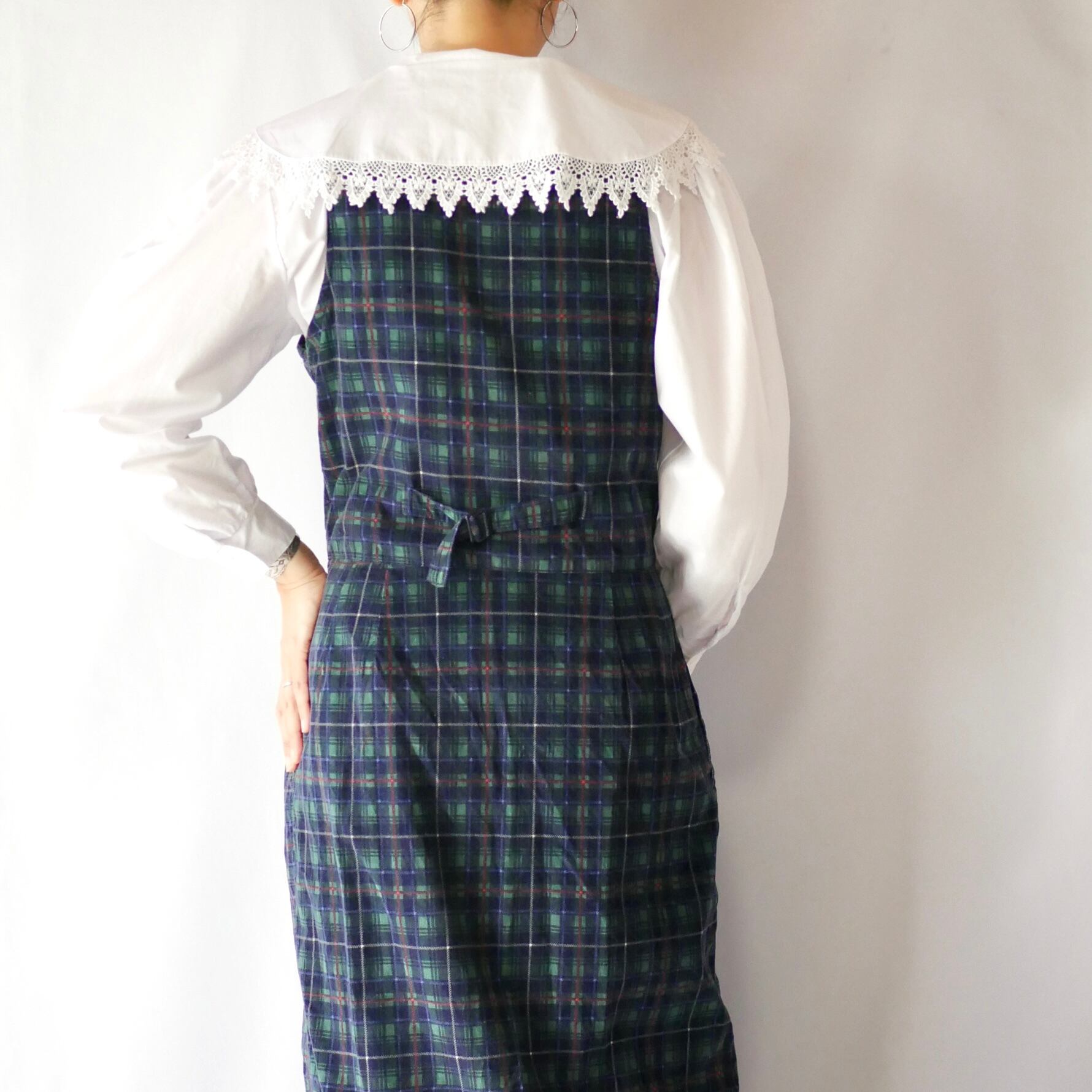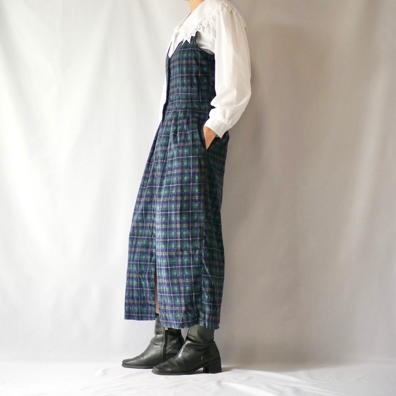 Navy green plaid pattern onepiece タータンチェックコーディロイマキシワンピース