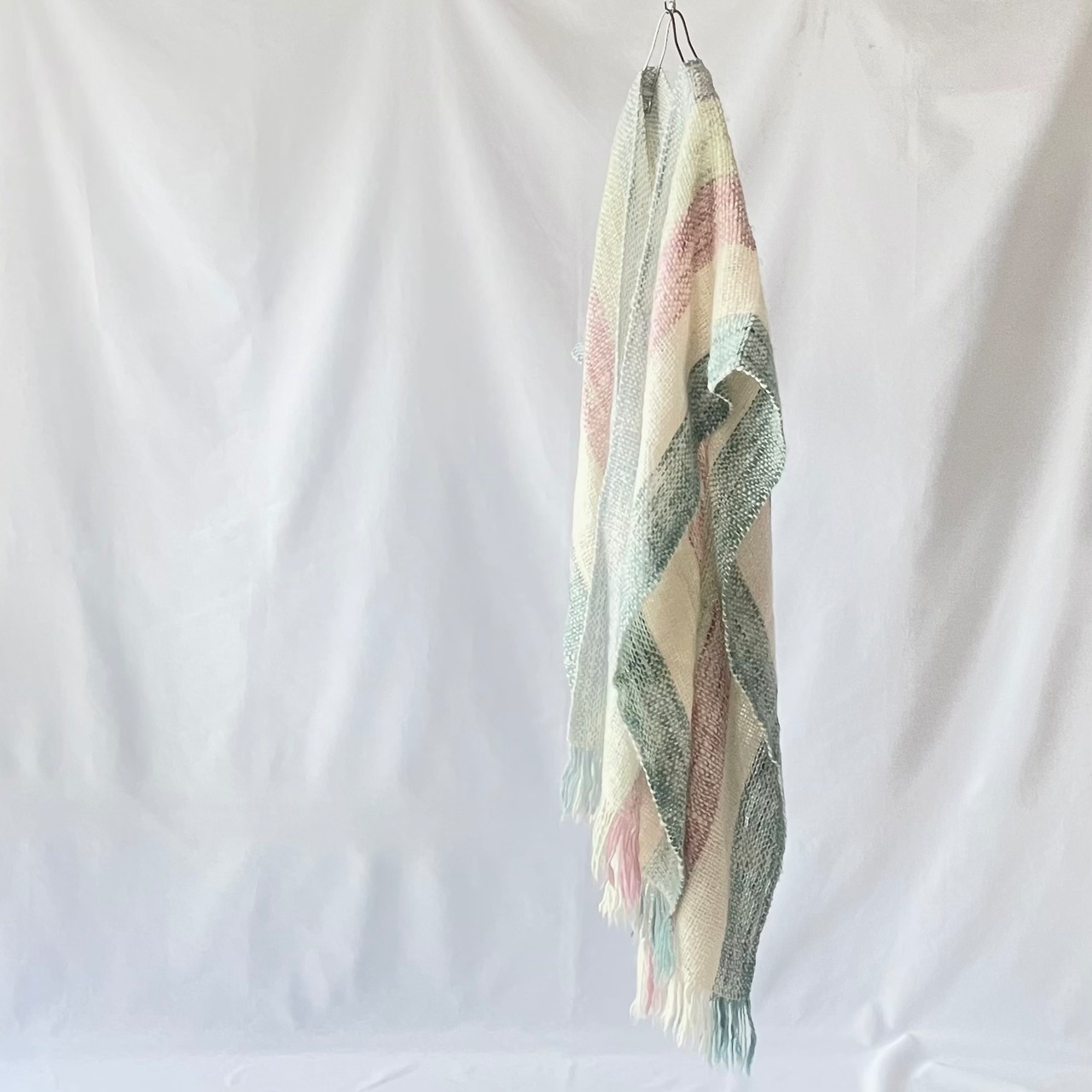淡い柔らかな色合いで、ウルグアイ産の高品質な素材が使用されたハンドメイドのパステルカラーストライプ柄ロングケープコートです。