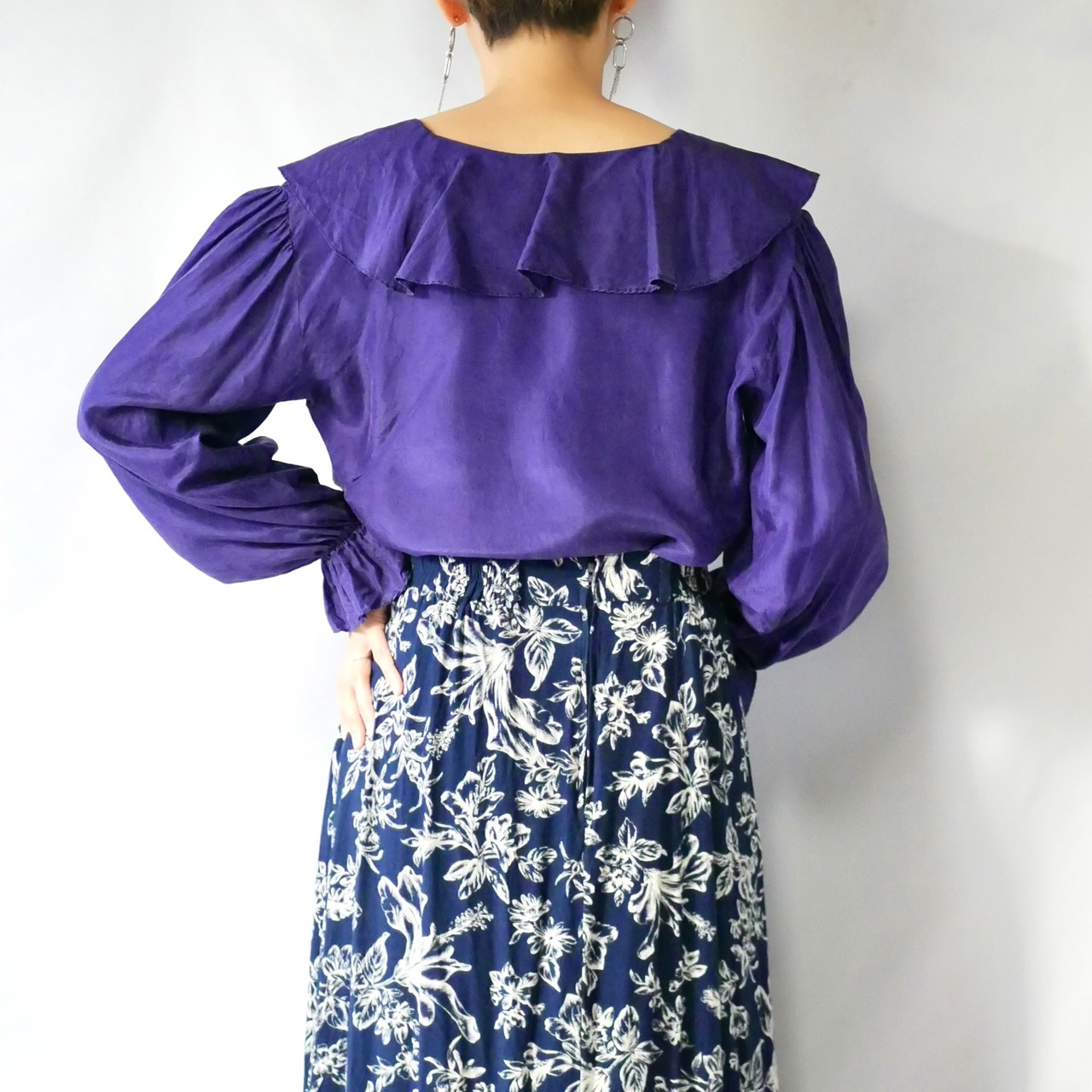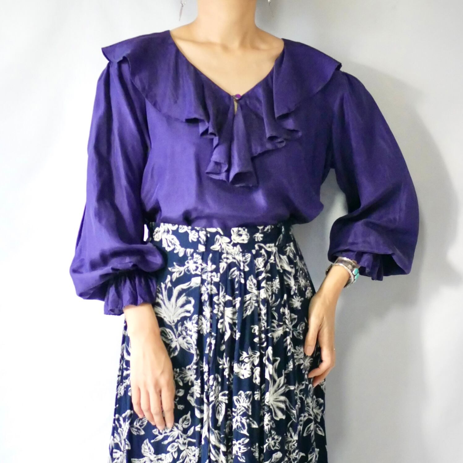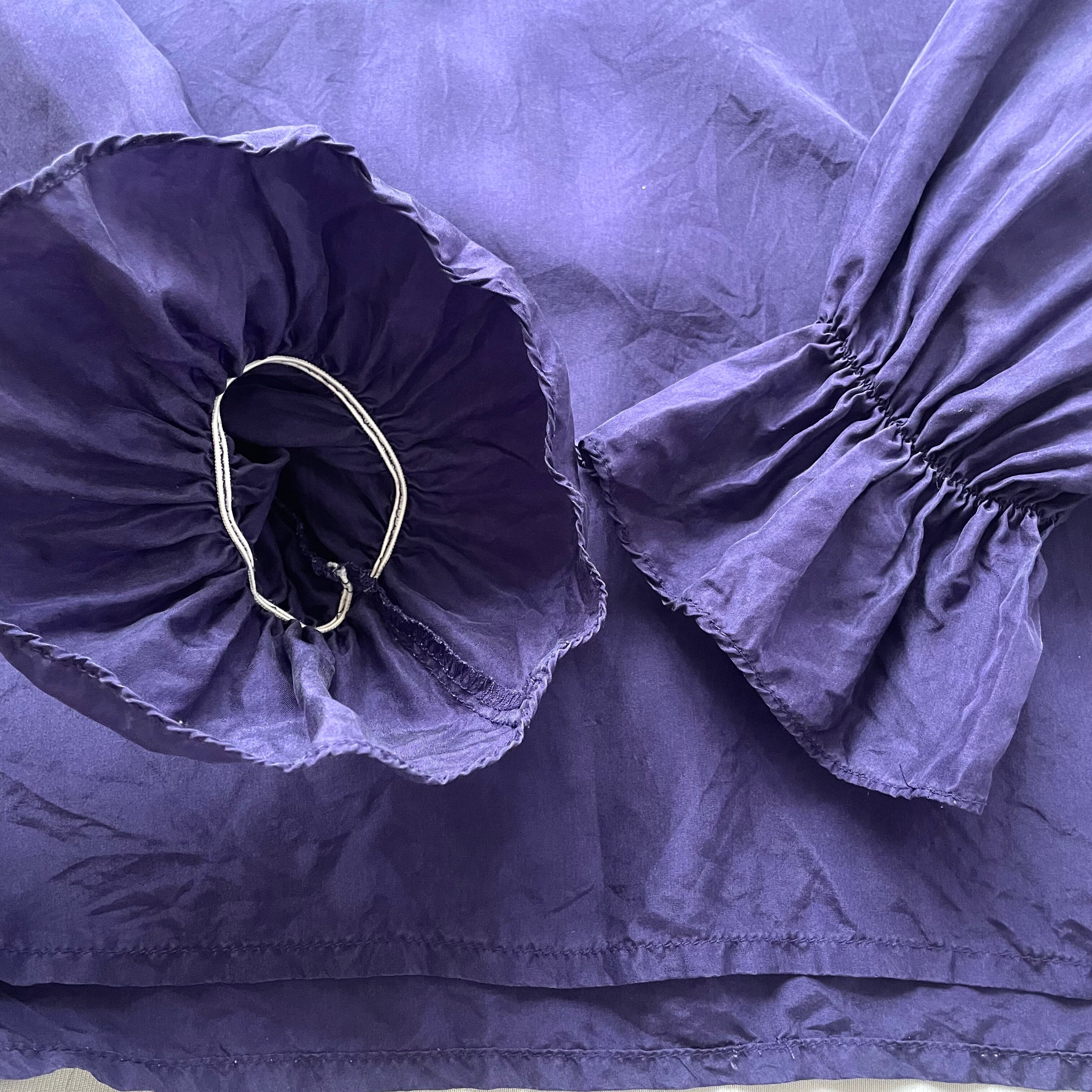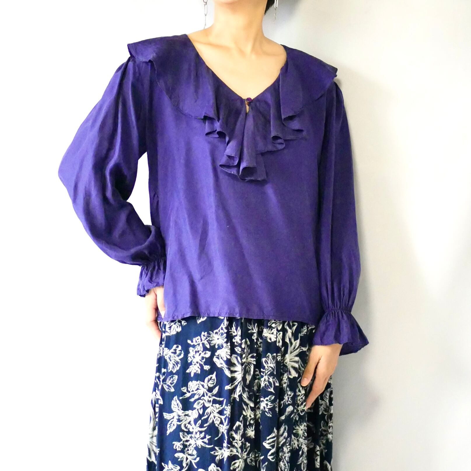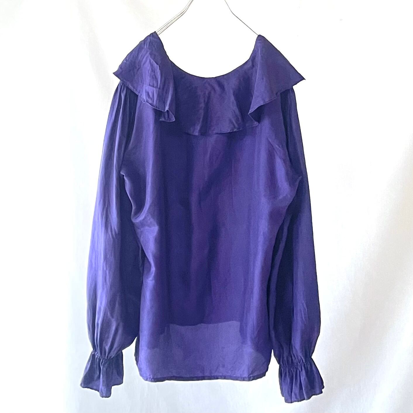 90s頃のEXPRESSパープルピュアシルク100%フリル襟プルオーバーブラウスです。ゆったり着られるサイズ感で、ドレープ感もあり上品に着られます。袖口手首にゴム入りでフリルのようになっているので、重ね着して袖口を見せたり、肘位にゴムを持ってきてふんわりさせて着るのも可愛いです。