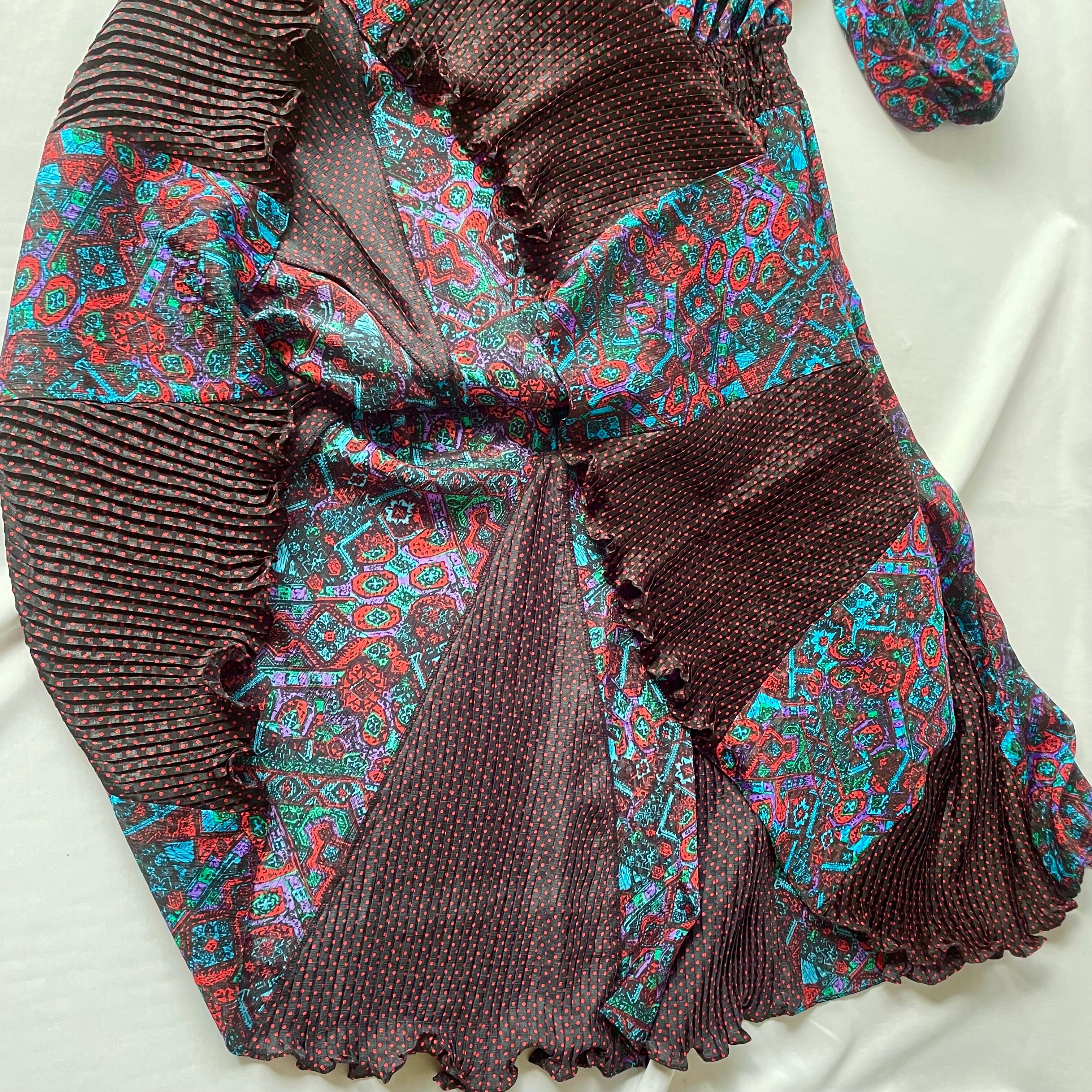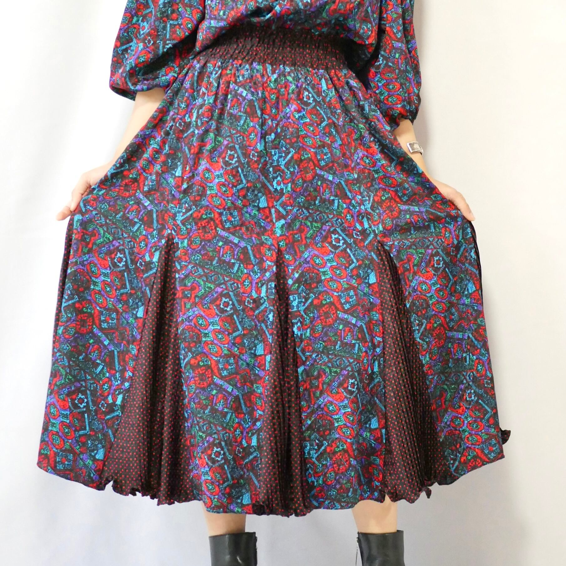 黒地に赤ドットなどのカラフルな総柄、バルーンスリーブに柄の違う生地で広がったフレアシルエットなど、華やかなデザイン満載の素敵なドレスです。