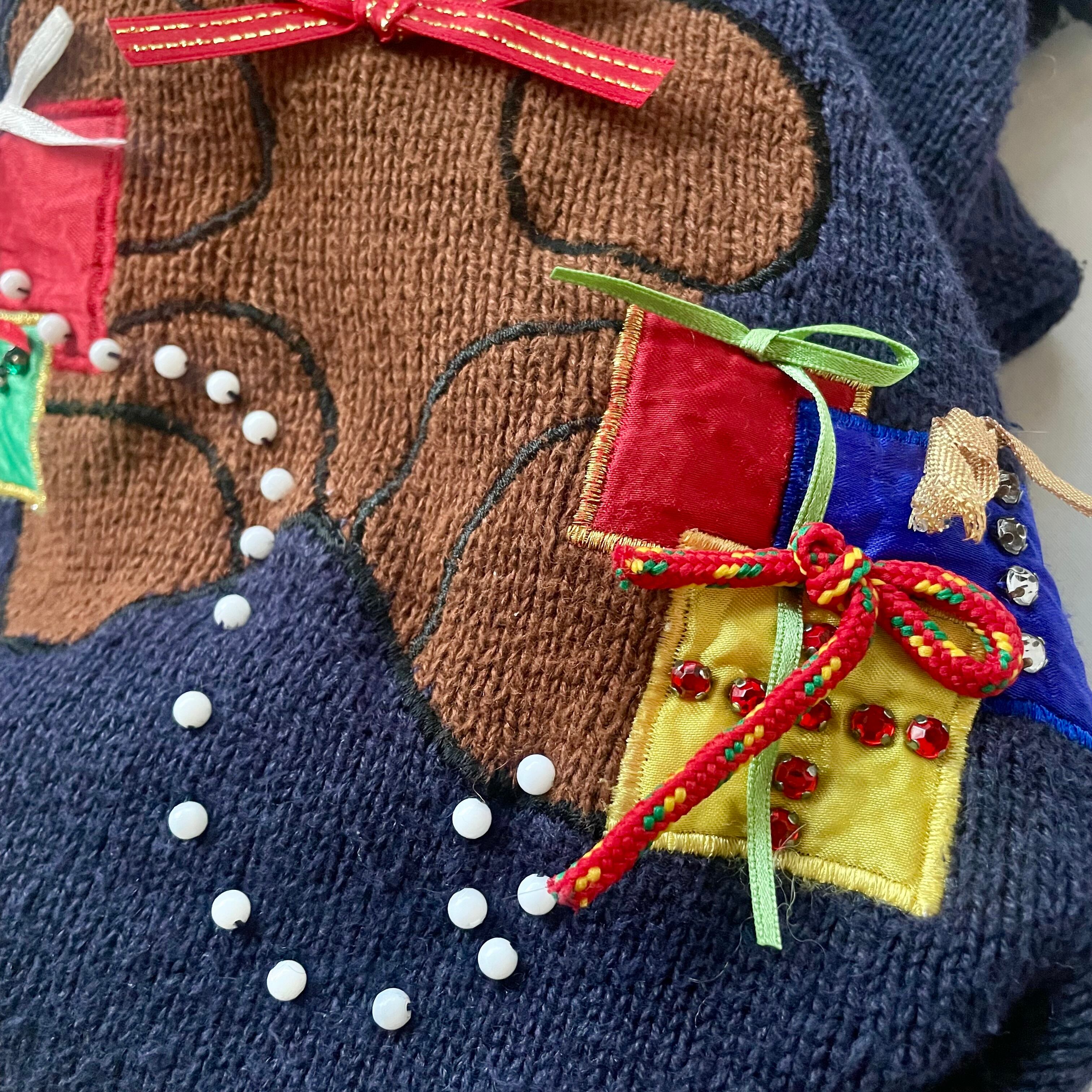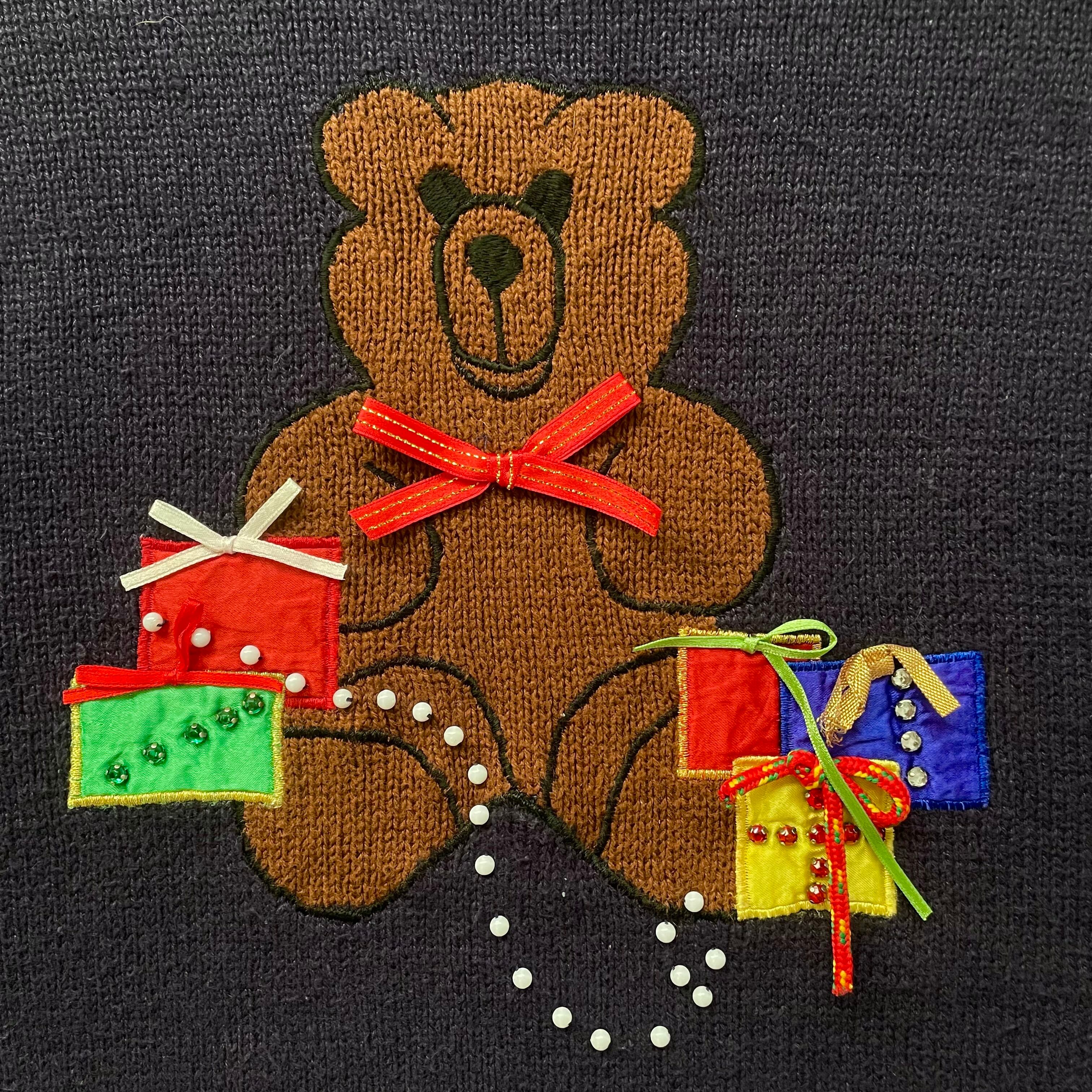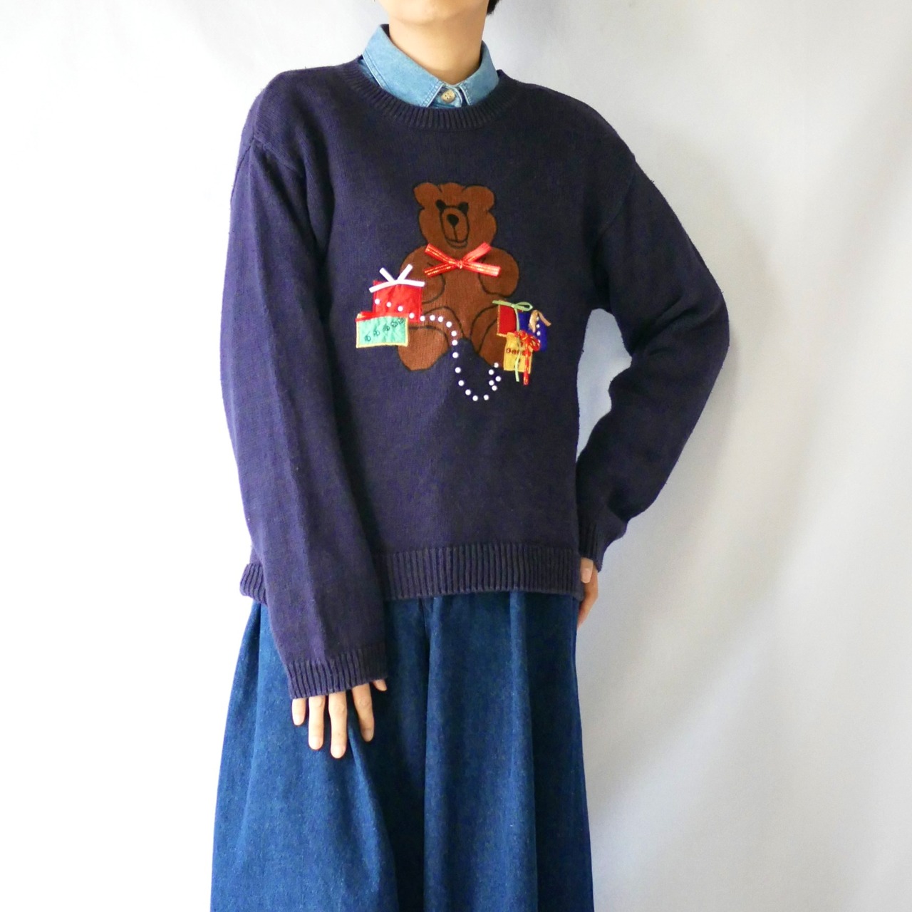 ビーズやりぼんの立体的な装飾が付いたプレゼントに囲まれた茶色いクマモチーフのネイビー地ニットです。1994年のクリスマス向け製品です。ラミー(麻)コットン素材