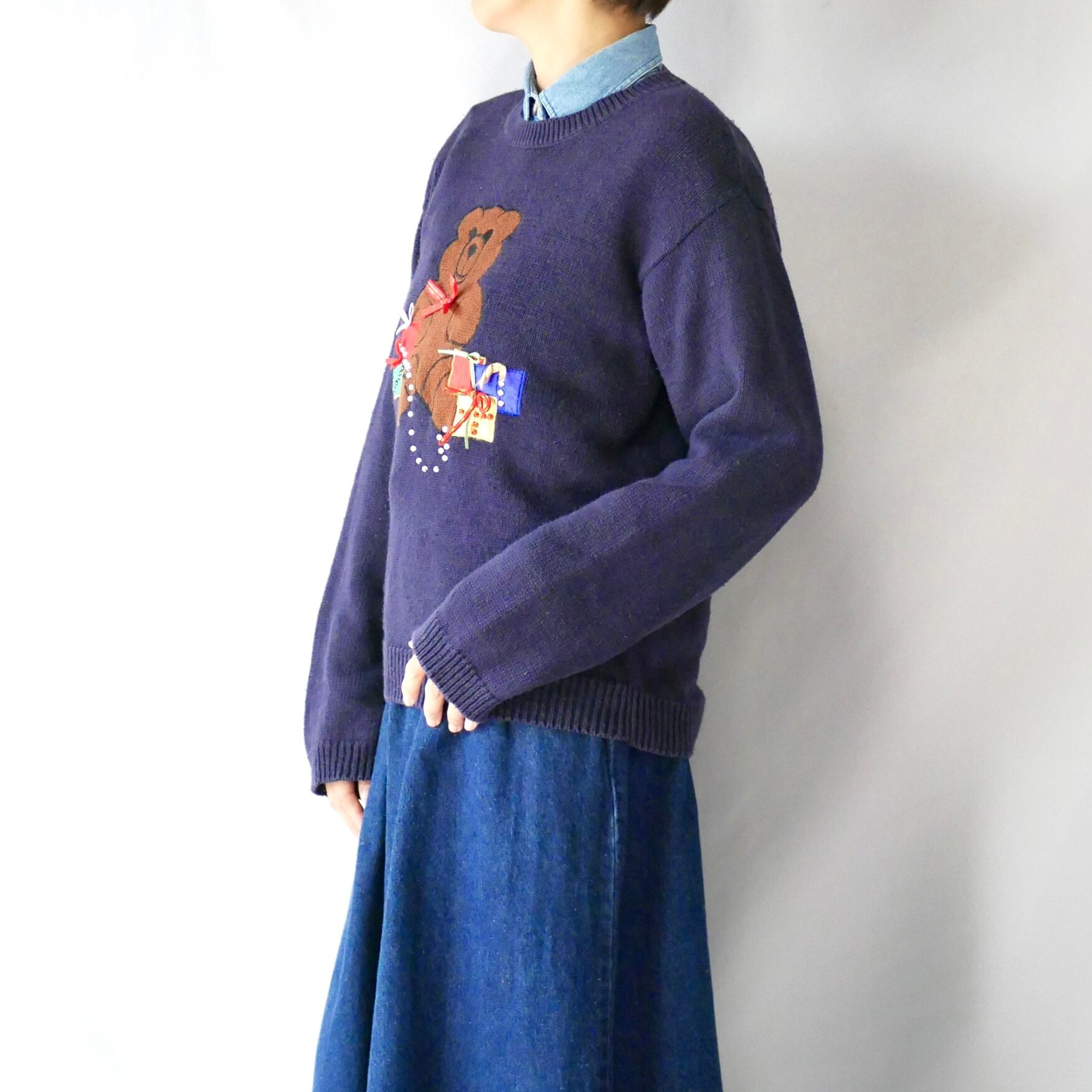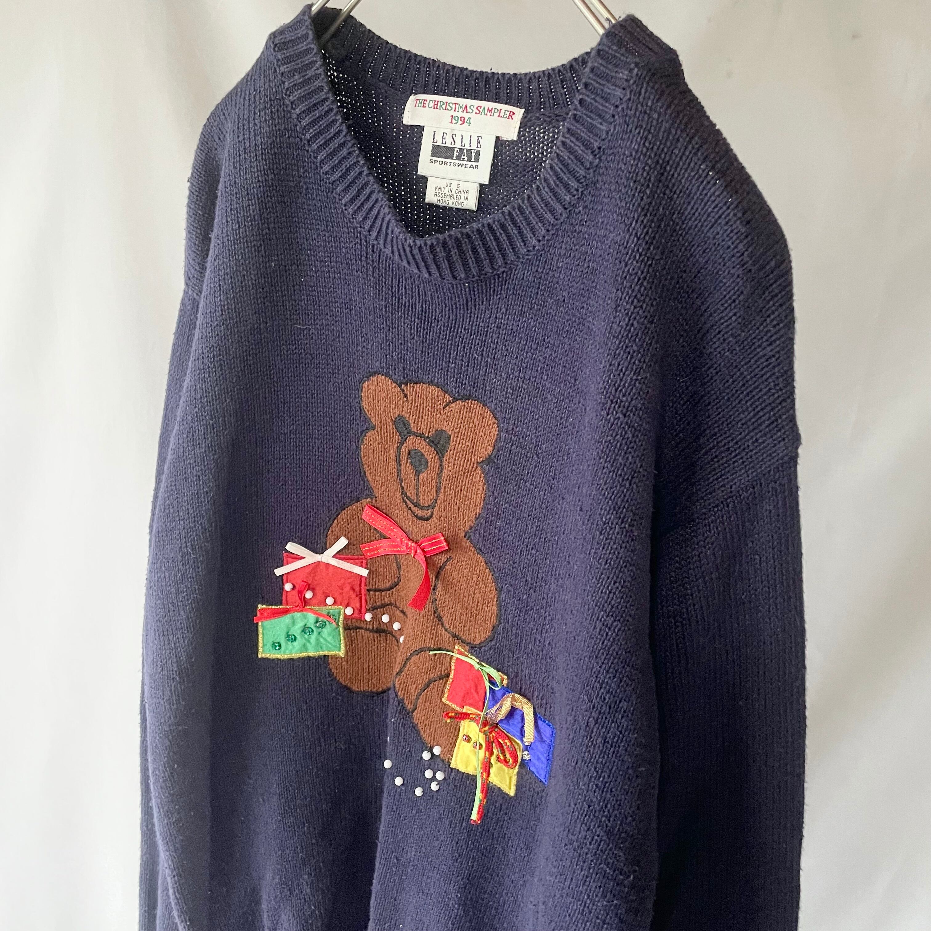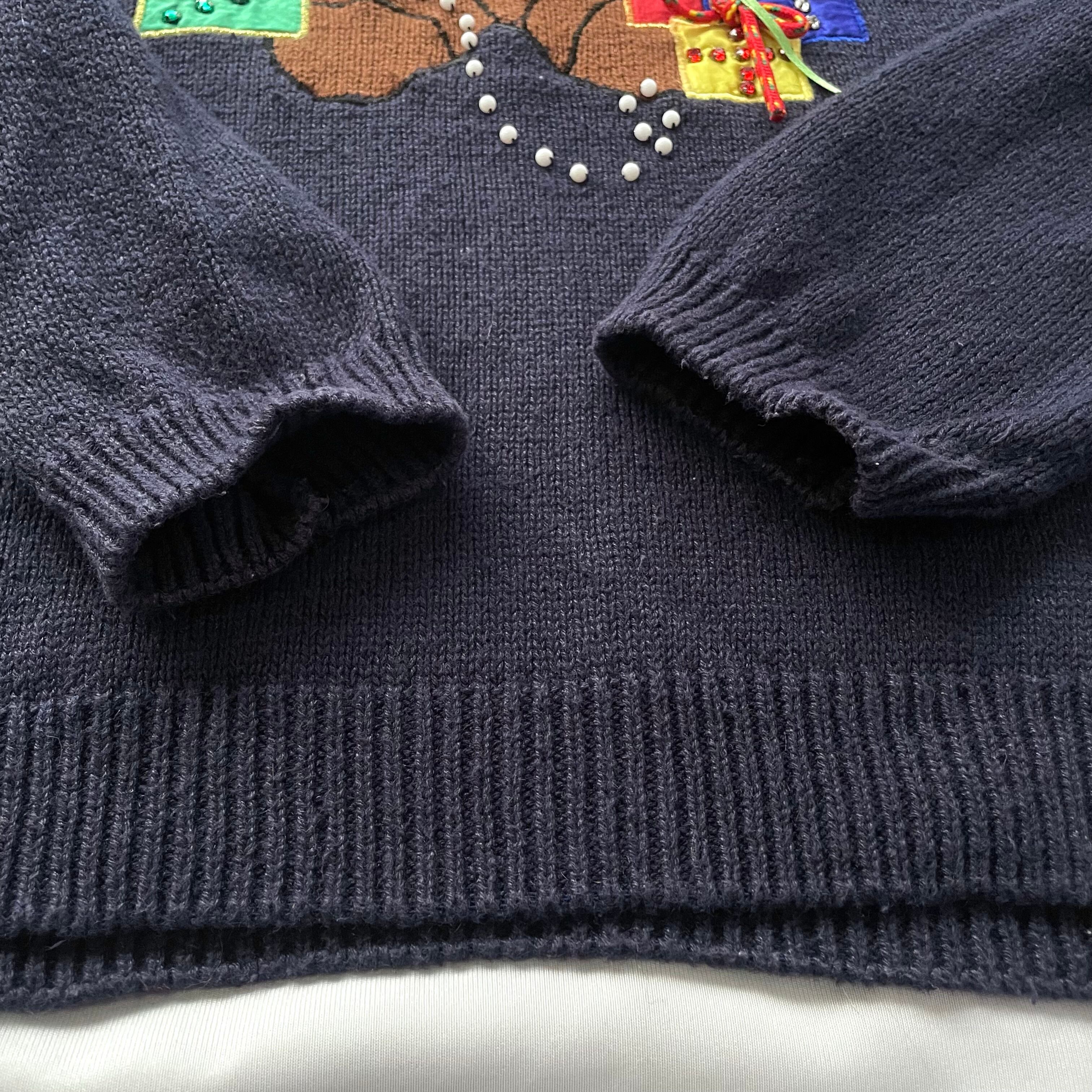 90s Leslie fay navy bear ribbon beads knit ネイビー立体りぼんビーズクマニット