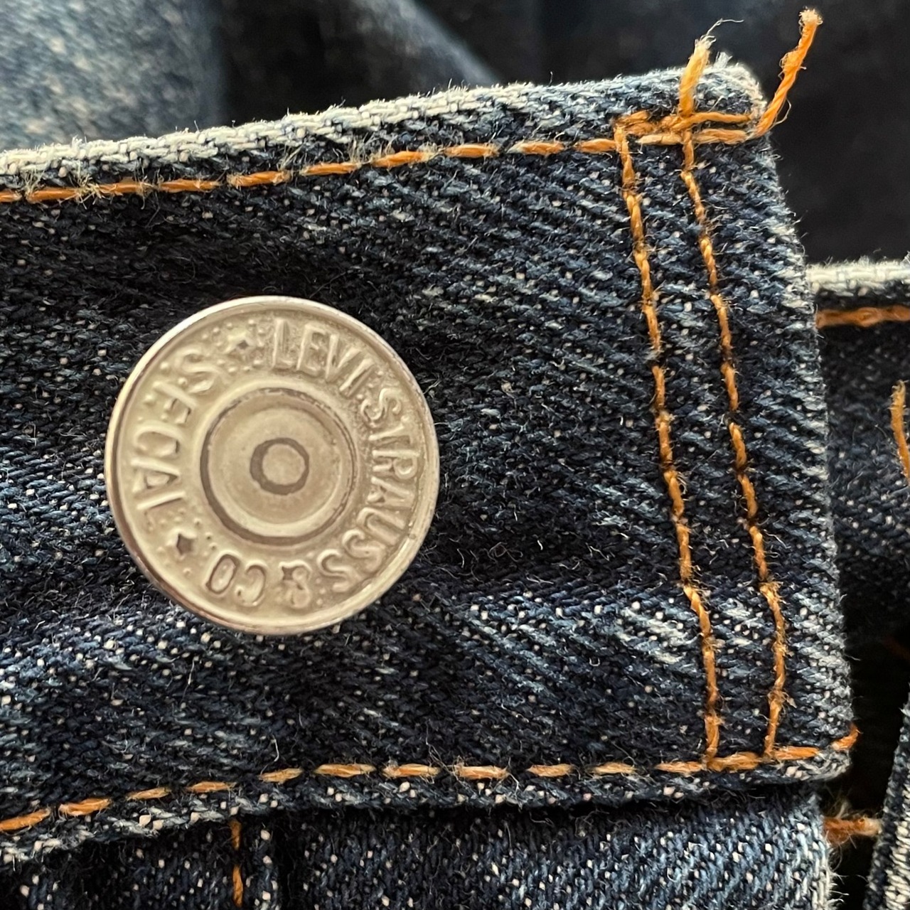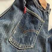 今となっては大変希少な、色残りかなり濃くきれいな縦落ちをした ヴィンテージ リーバイスBIG E デニムパンツです。赤耳付き 不均等V BIG E コインポケットチェーンステッチ トップボタン横平行ステッチ 帯ステッチ上下チェーンステッチ アウトシーム縫い合わせシングルステッチ 後期