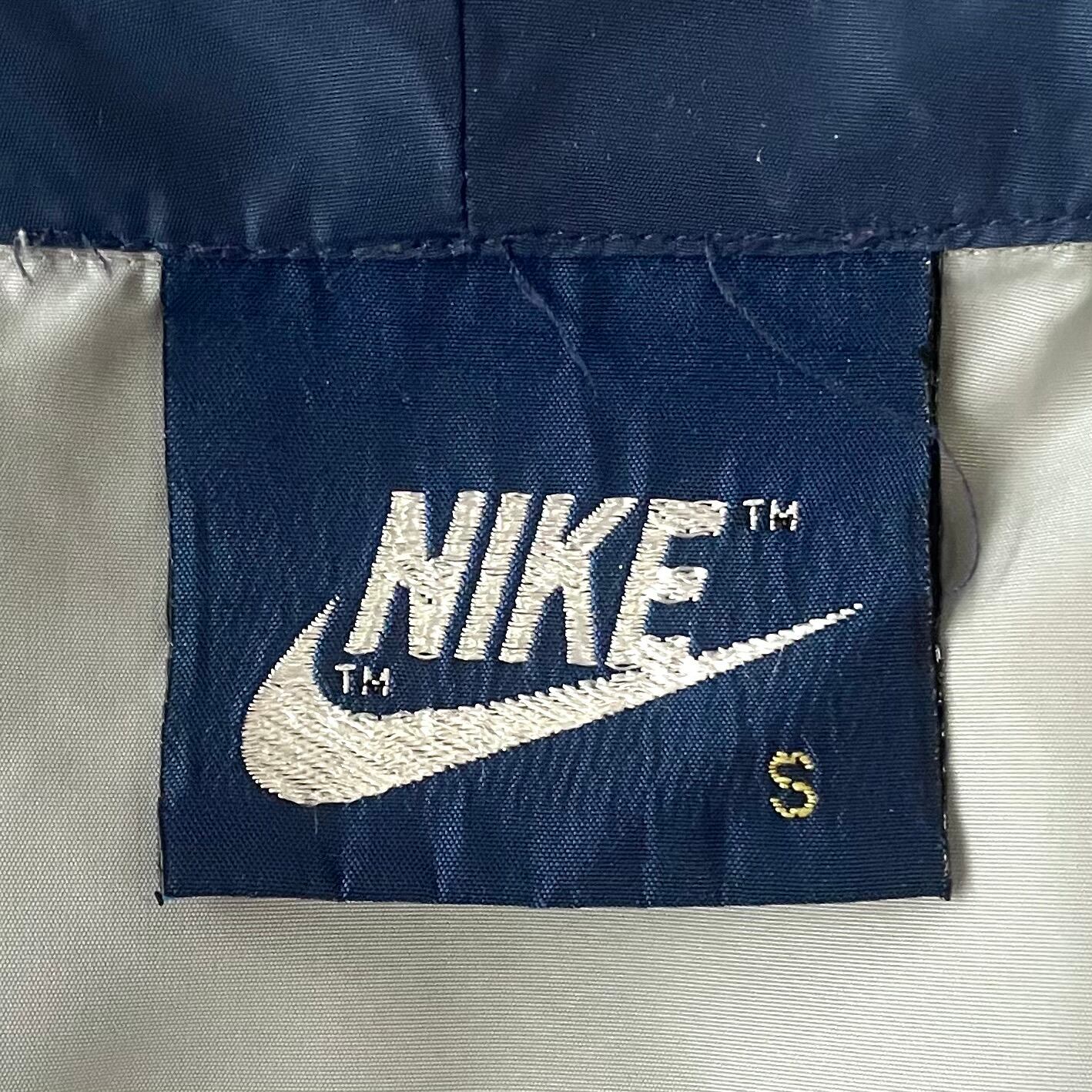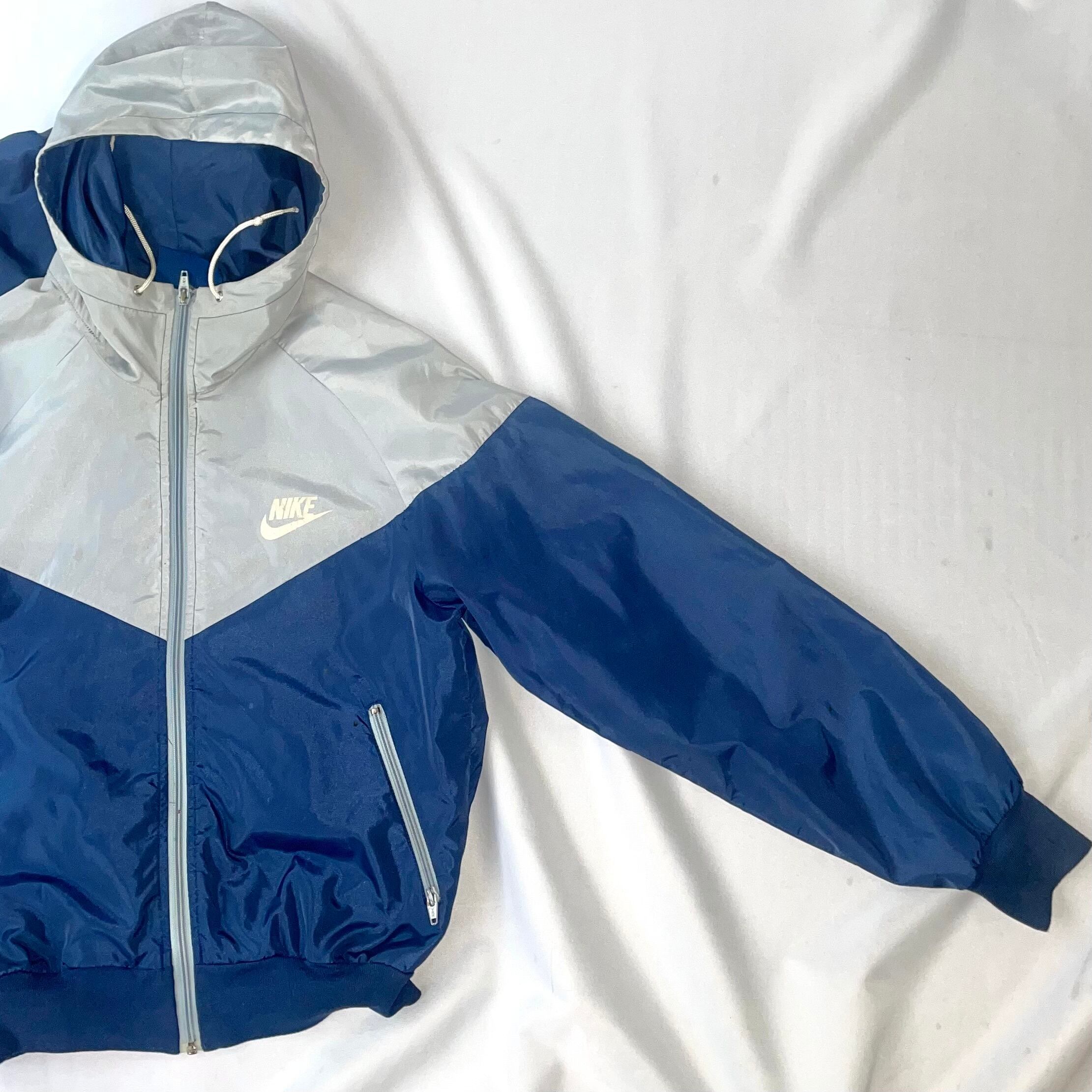 80年代ヴィンテージ 紺タグ NIKE ネイビー×グレー切替 フード付き zip up ナイロンジャケットです。 ポケット付き