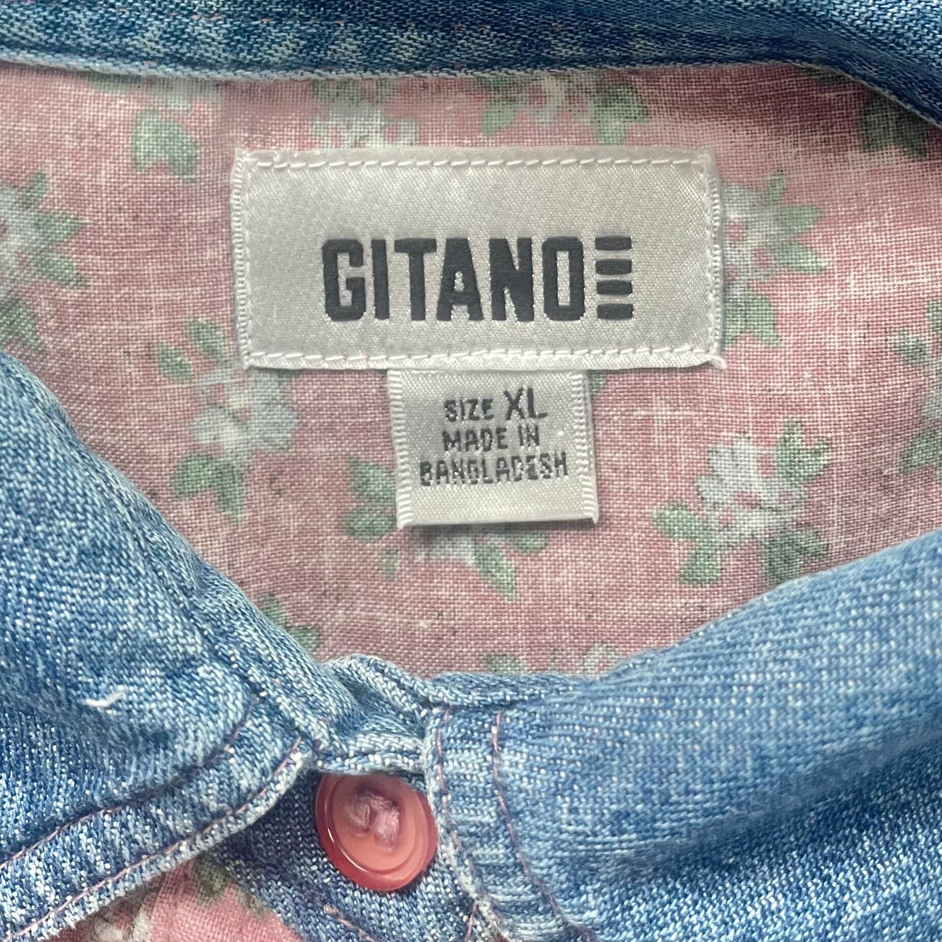 淡いピンクの花柄にダンガリーデニムの襟付き、袖切替がかわいい、90年代頃のGITANOビッグシルエットシャツです。