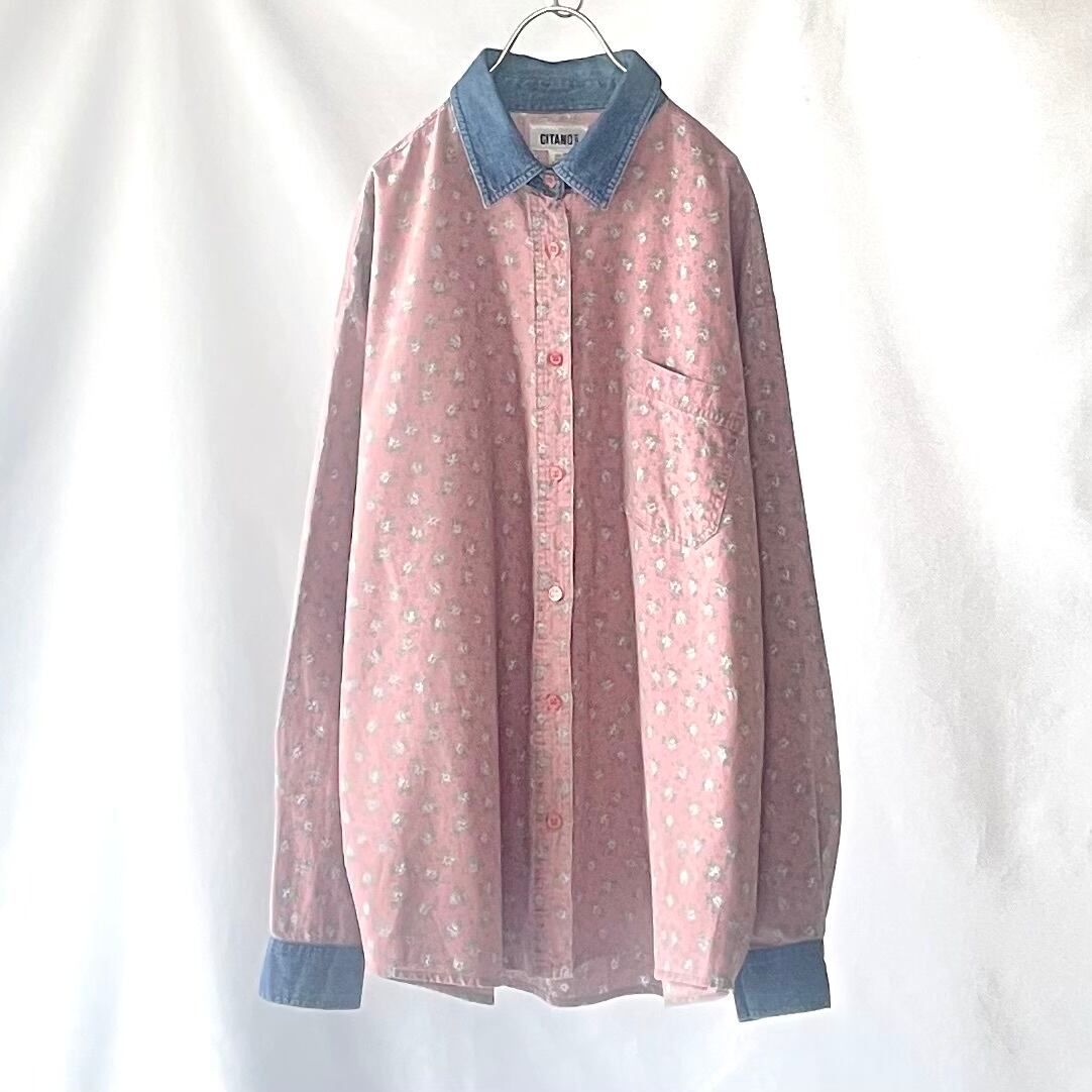 90s GITANO pink floral dungaree shirtピンク花柄 デニム切替長袖シャツ