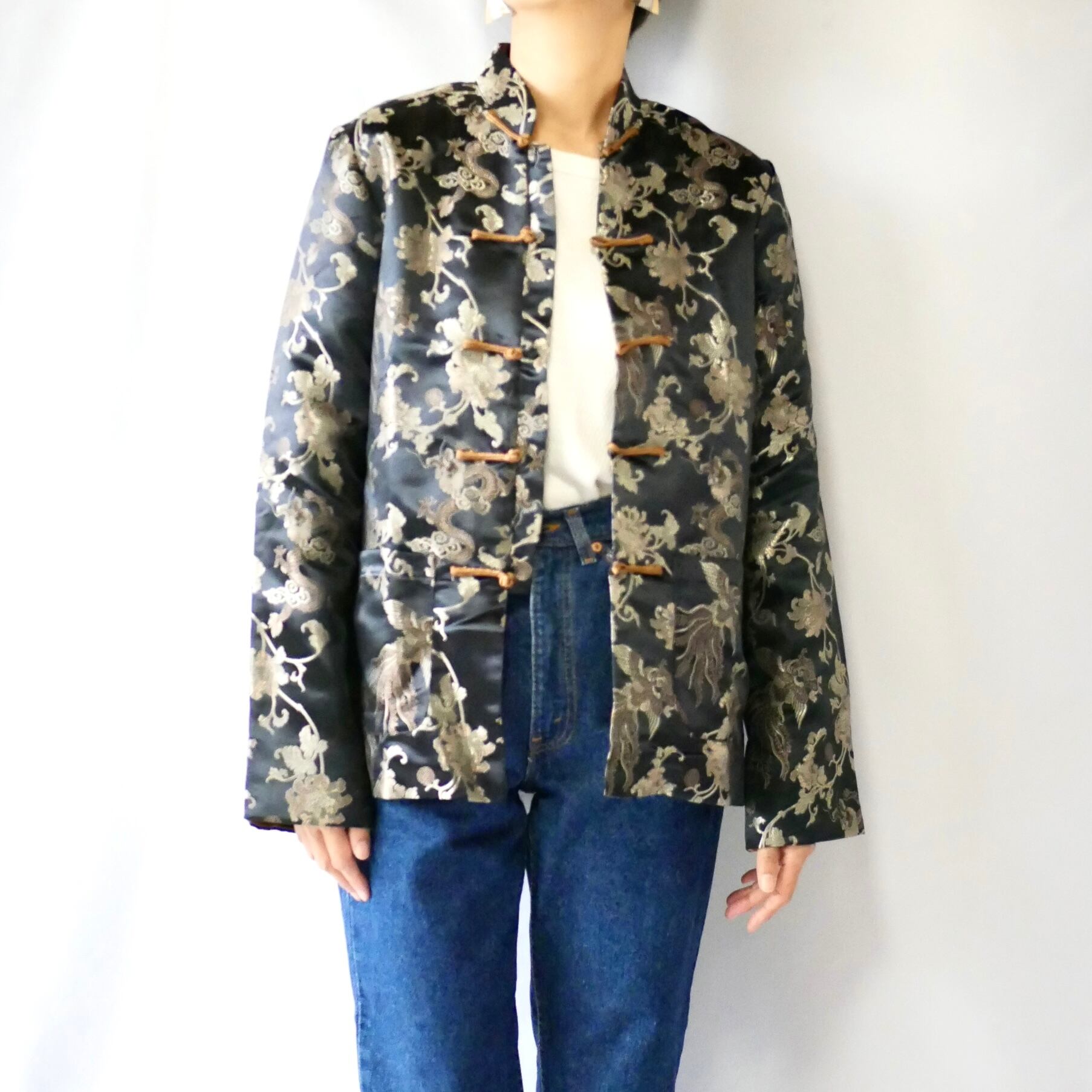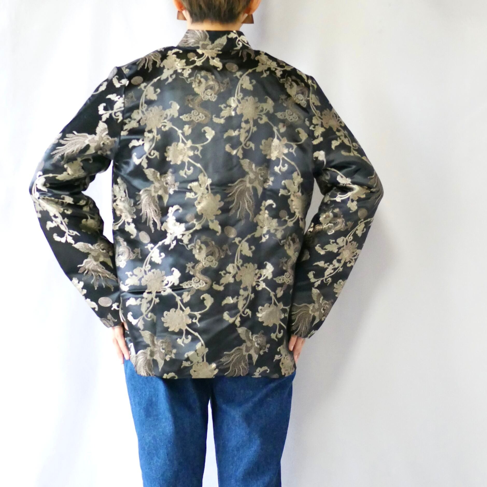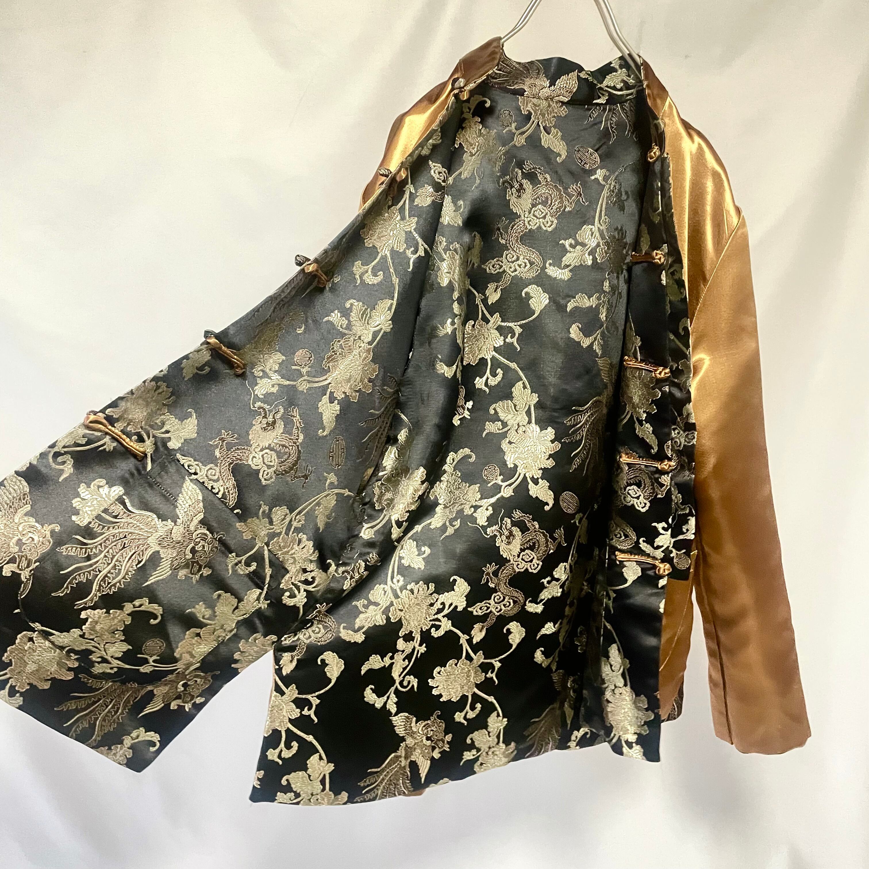 黒にボタニカル刺繍入り側と、光沢感のあるゴールド無地側の両方楽しめる、リバーシブルチャイニーズJKTです。
