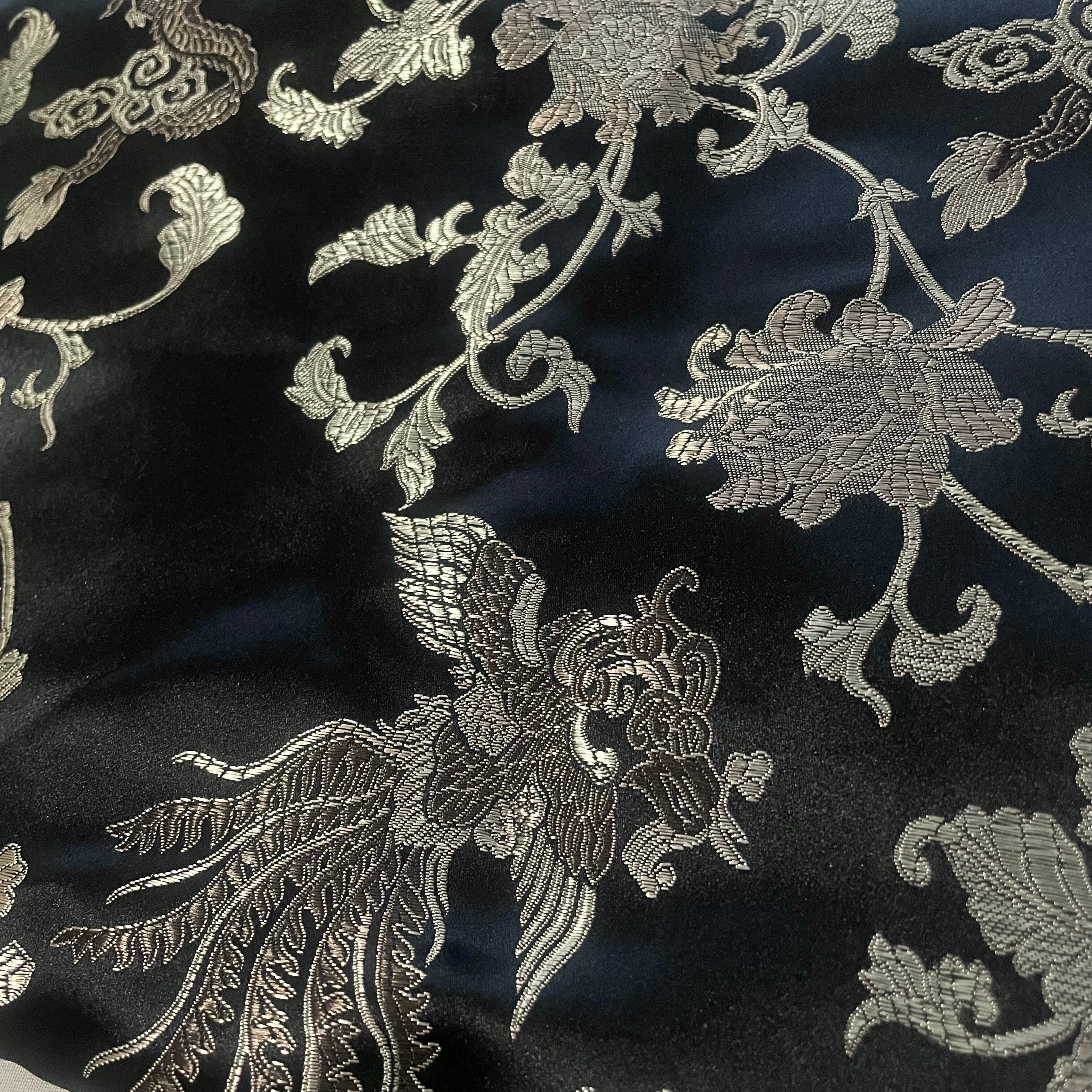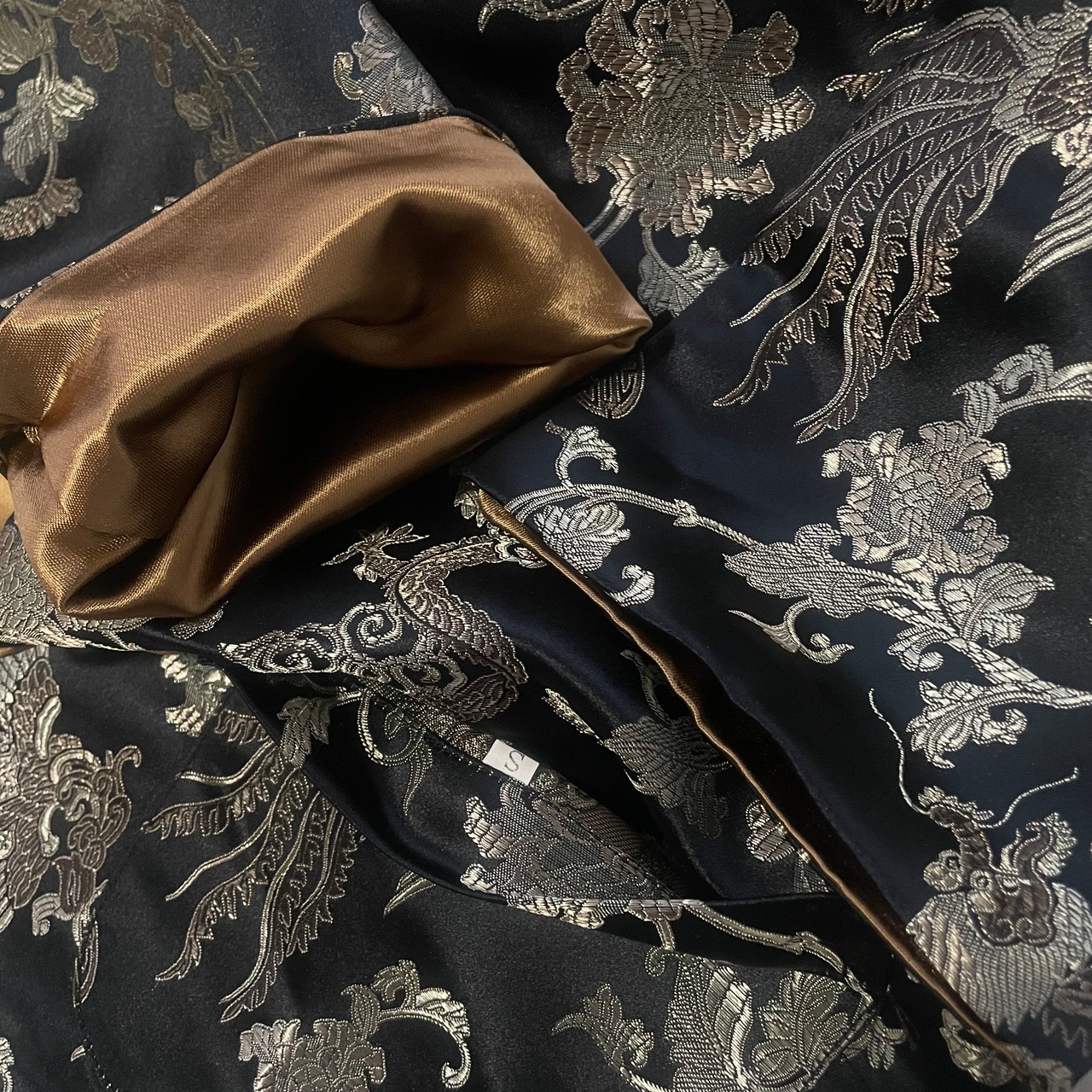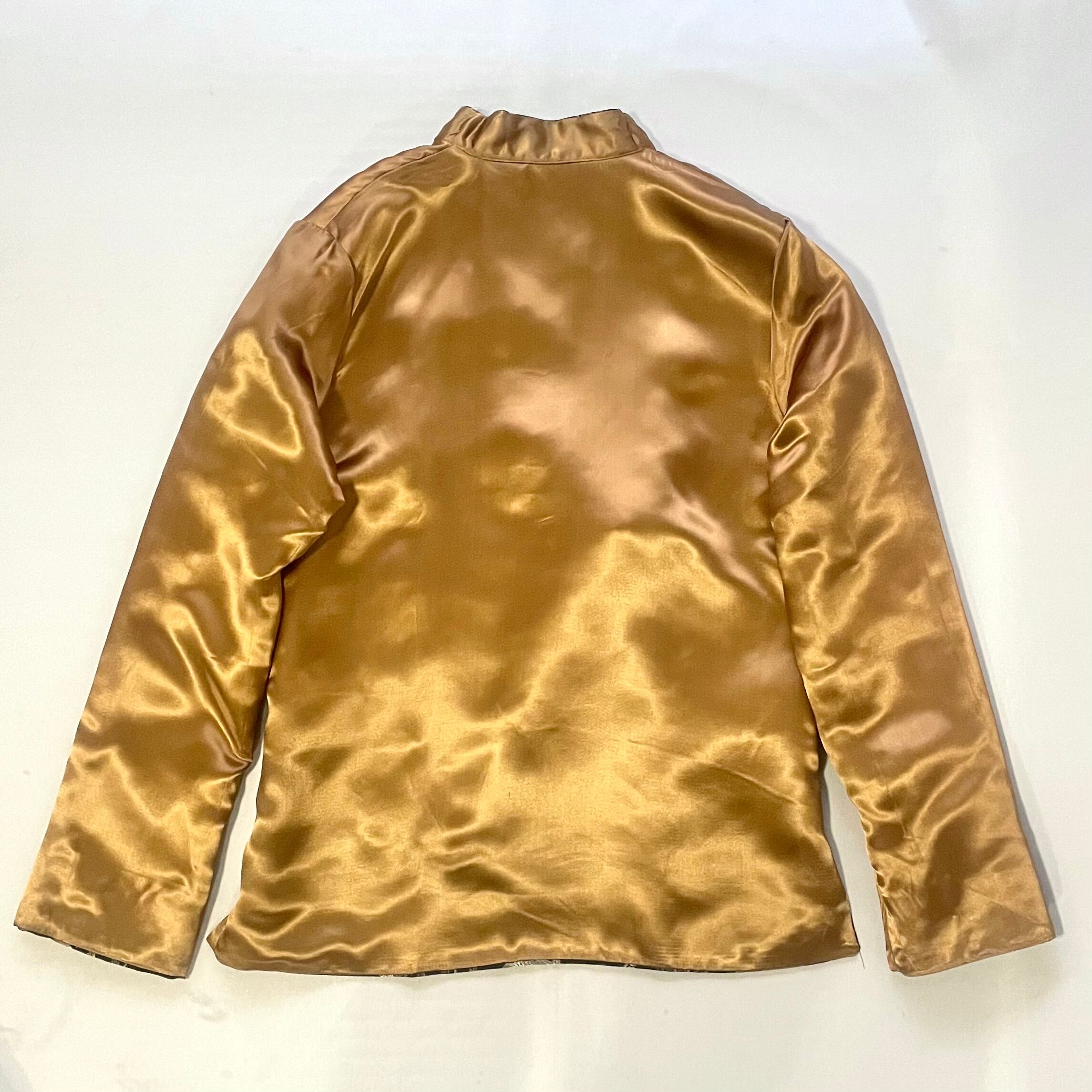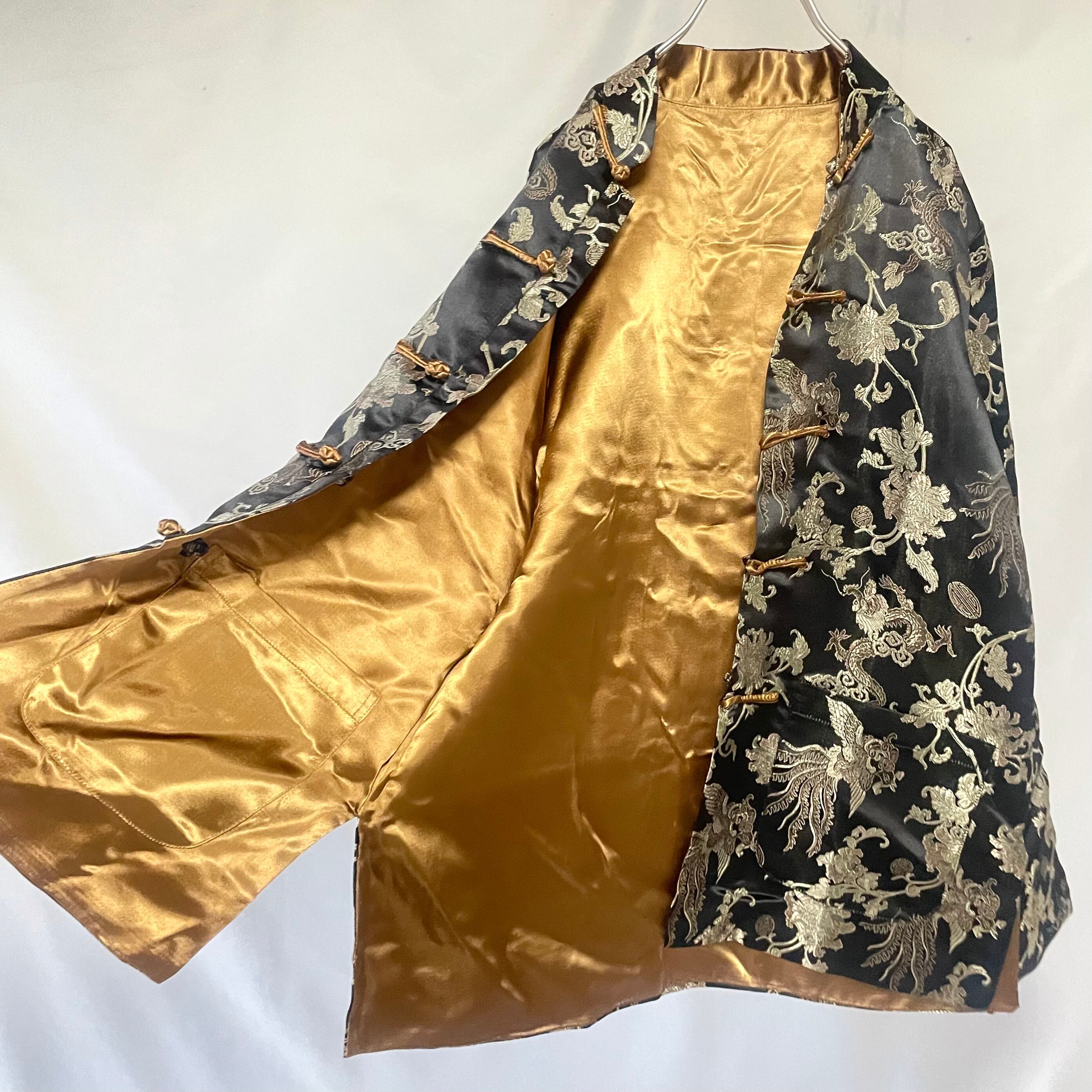 黒にボタニカル刺繍入り側と、光沢感のあるゴールド無地側の両方楽しめる、リバーシブルチャイニーズJKTです。