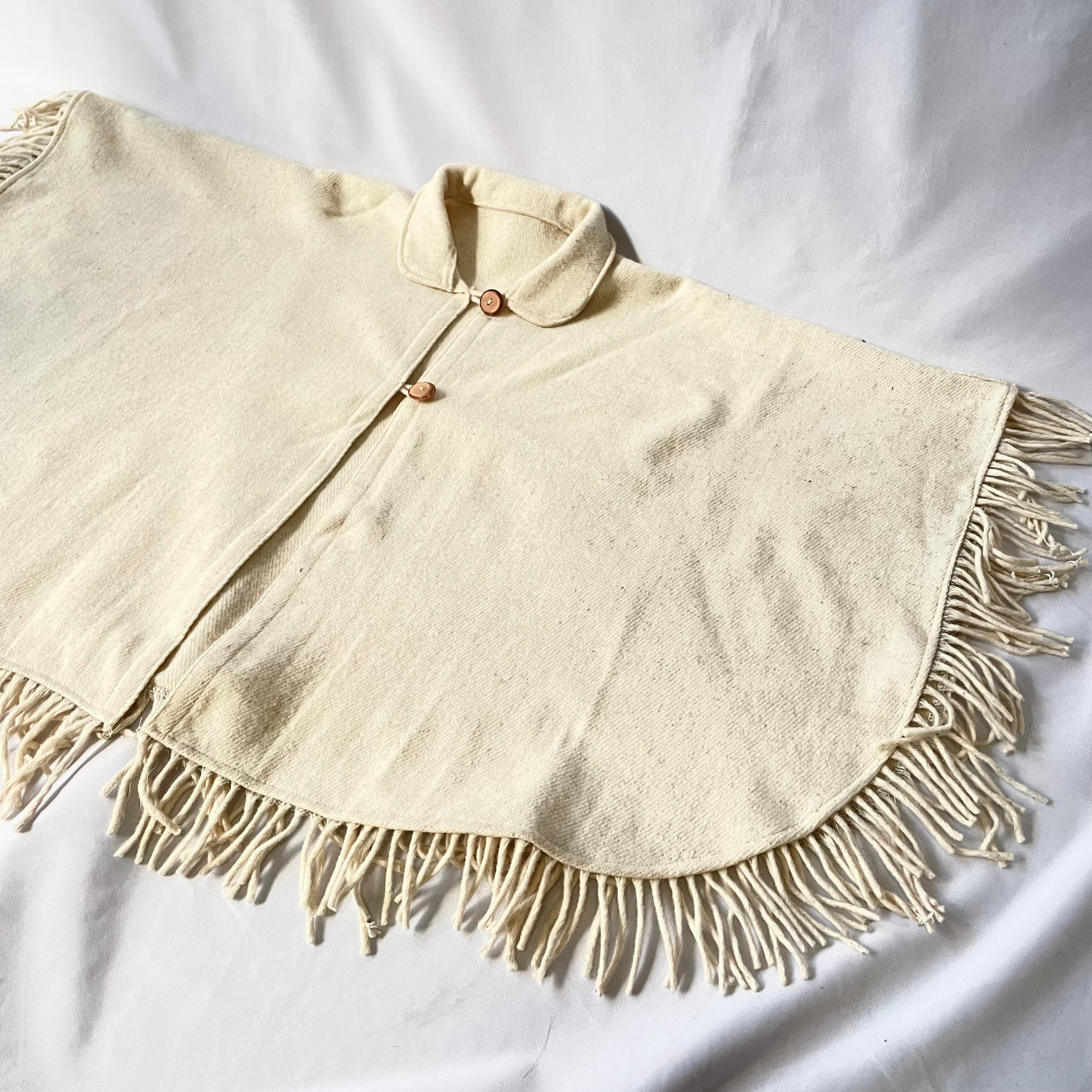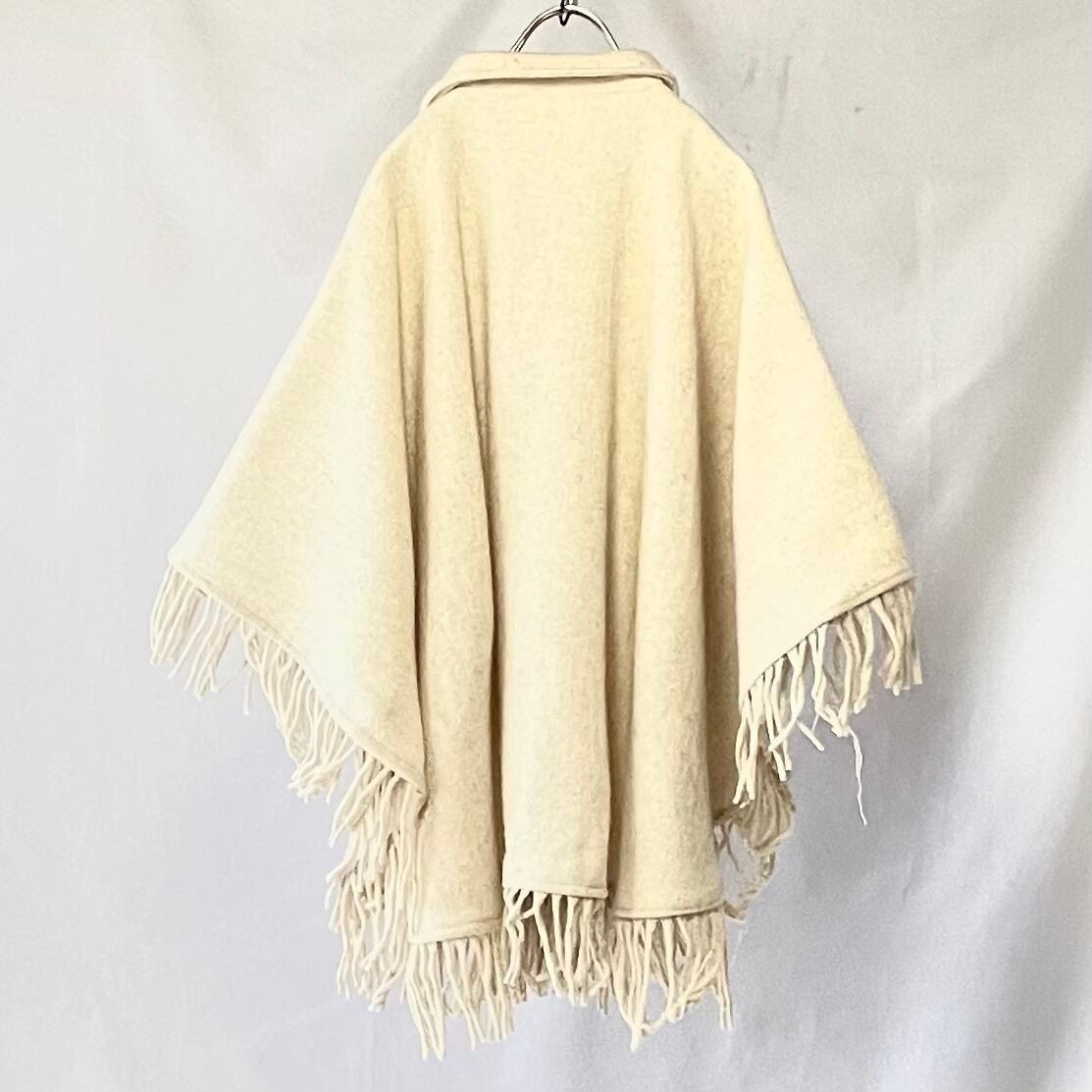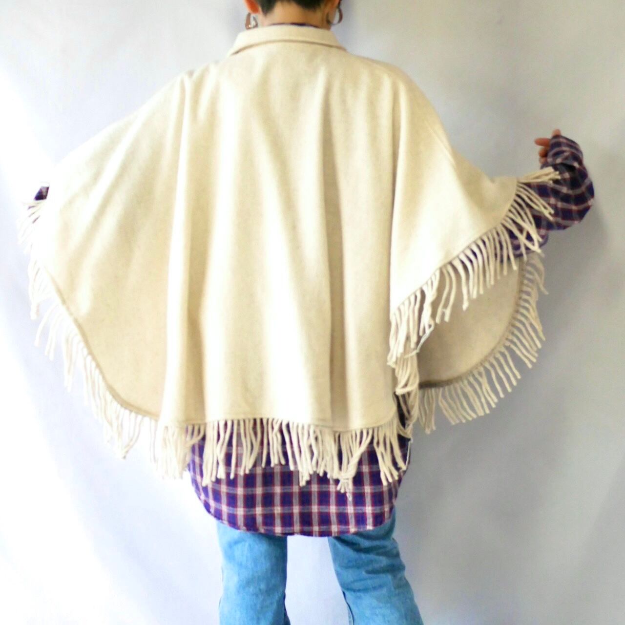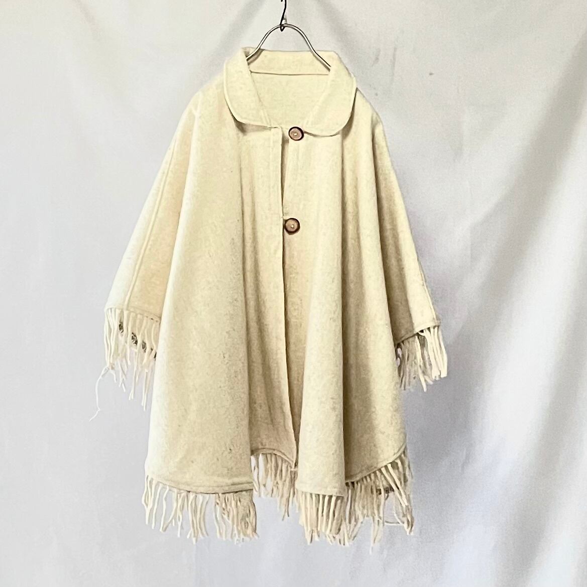 全ての裾に付くフリンジがかわいい、アイボリーオートミール 襟付きケープコートです。
