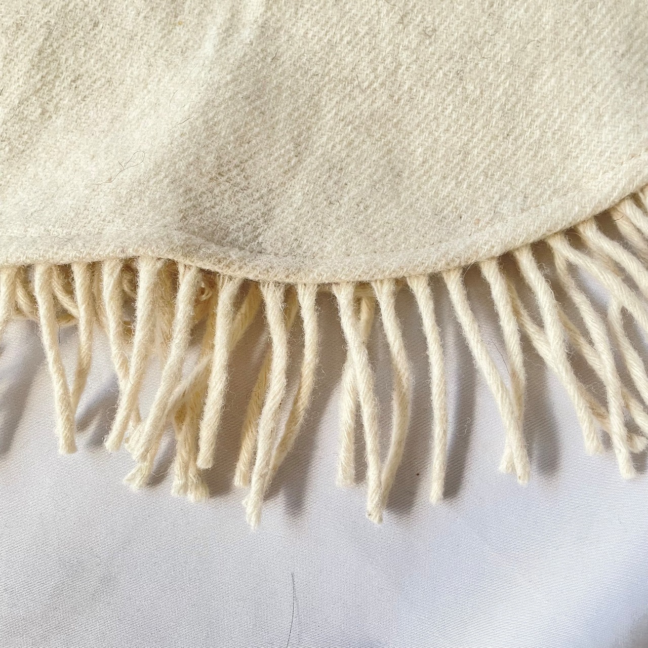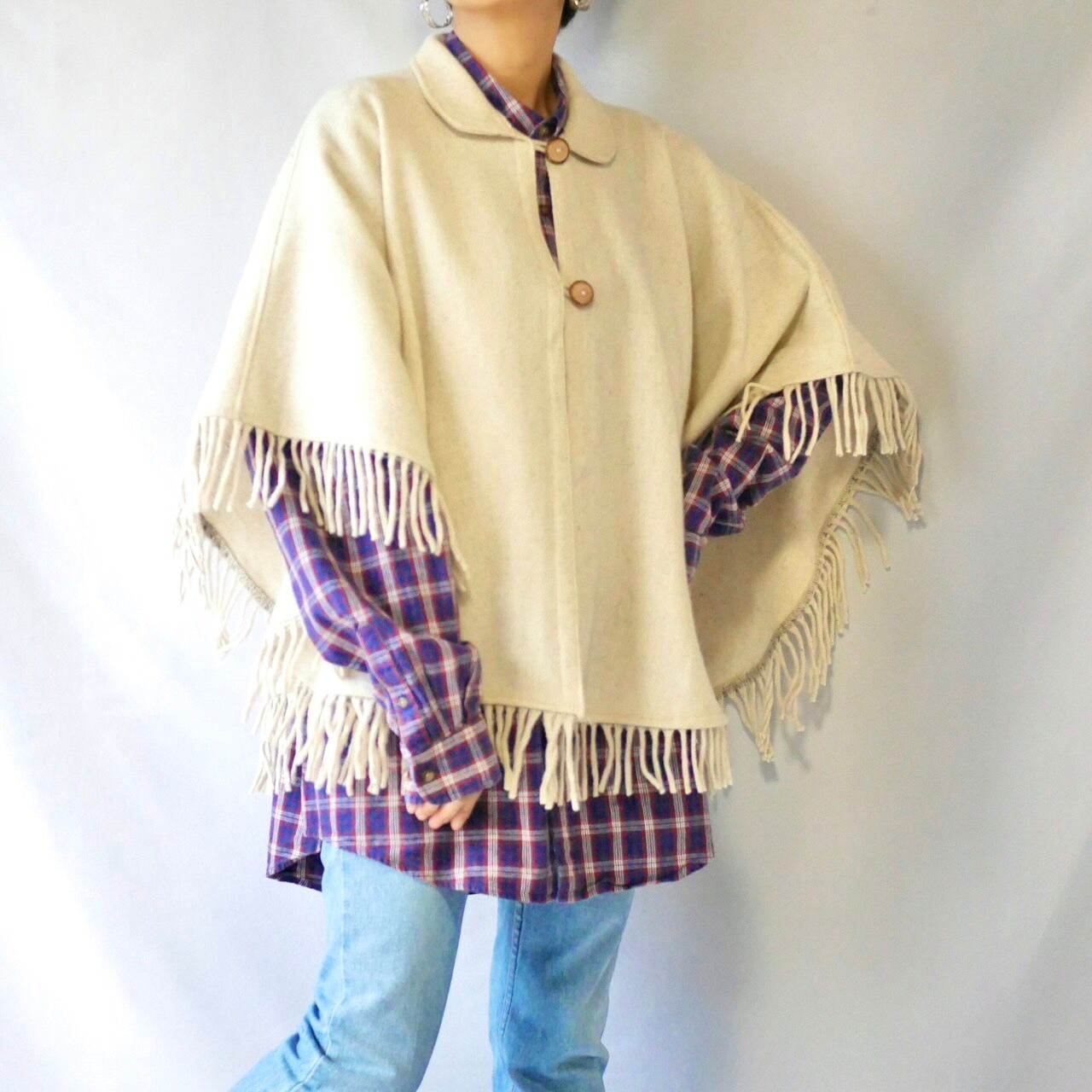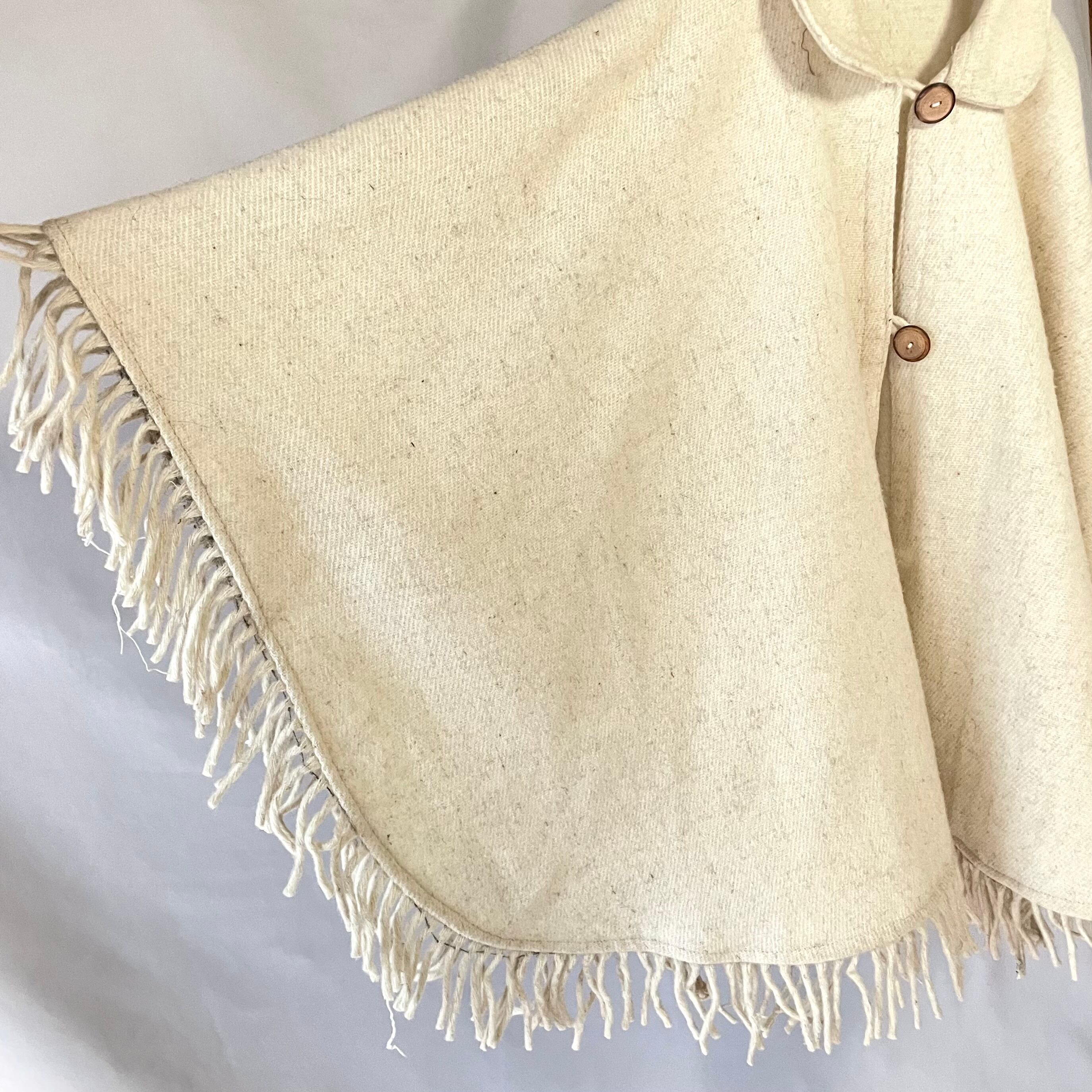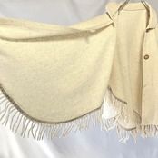 全ての裾に付くフリンジがかわいい、アイボリーオートミール 襟付きケープコートです。