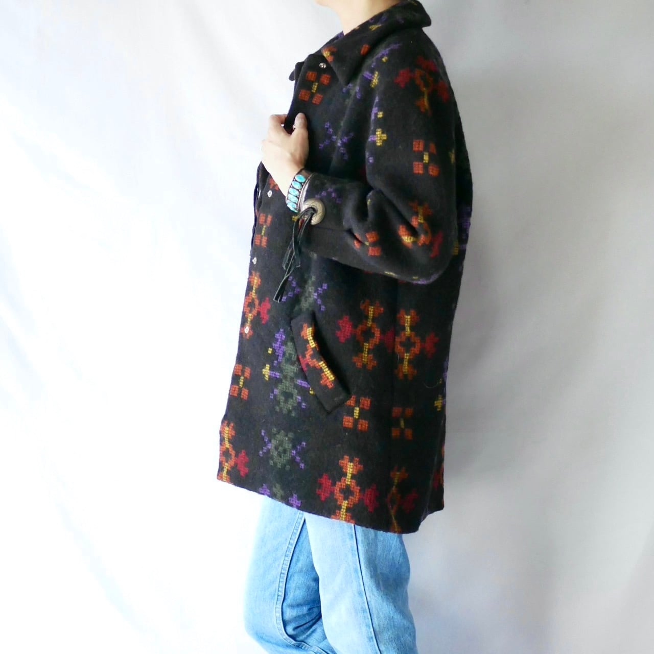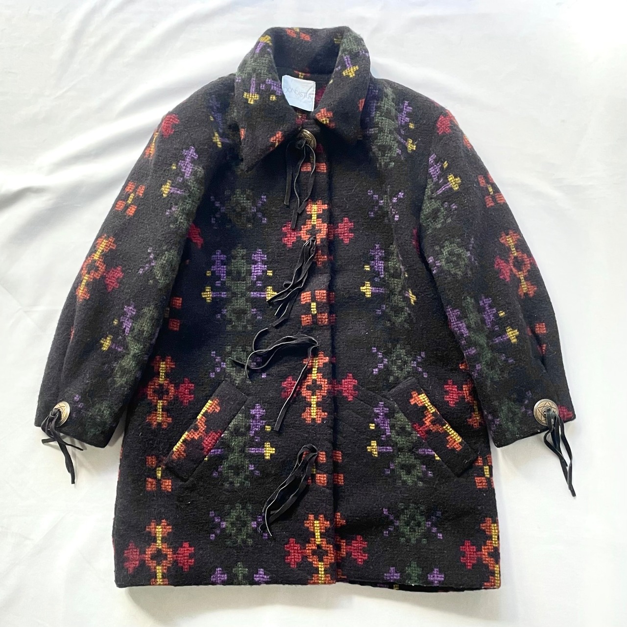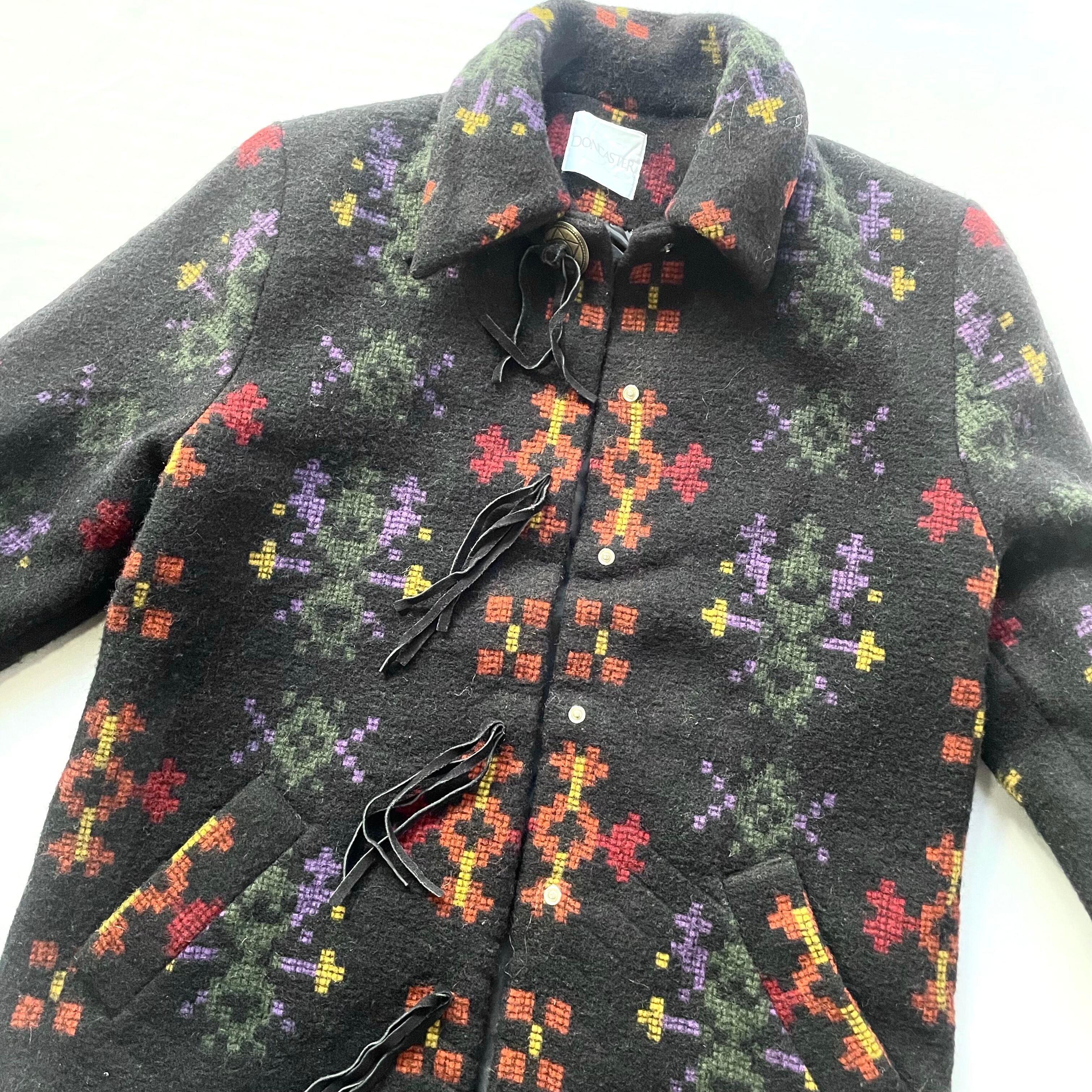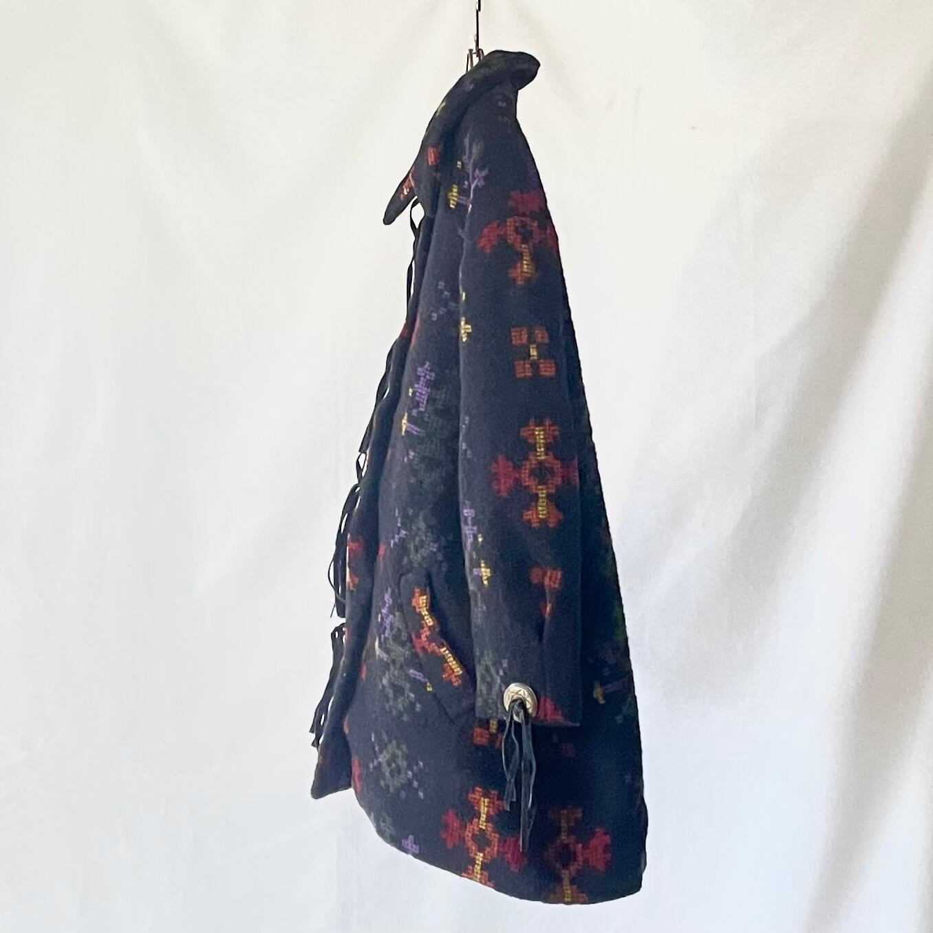コンチョ、フリンジ装飾がかわいい、アメリカ製 黒×ネイティブ柄 ウールコートです。ポケット付き。ナイロンが少し入っており、重たくないコートです。