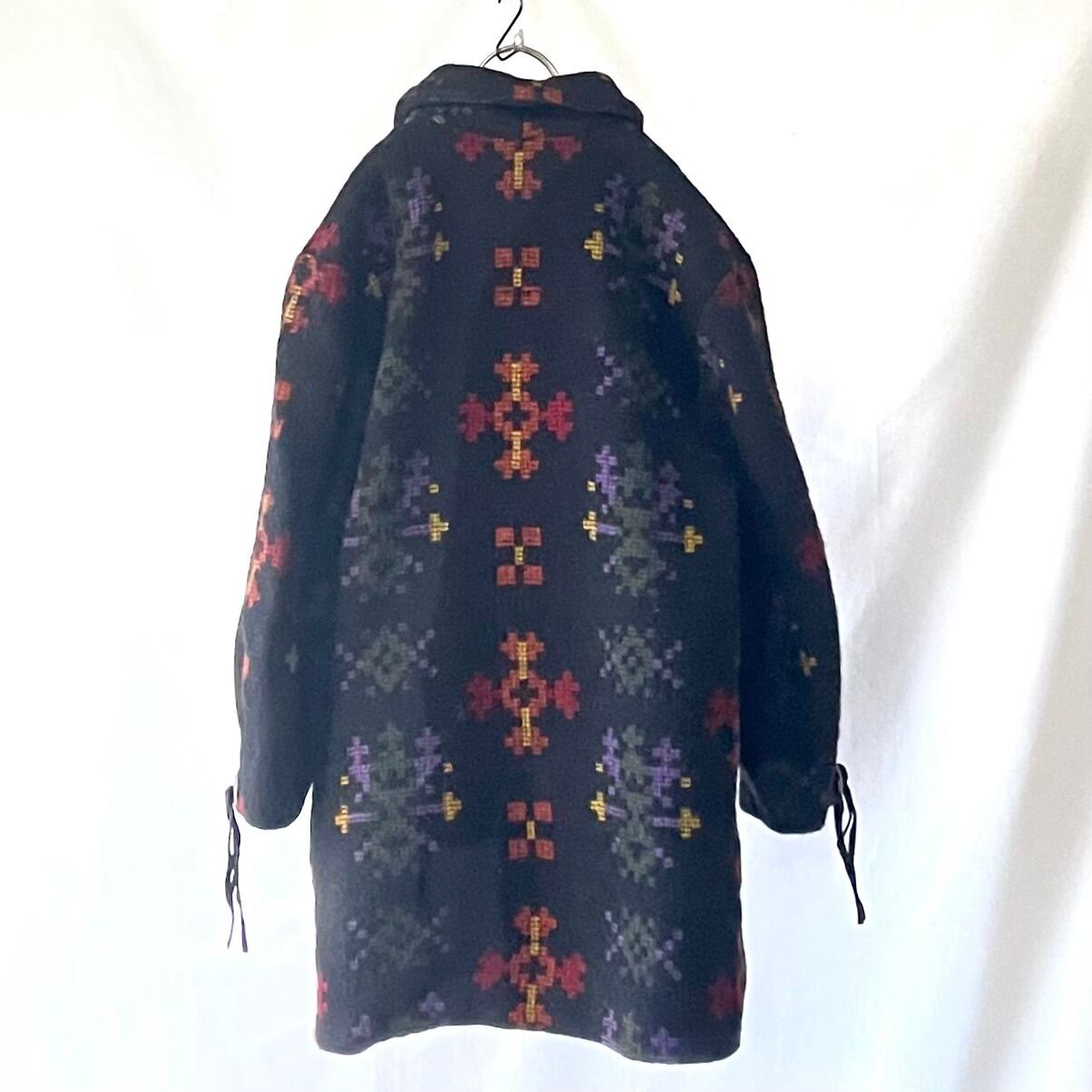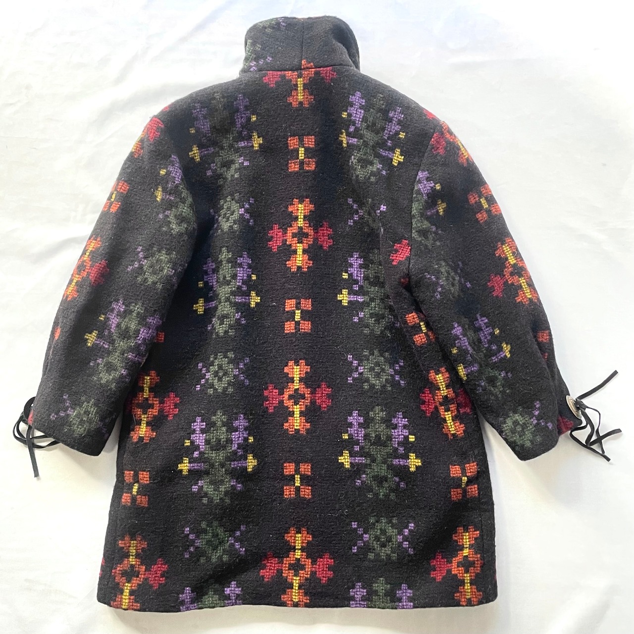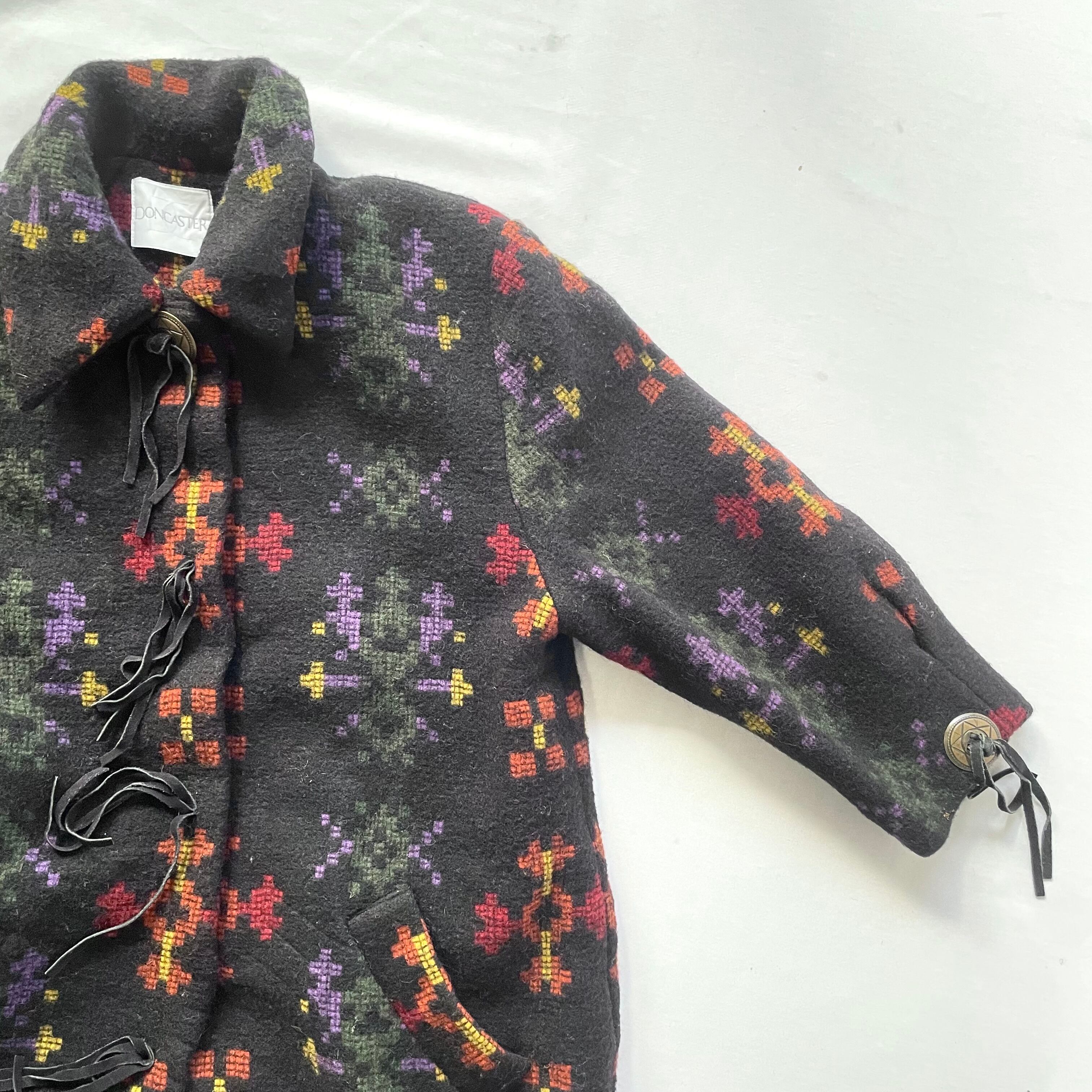 コンチョ、フリンジ装飾がかわいい、アメリカ製 黒×ネイティブ柄 ウールコートです。ポケット付き。ナイロンが少し入っており、重たくないコートです。