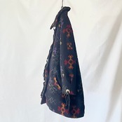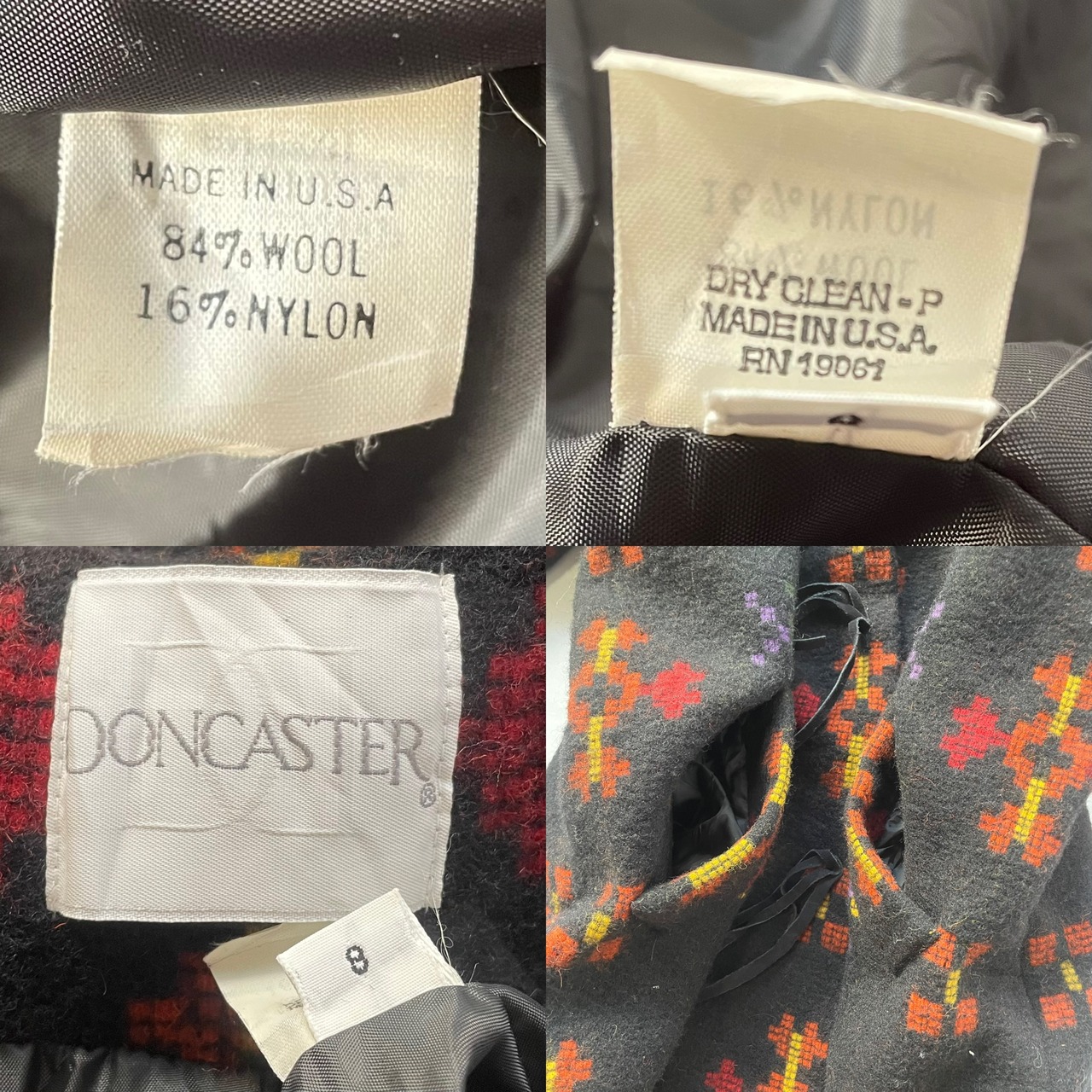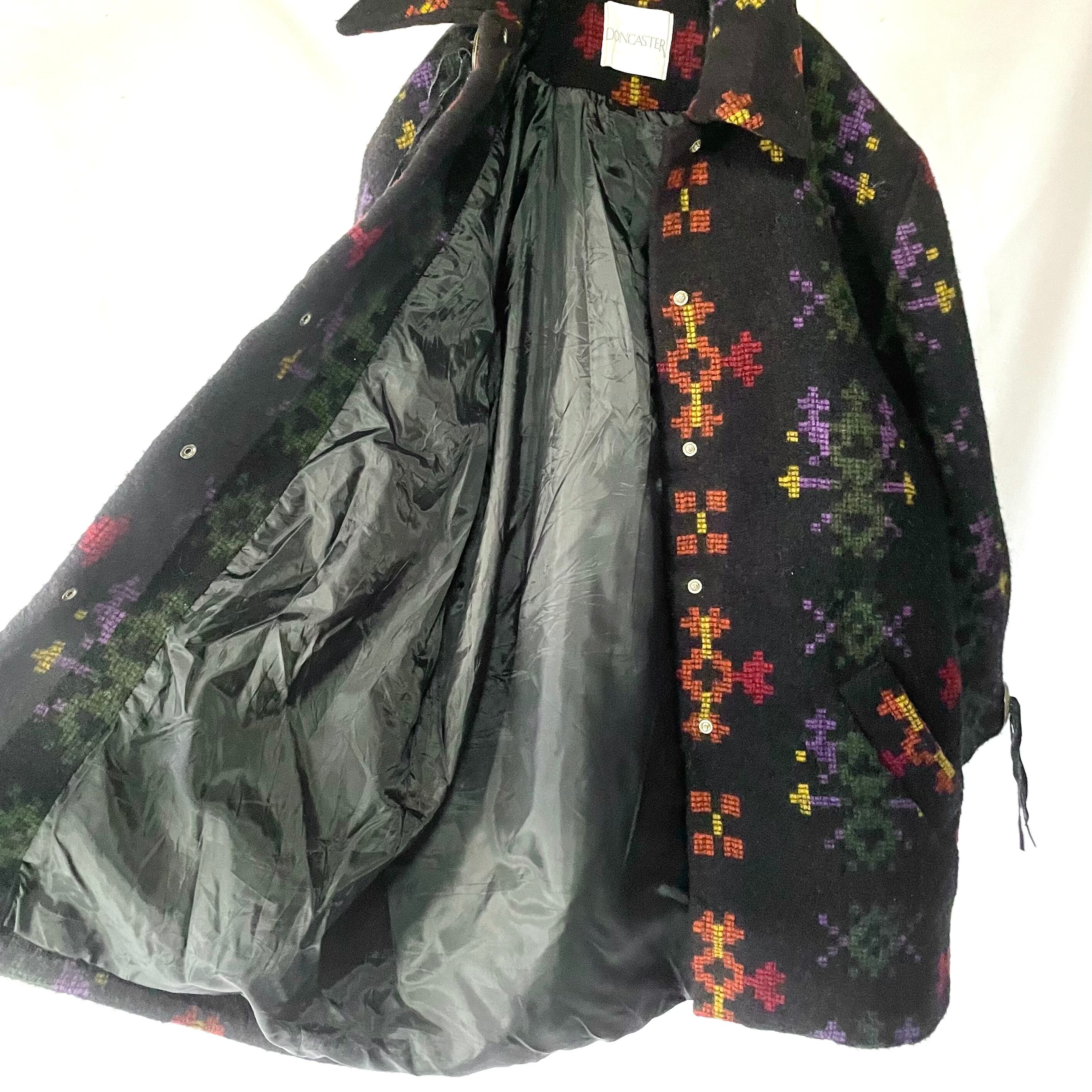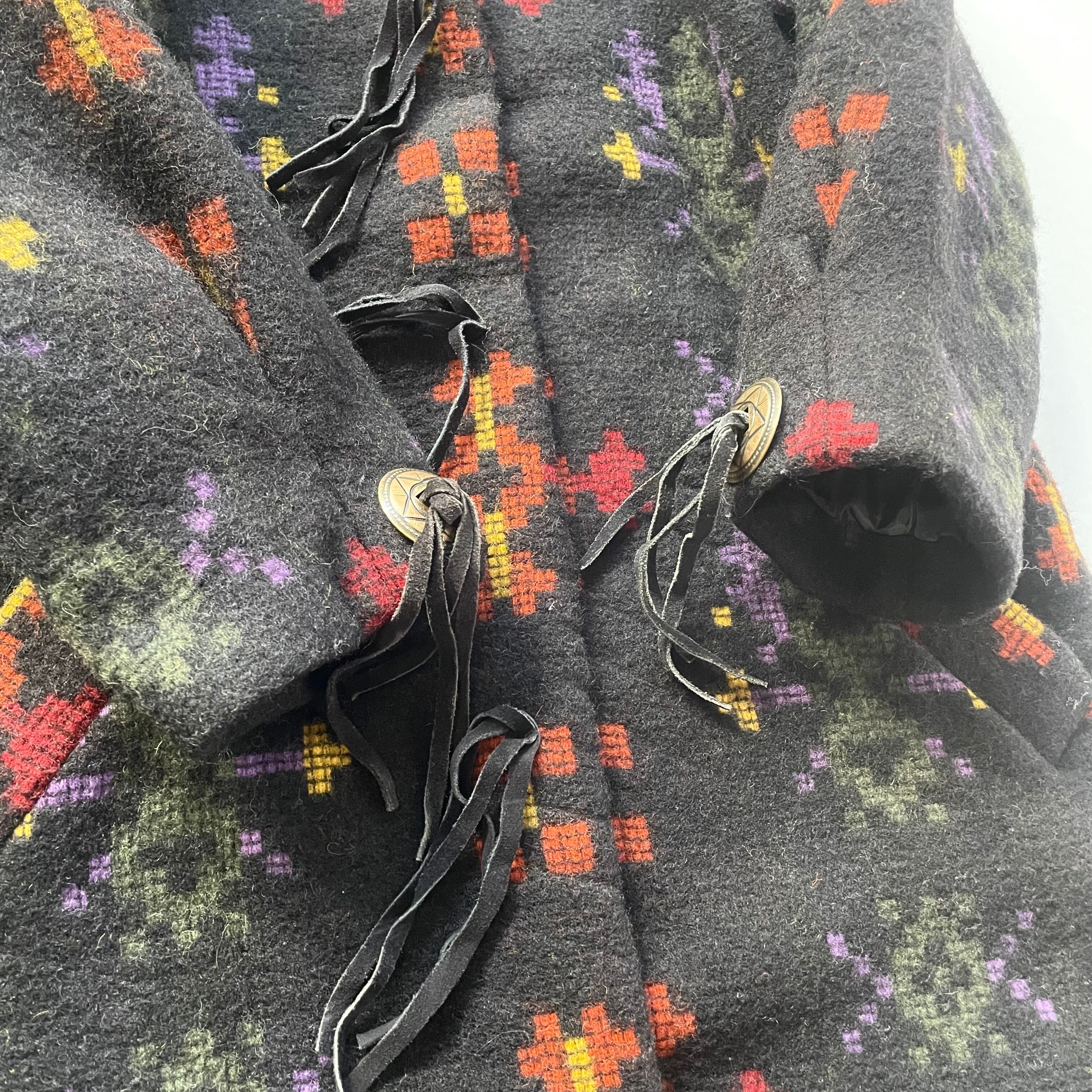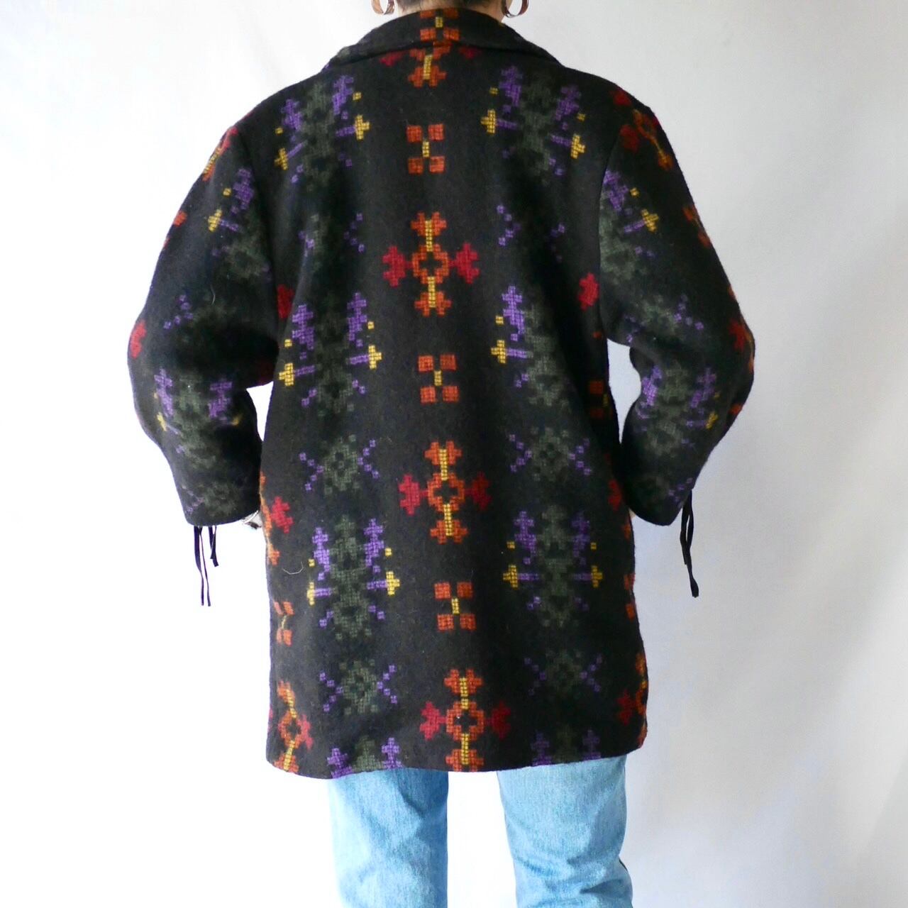 コンチョ、フリンジ装飾がかわいい、アメリカ製 黒×ネイティブ柄 ウールコートです。ポケット付き。ナイロンが少し入っており、重たくないコートです。