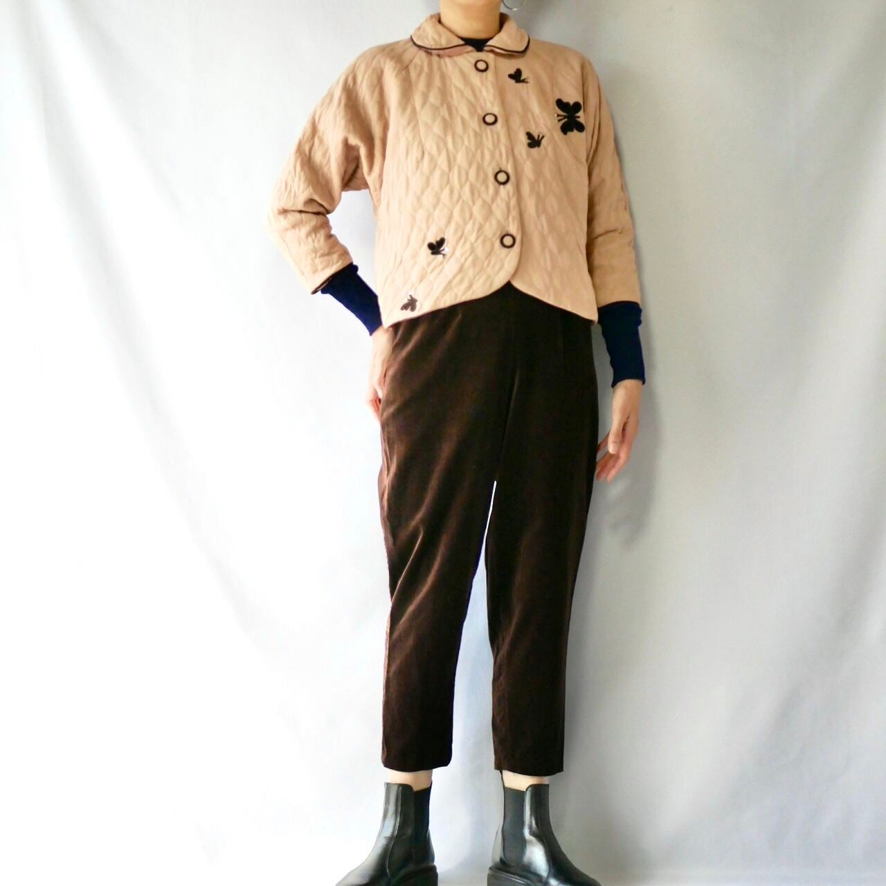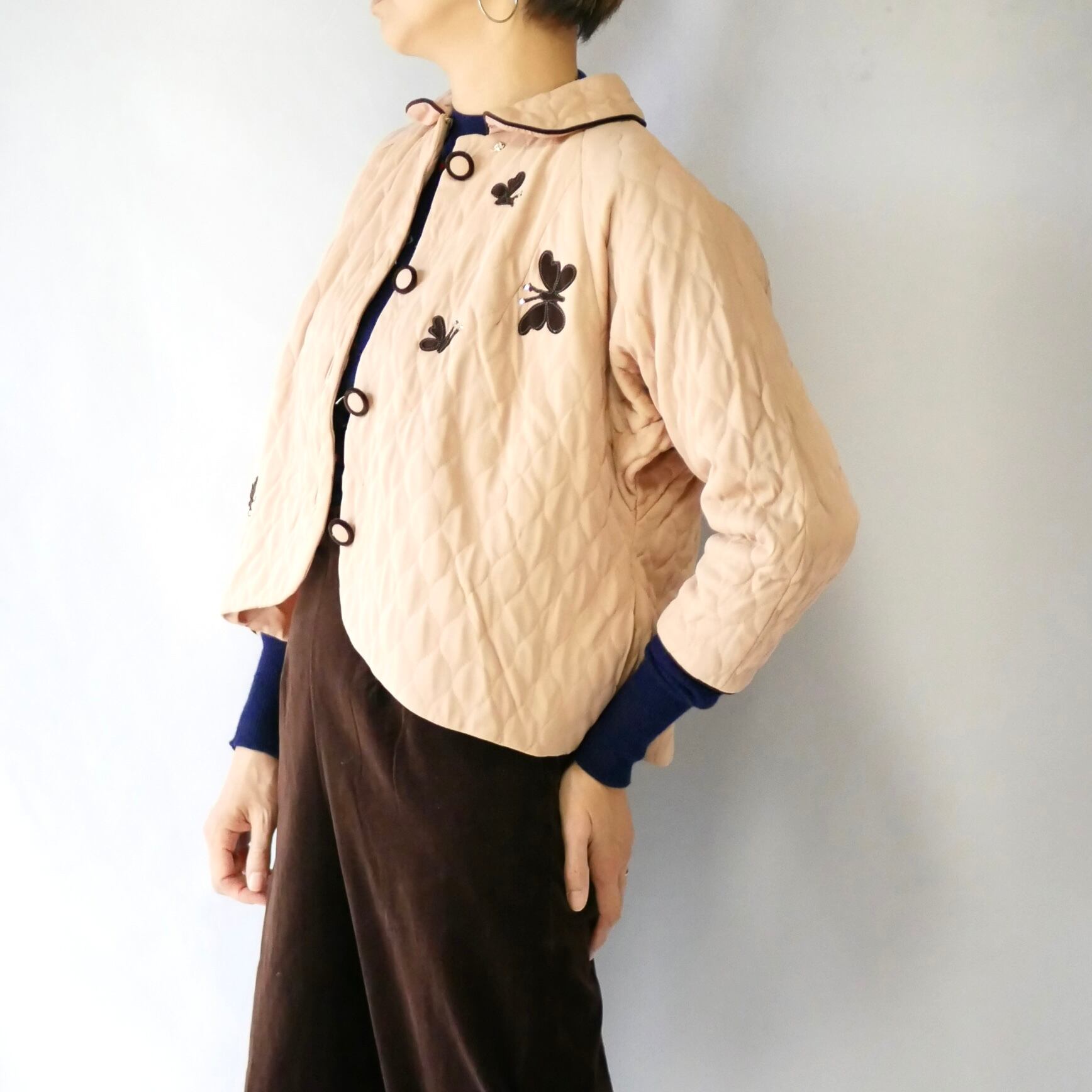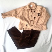 トップはヌードベージュにブラウンの蝶々、ビーズ装飾入りのキルティングジャケット、ボトムはベロア地のクロップドパンツの50年代ヴィンテージ セットアップです。ポケット付き