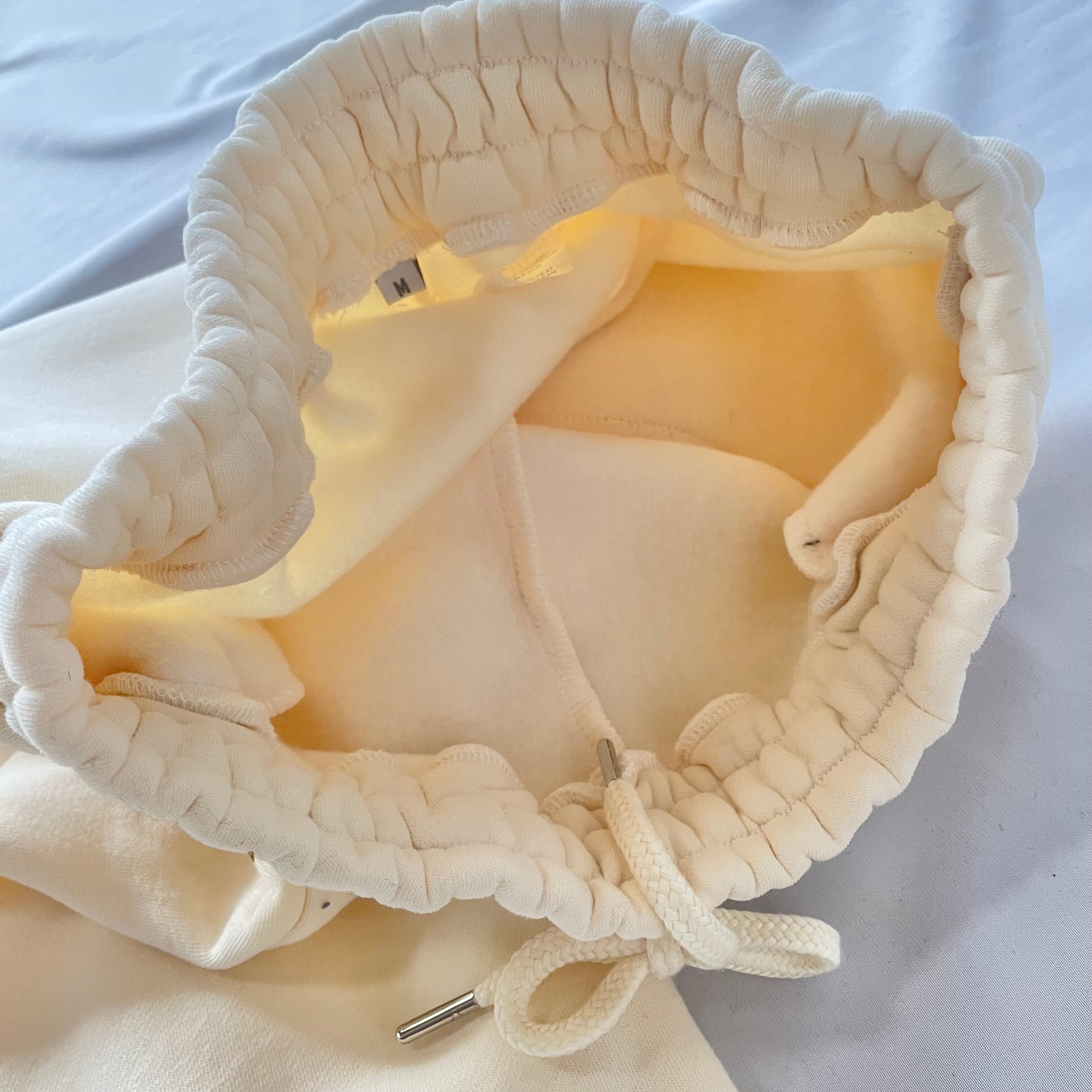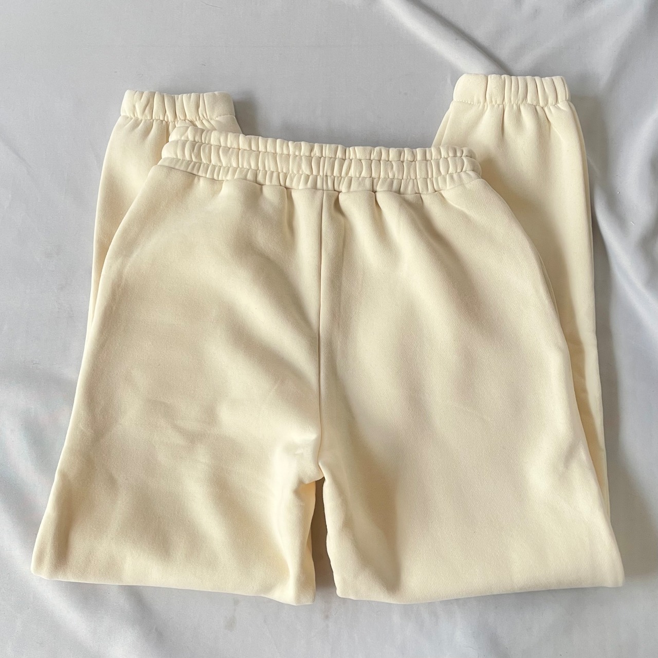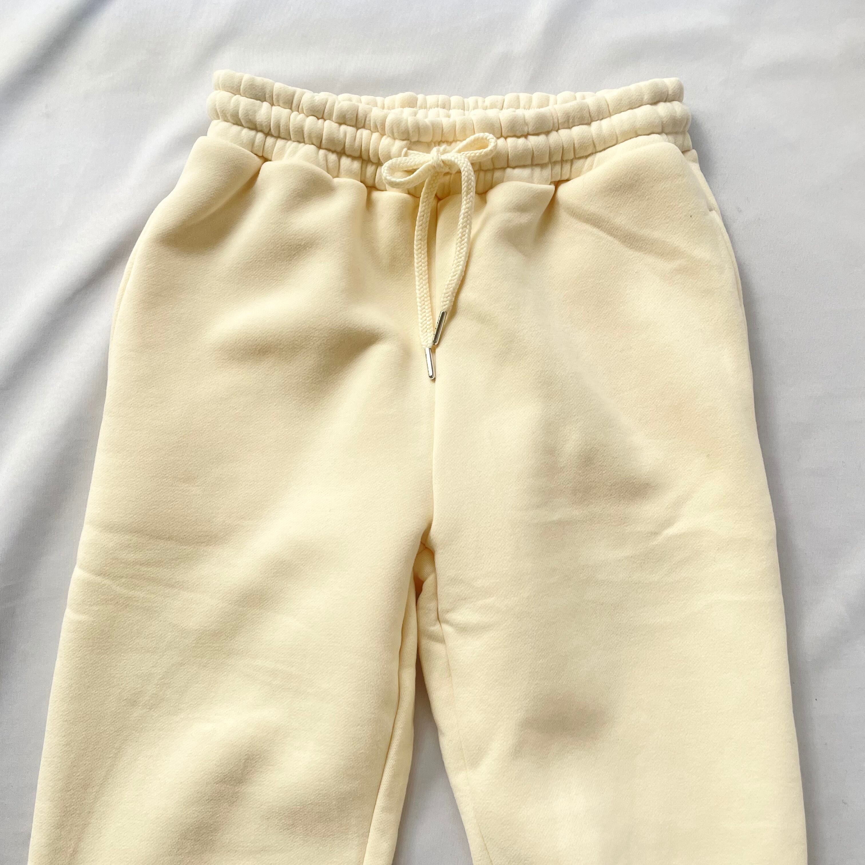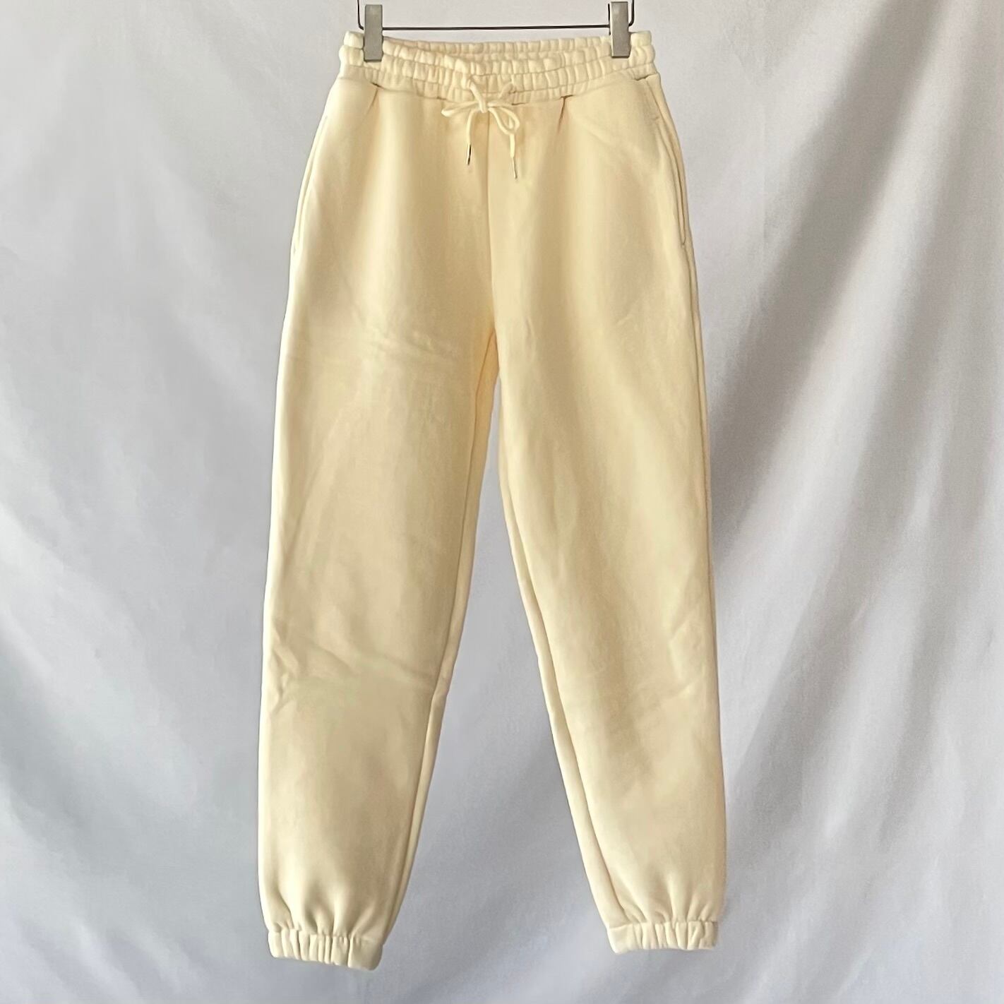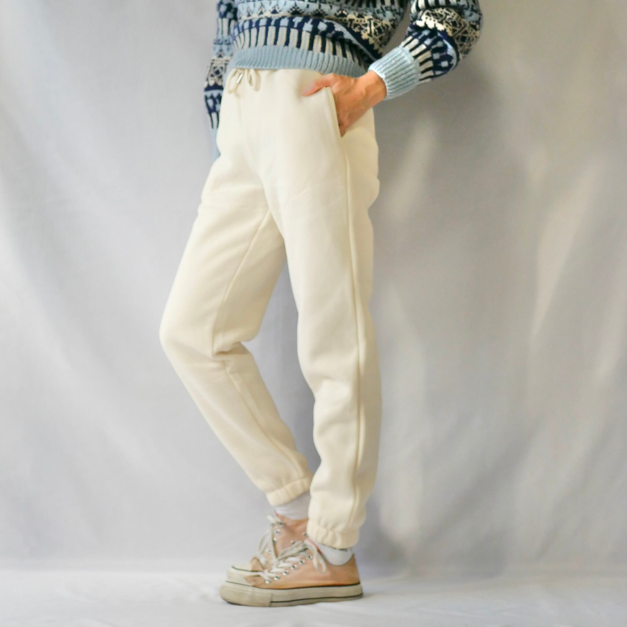 すっきり細身に履けるシルエットのきれいなアイボリーの裏起毛スウェットパンツです。ポケット付き。