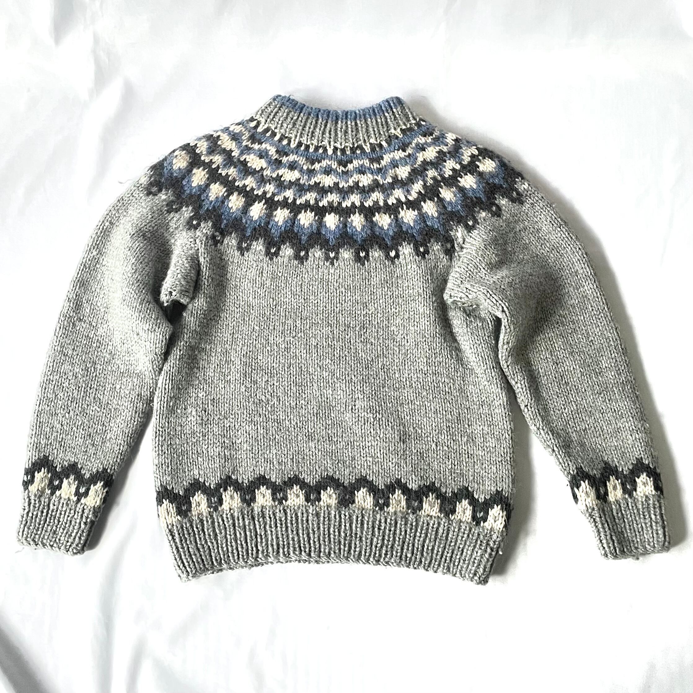 グレー×ブルー ヴィンテージ ノルディックニットです。柔らかく分厚い、ウール100%と思われる質感です。