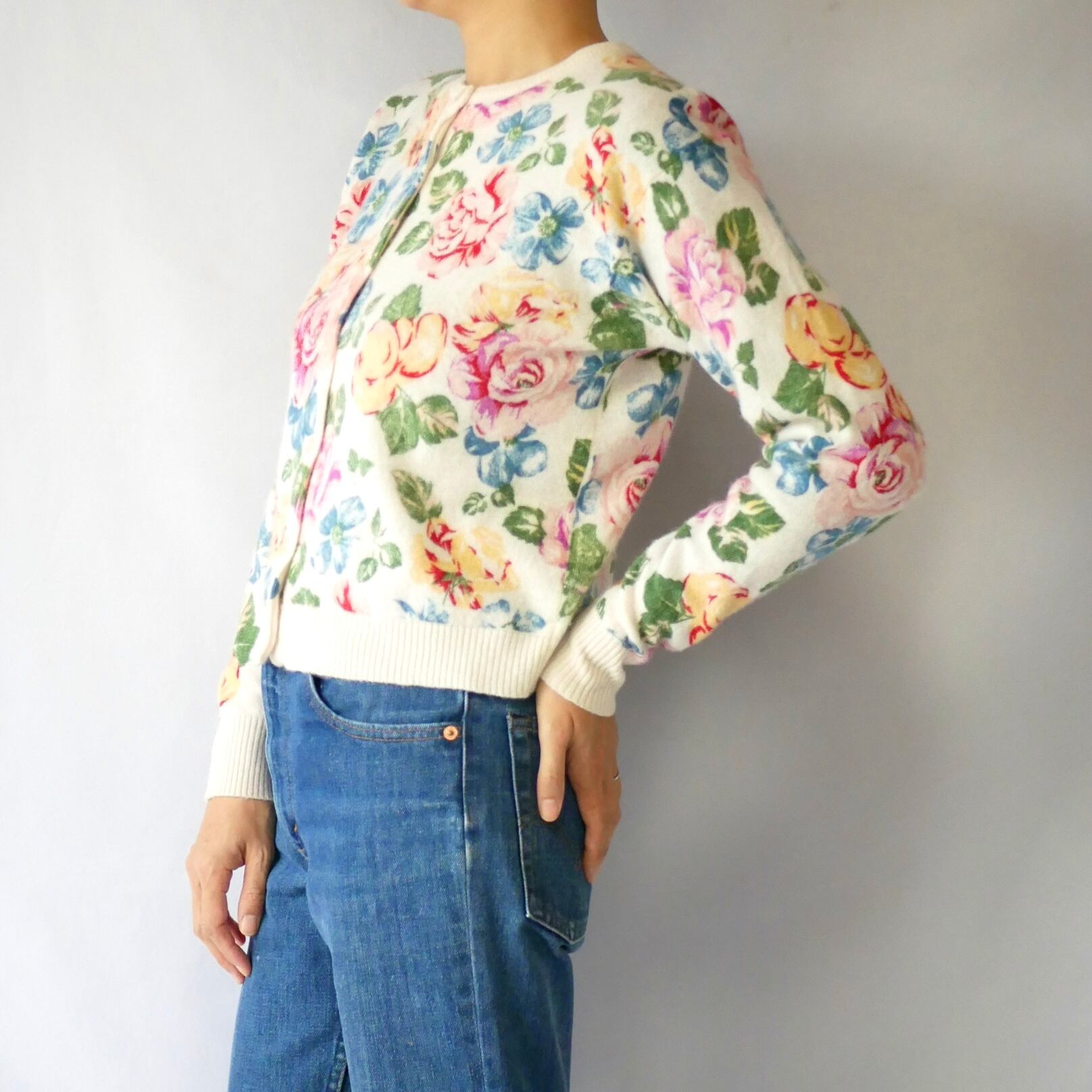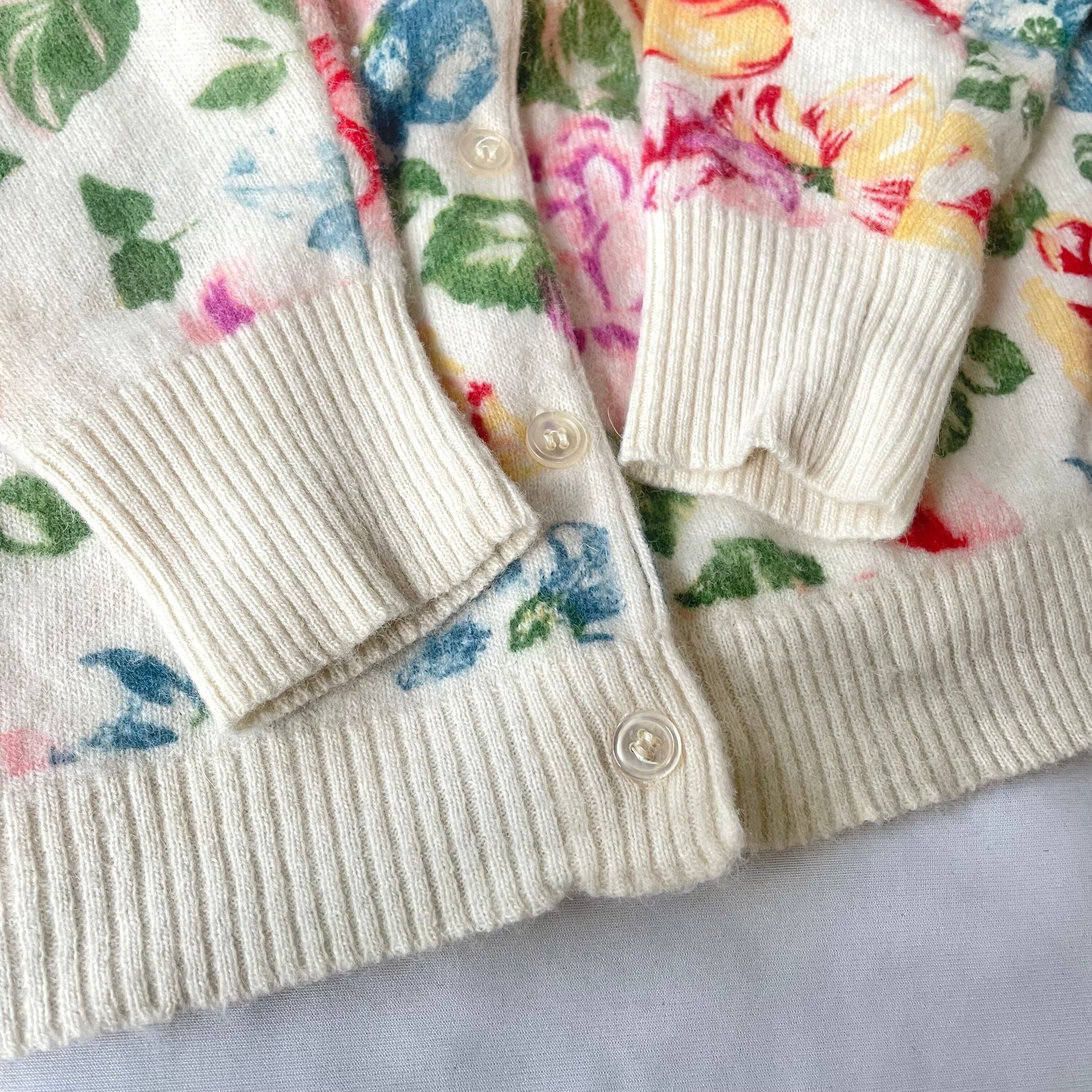 薄手ですがアンゴラ混でふんわりとしている、アイボリー×カラフル花柄ニットカーディガンです。