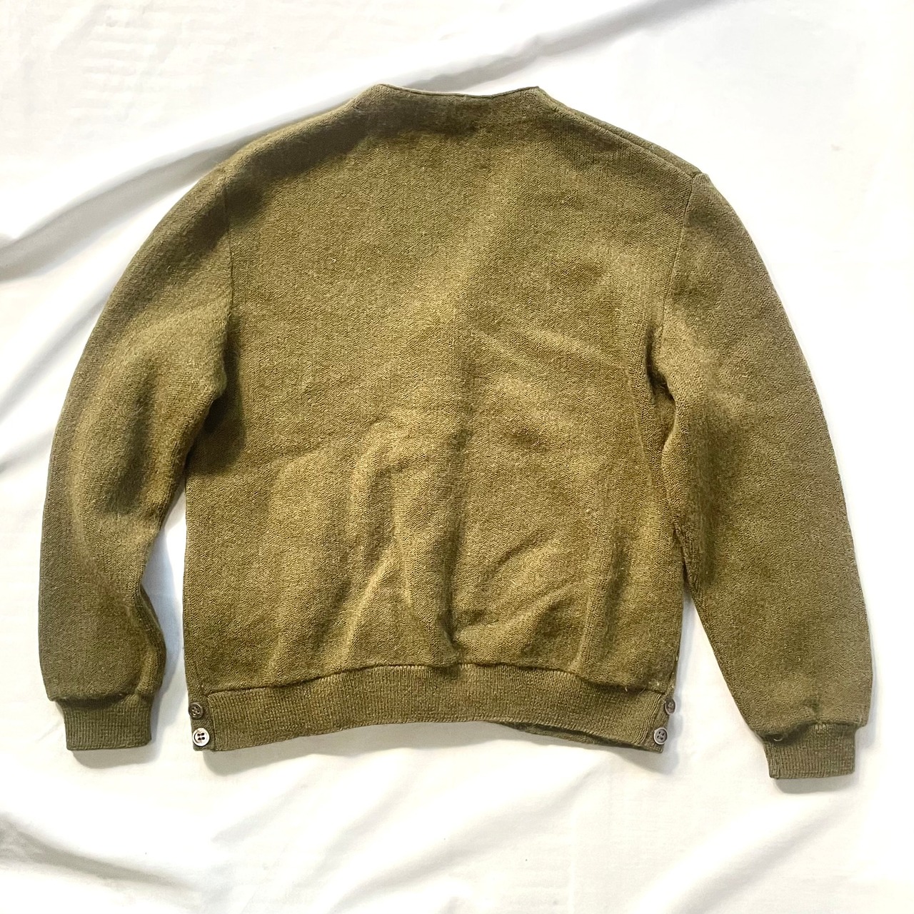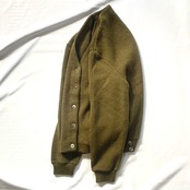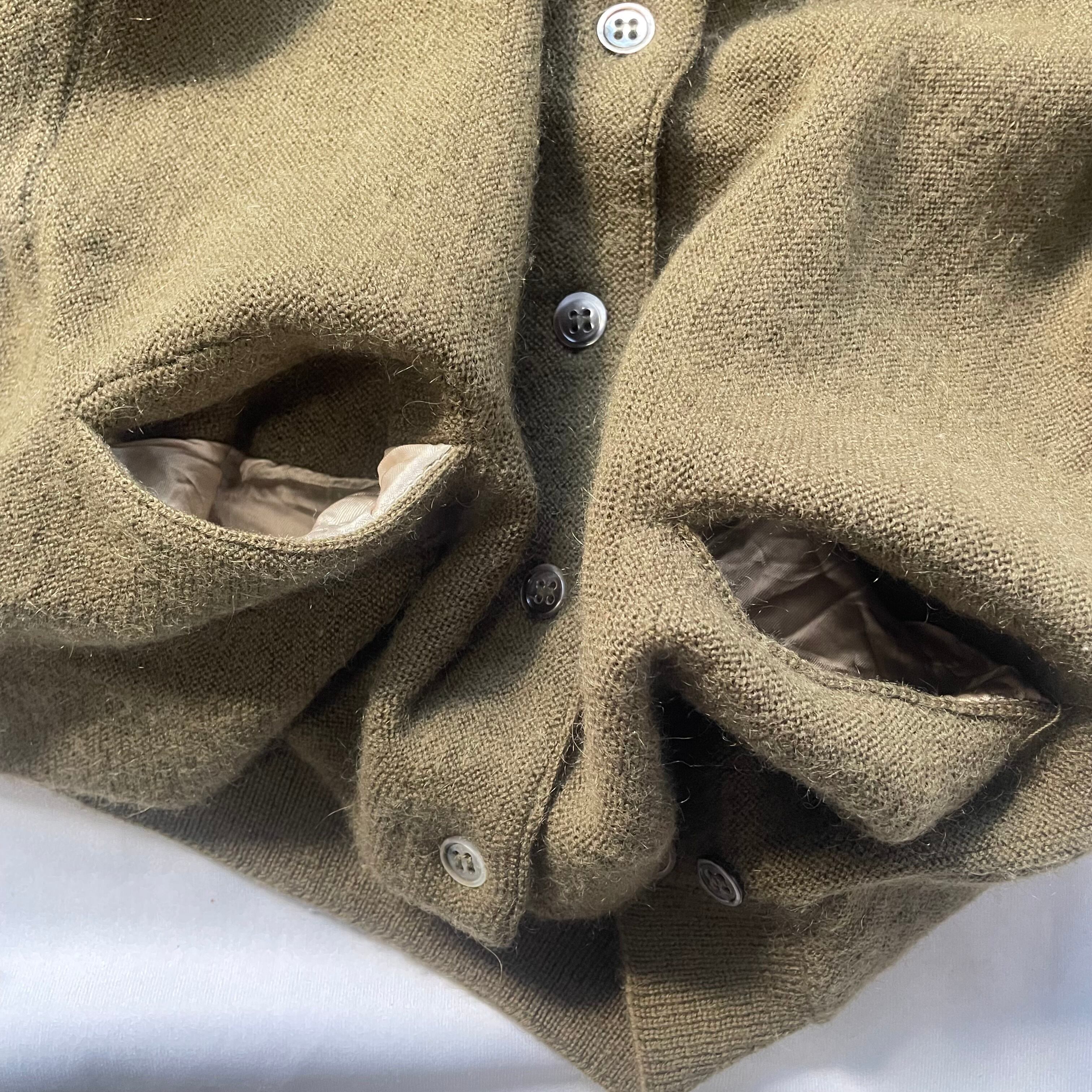 カーキがかった深緑のヴィンテージアクリルニットカーディガンです。裾リブサイドにボタン付き。ポケット付き。