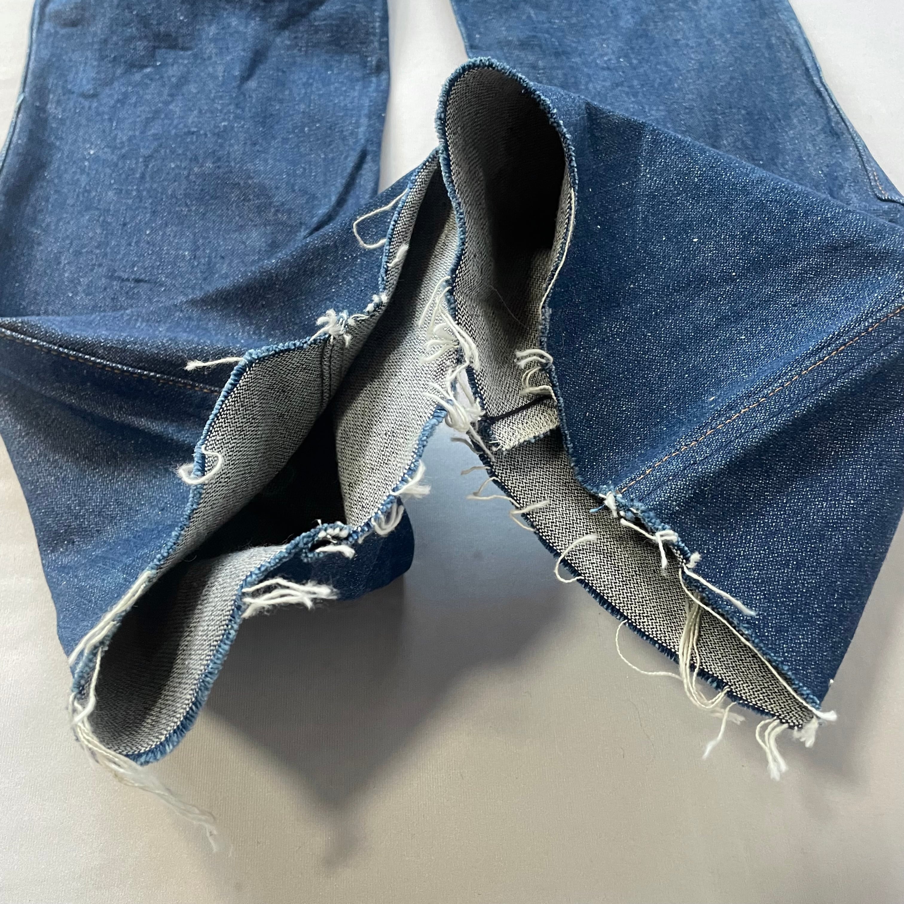 80年代頃のヴィンテージ ラングラー ブーツカット\フレアシルエット 裾切りっぱなし濃紺デニムパンツです。talon zipper