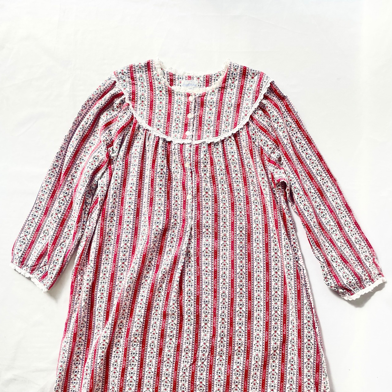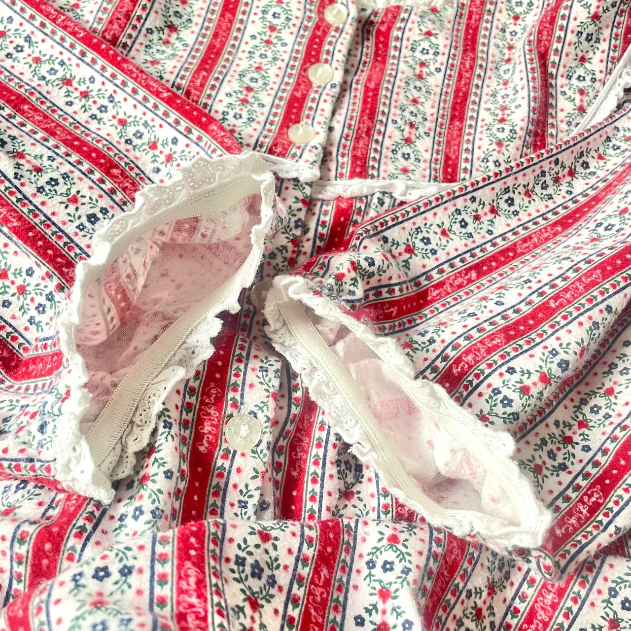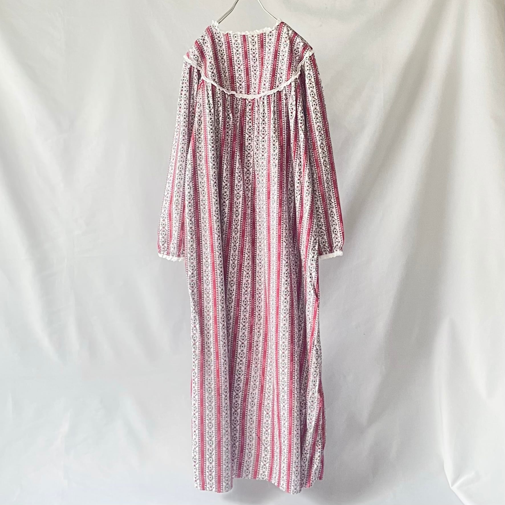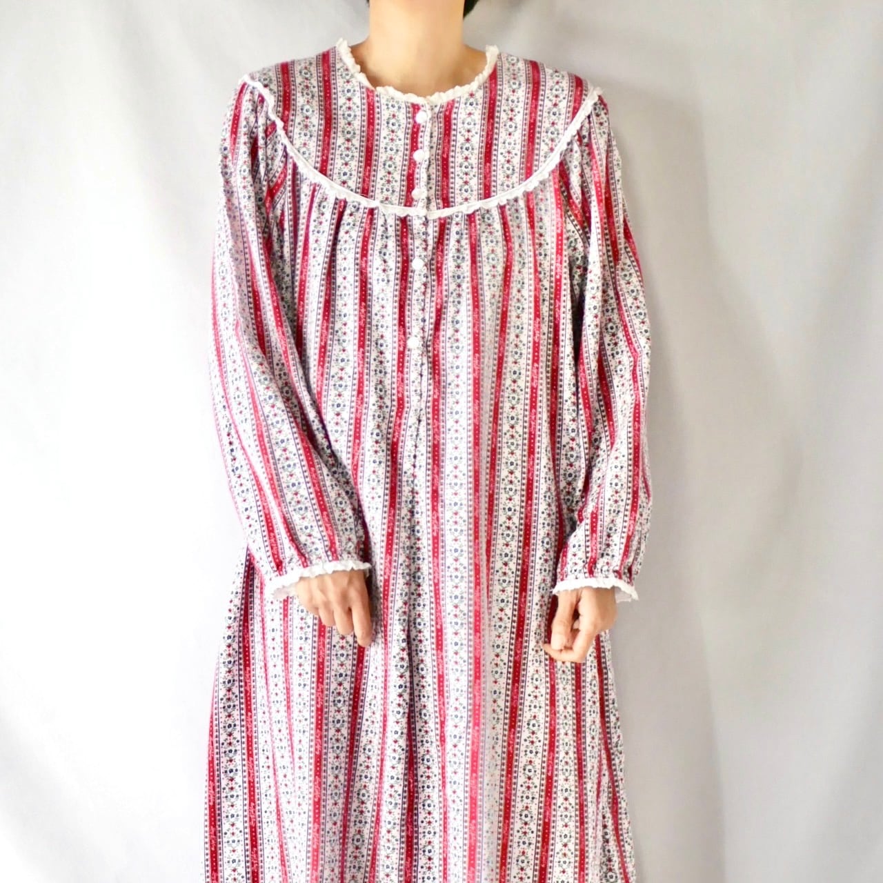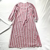 赤いストライプ花柄のコットン100%フランネル地がとても可愛い長袖マキシ丈ワンピースです。Lサイズでゆったり着られます。