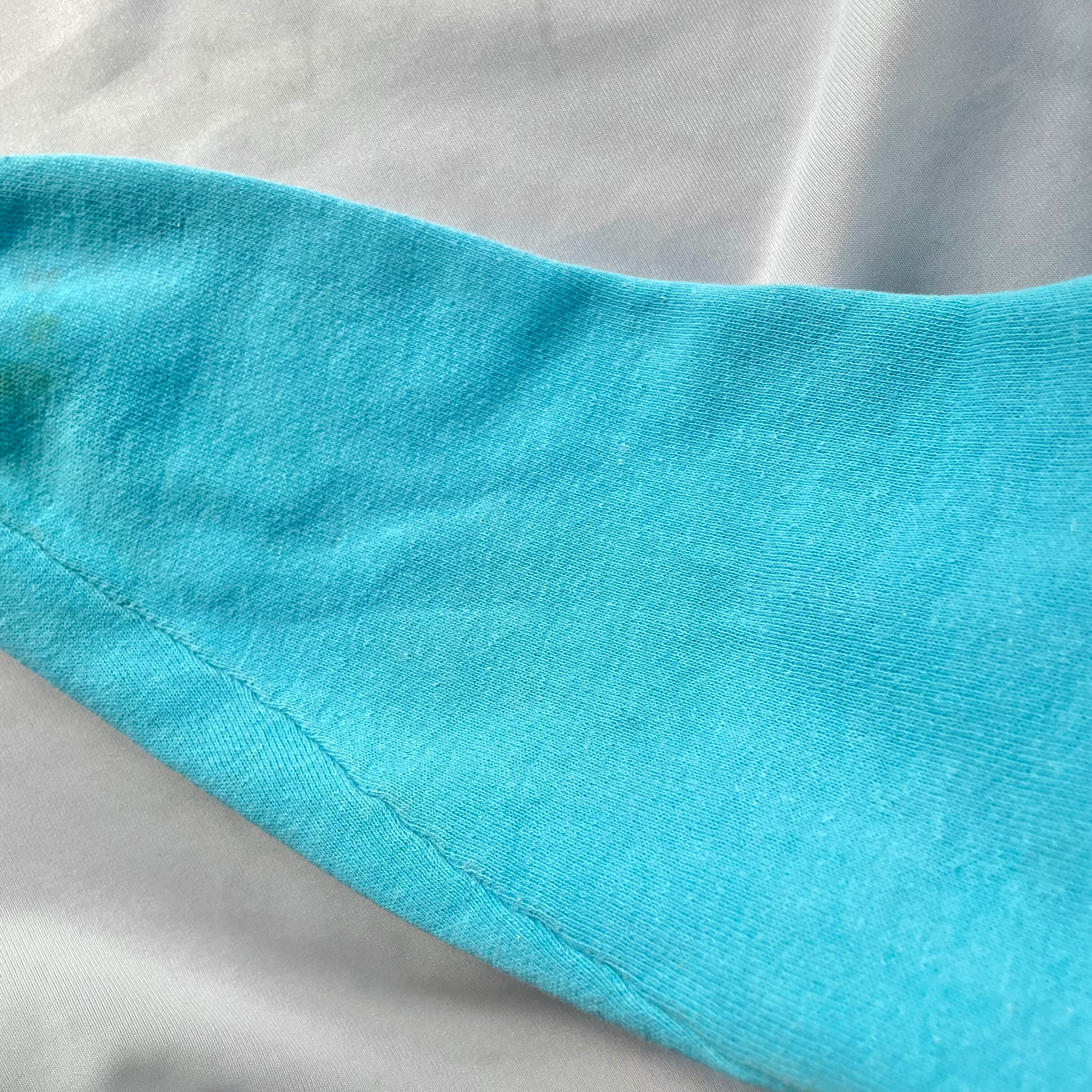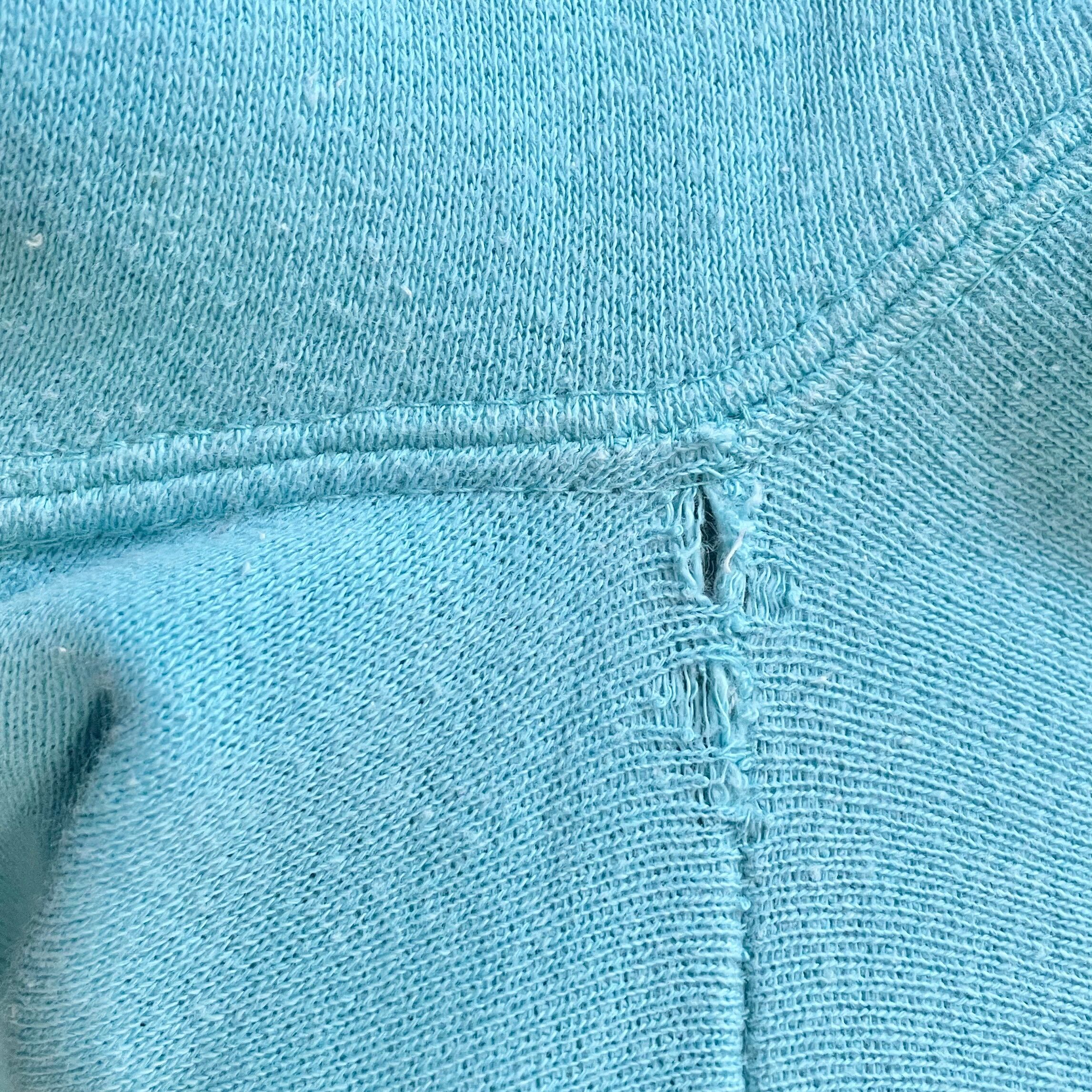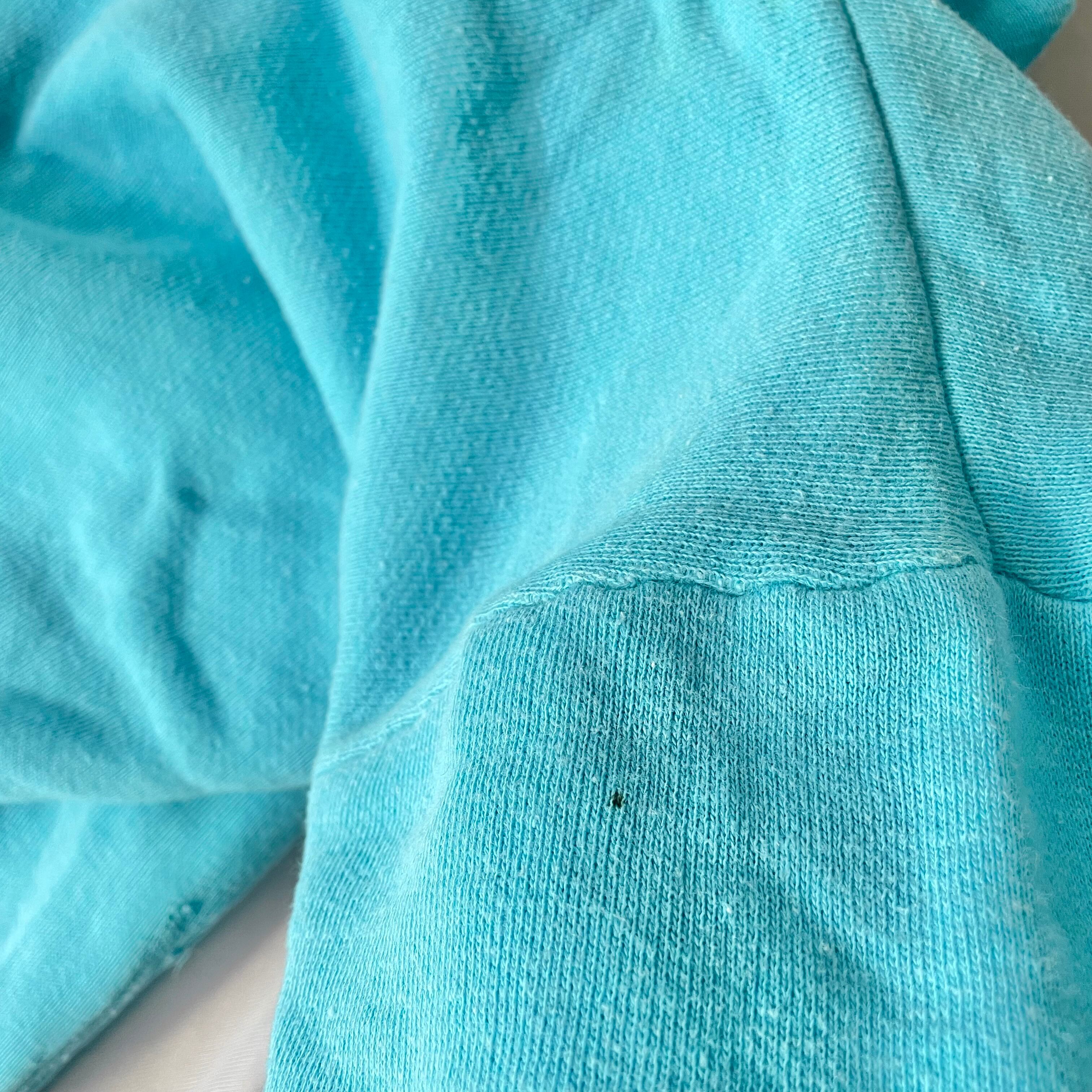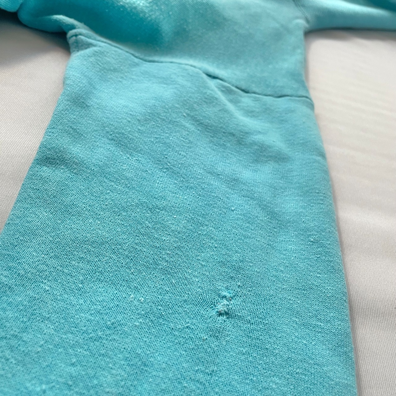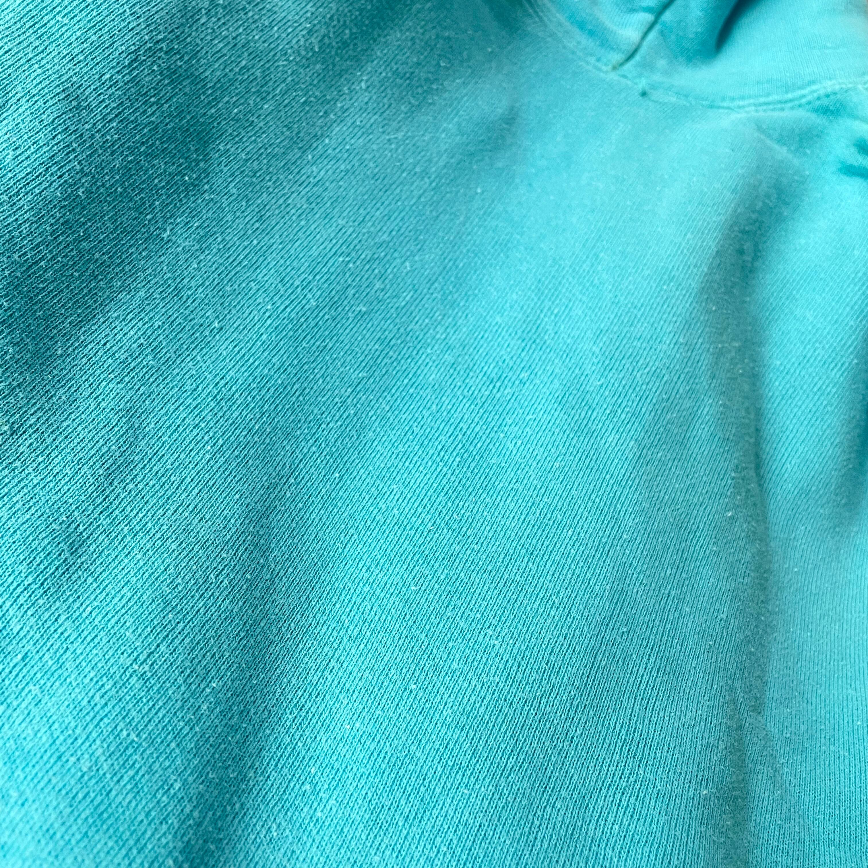きれいなターコイズカラーが目を惹く、60年代ヴィンテージ セパレートポケット ジップアップ スウェットパーカーです。ヴィンテージスウェットは特に中々見つかりにくく、大変希少なアイテムとなります。素材はコットン100%で間違いないと思います。