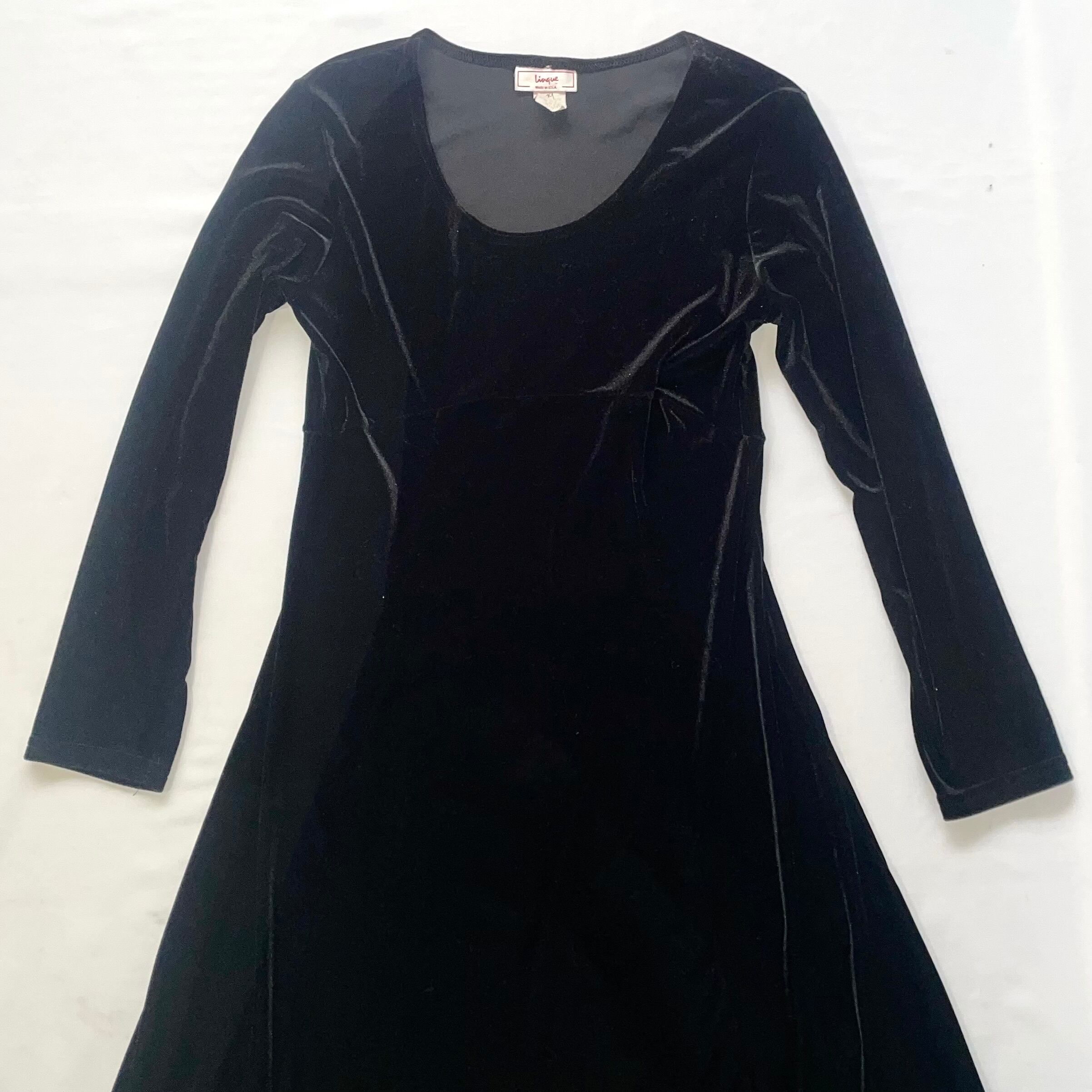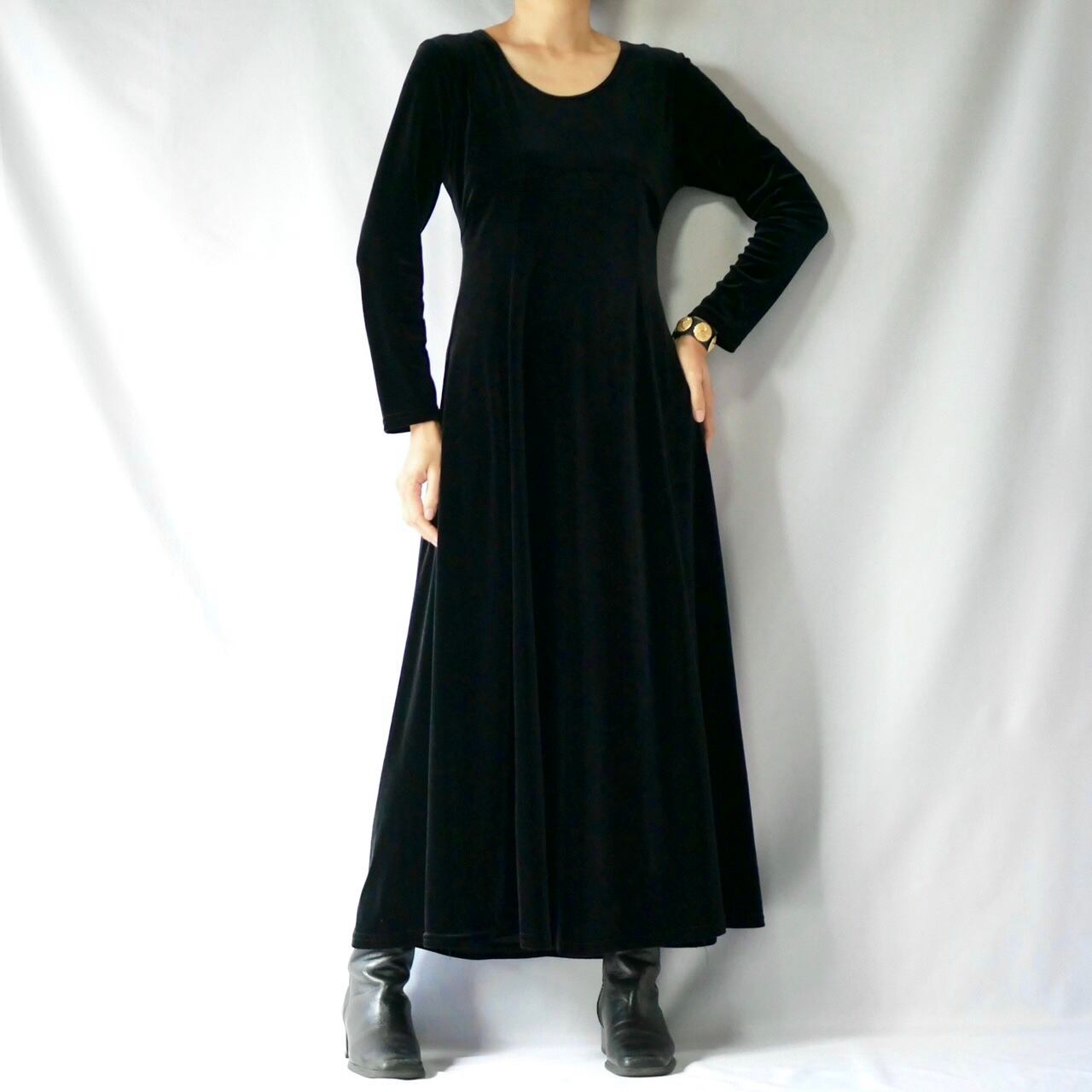 裾に向かって広がるフレアシルエット、シンプルなデザインでずっと着られそうなアメリカ製黒ベロア地マキシ丈 長袖ワンピースです。