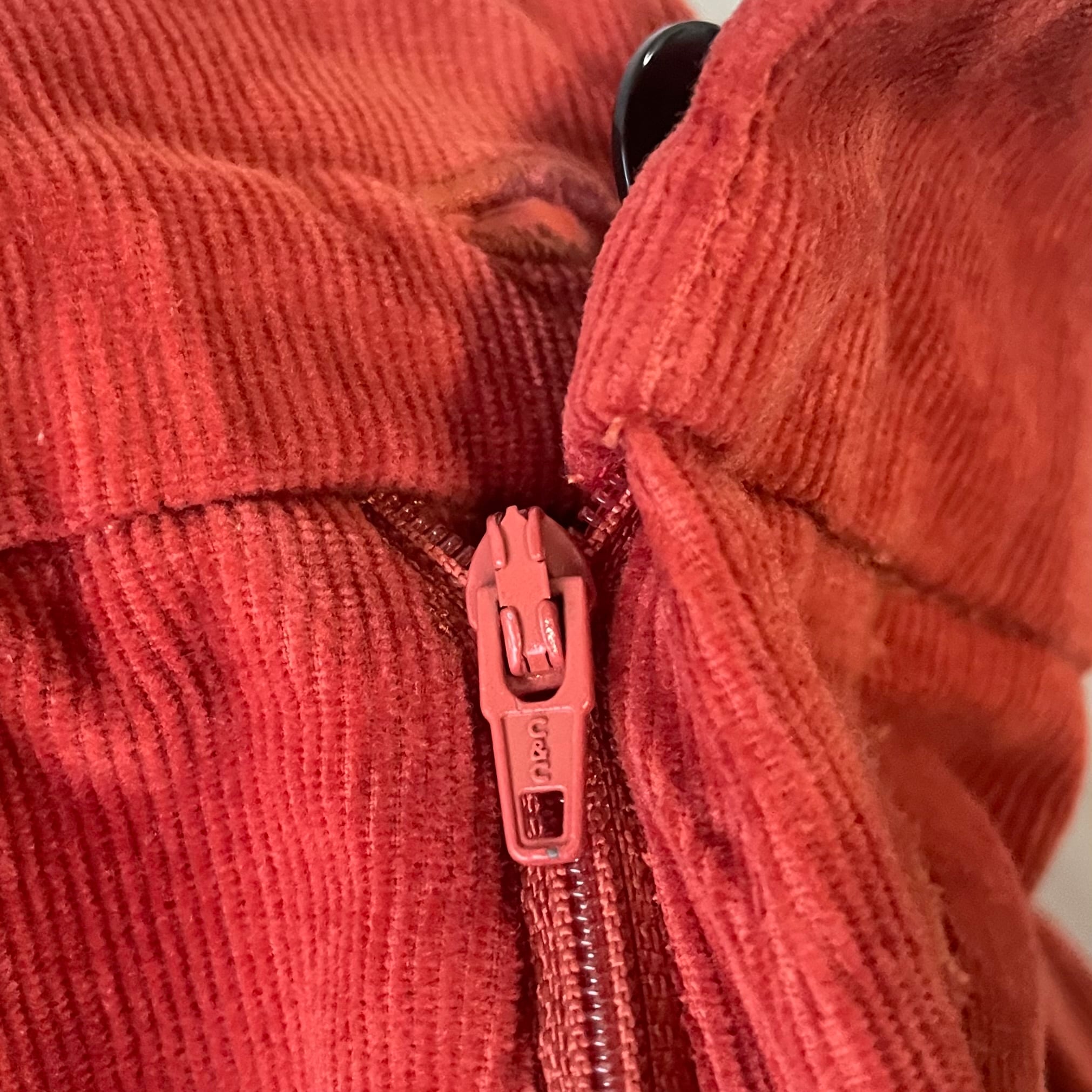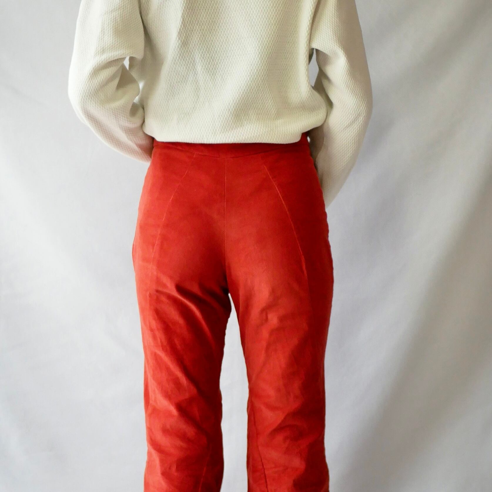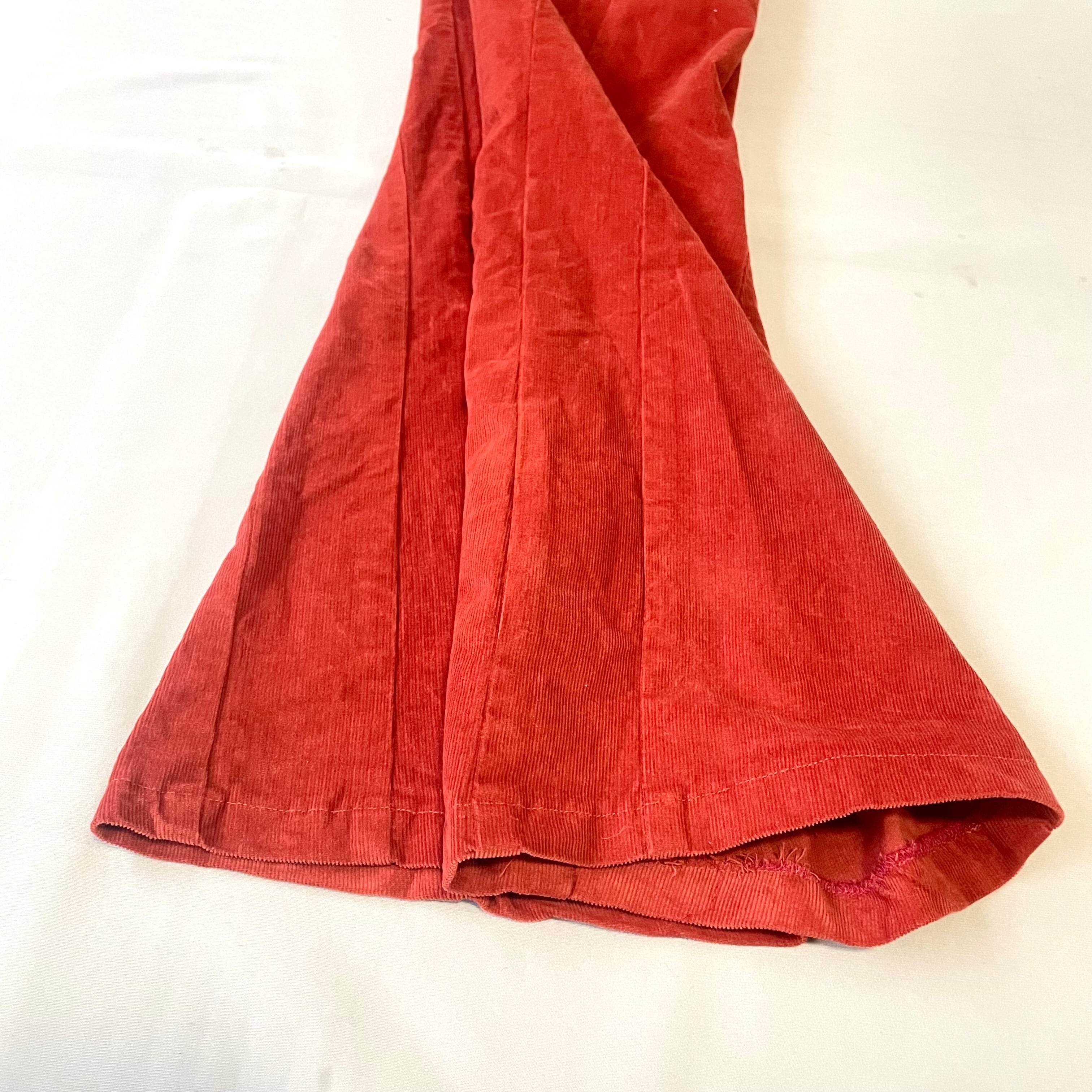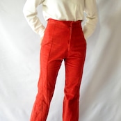 鮮やかなオレンジ色が素敵な伸縮性のあるストレッチ素材のコーデュロイフレアパンツです。ハンドメイドと思われる造りです。