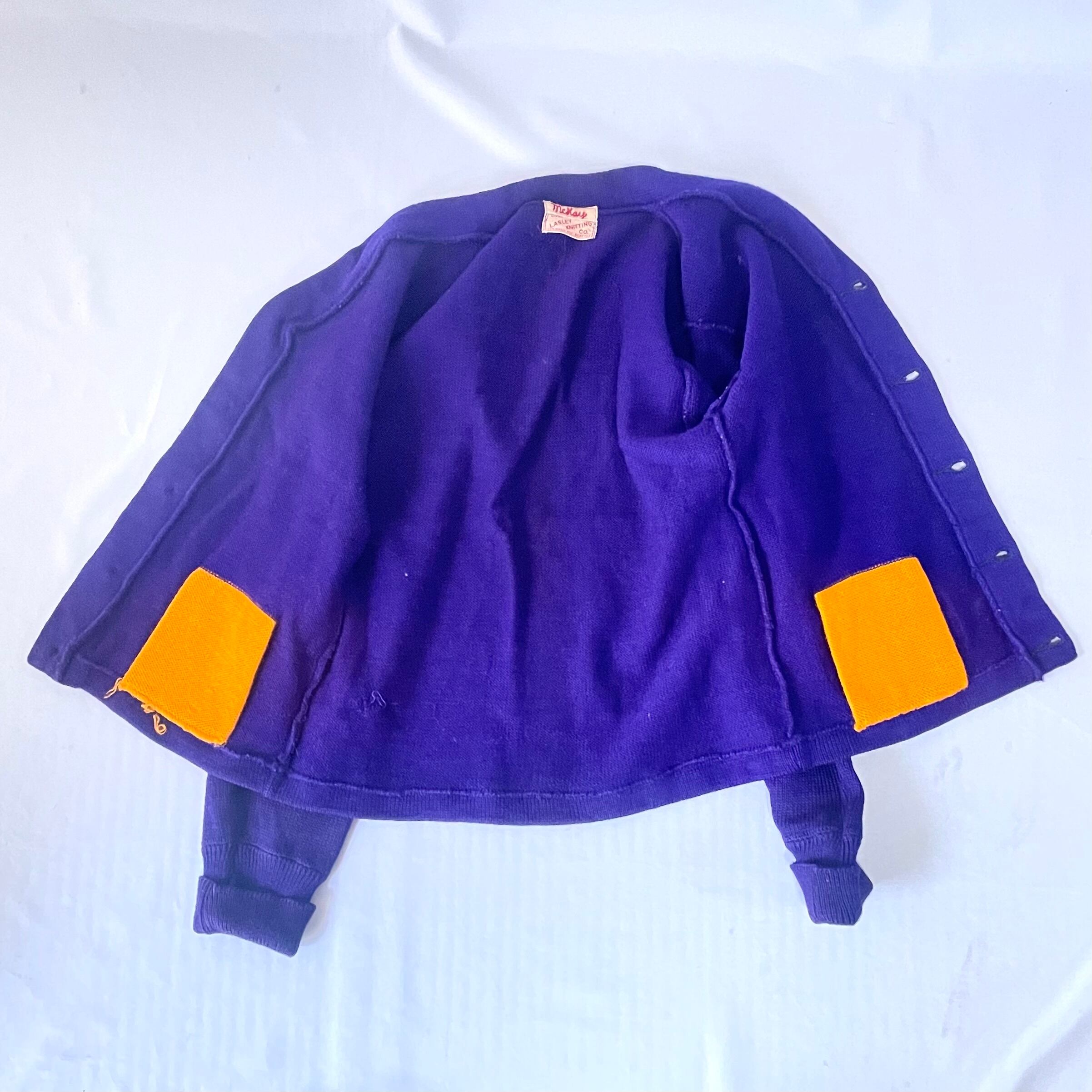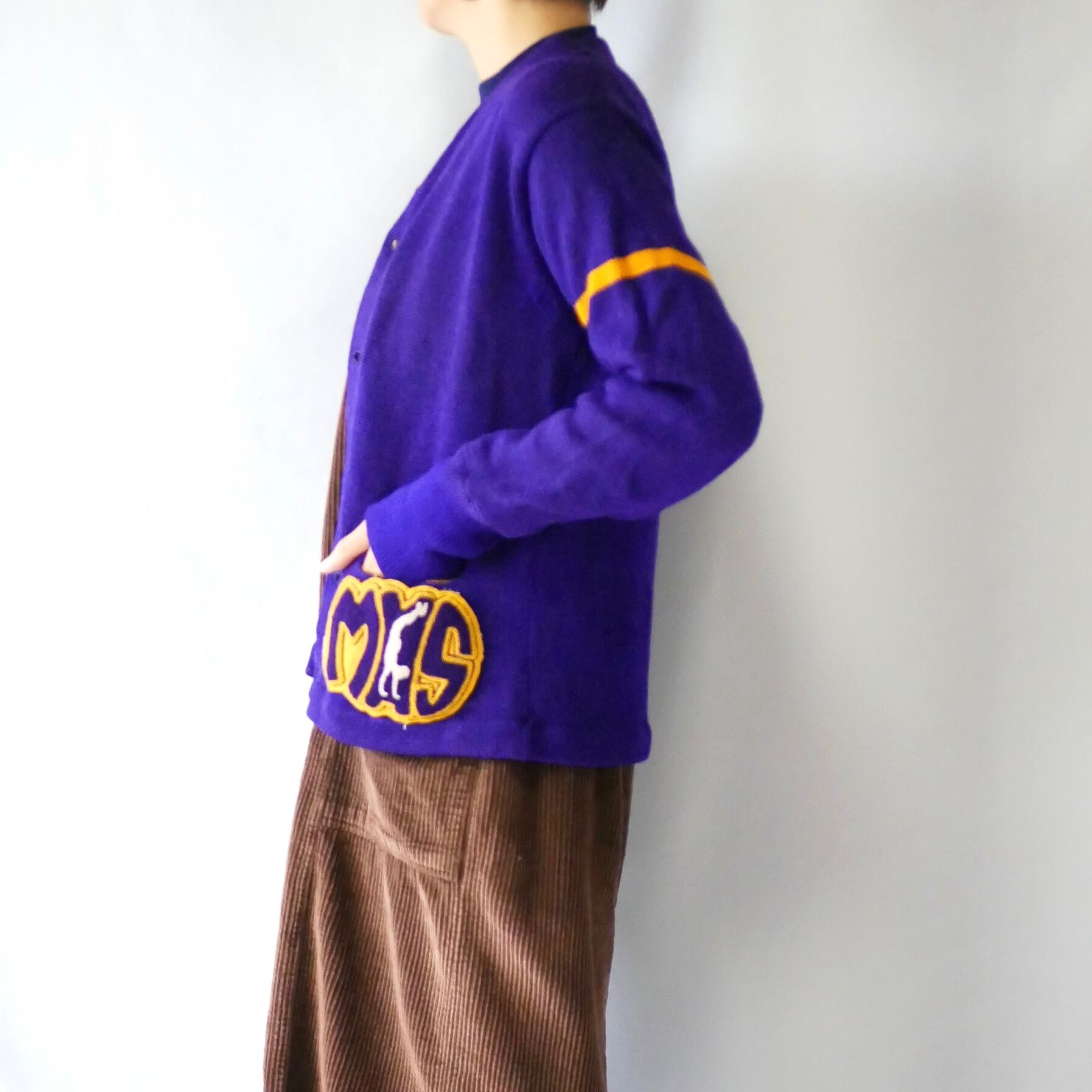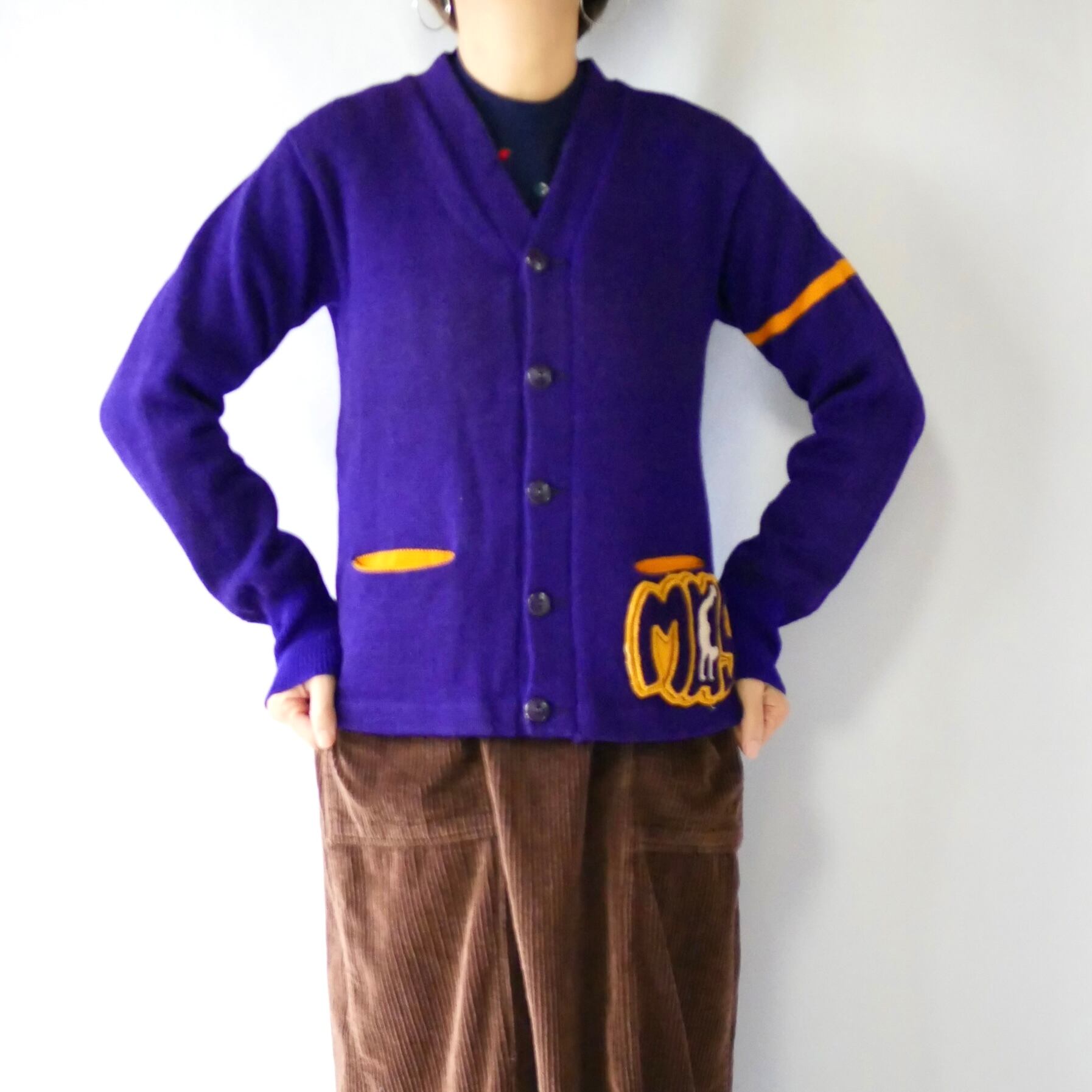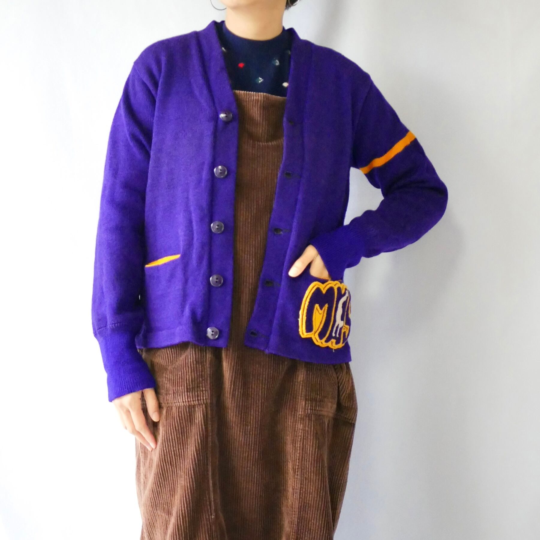 パキっとしたパープルにイエローのワッペン、ライン入りがヴィンテージらしくてかわいい、5,60年代ヴィンテージ バージン ウール100% レタードニットカーディガンです。ぎゅっと詰まった編地やボタンも、新品には出せない風合いで素敵です。