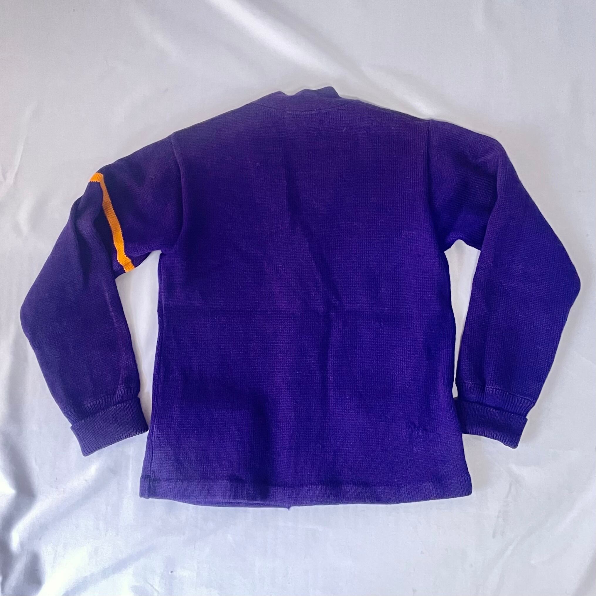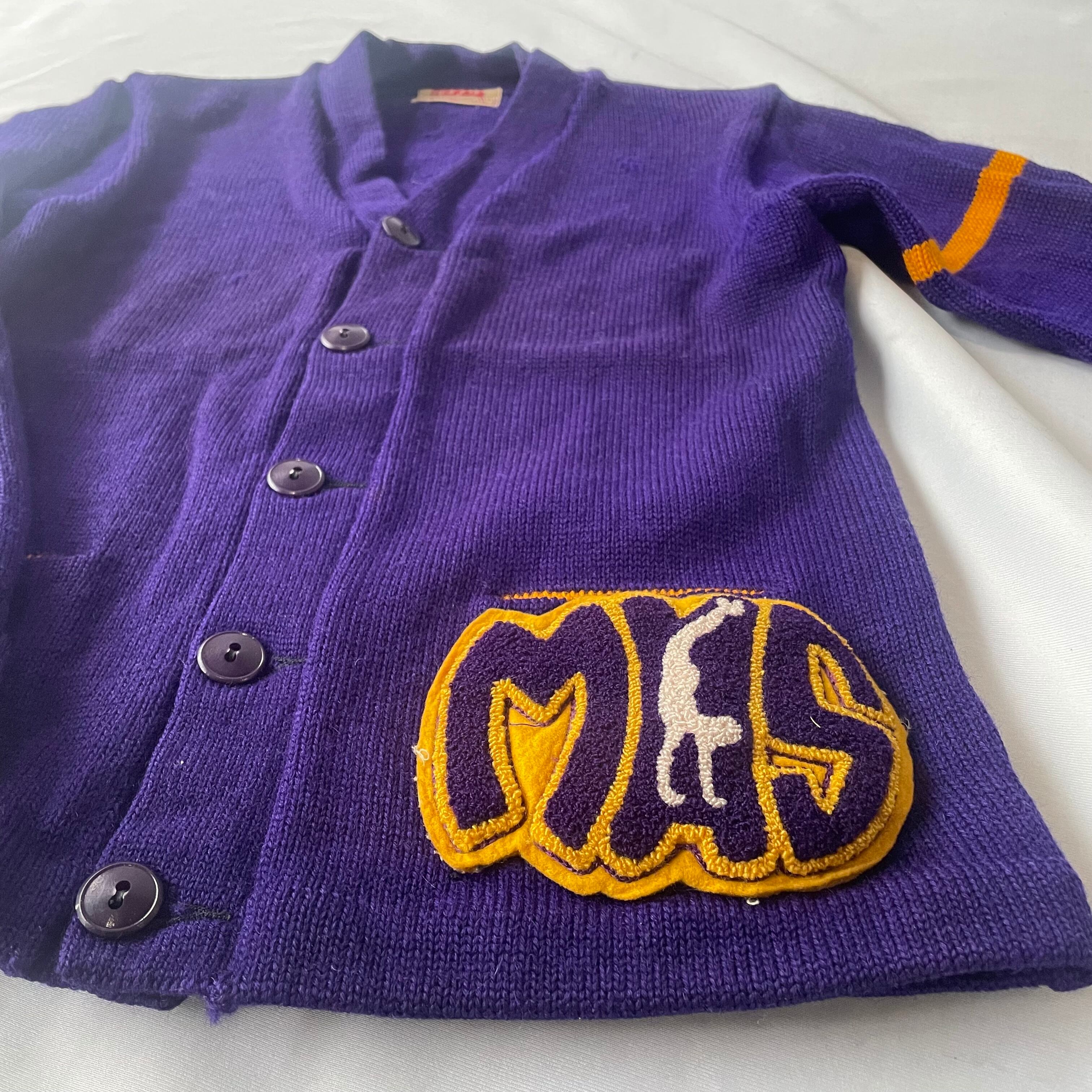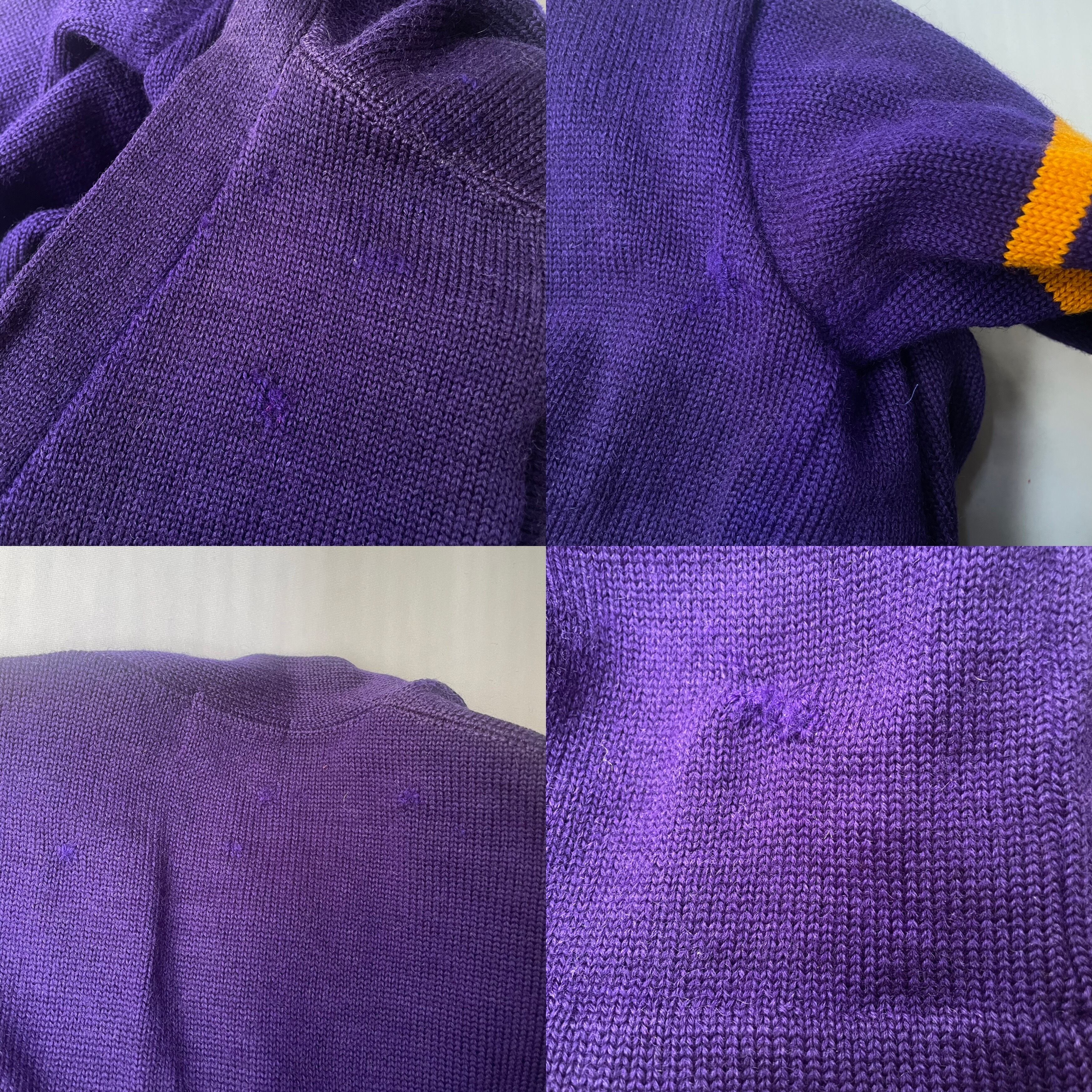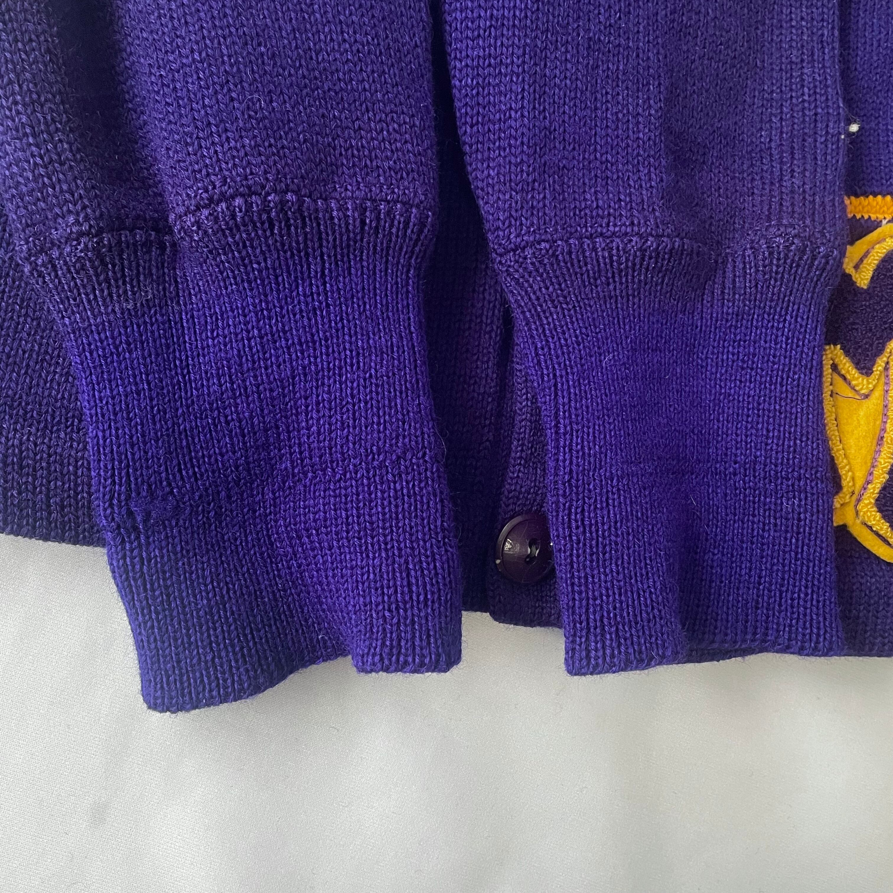 パキっとしたパープルにイエローのワッペン、ライン入りがヴィンテージらしくてかわいい、5,60年代ヴィンテージ バージン ウール100% レタードニットカーディガンです。ぎゅっと詰まった編地やボタンも、新品には出せない風合いで素敵です。