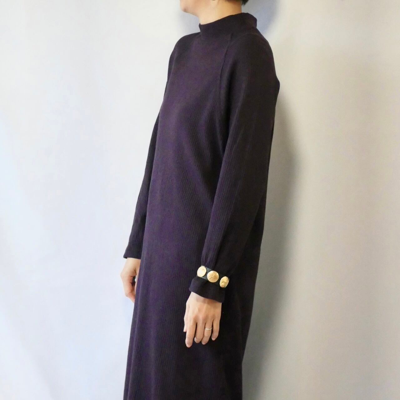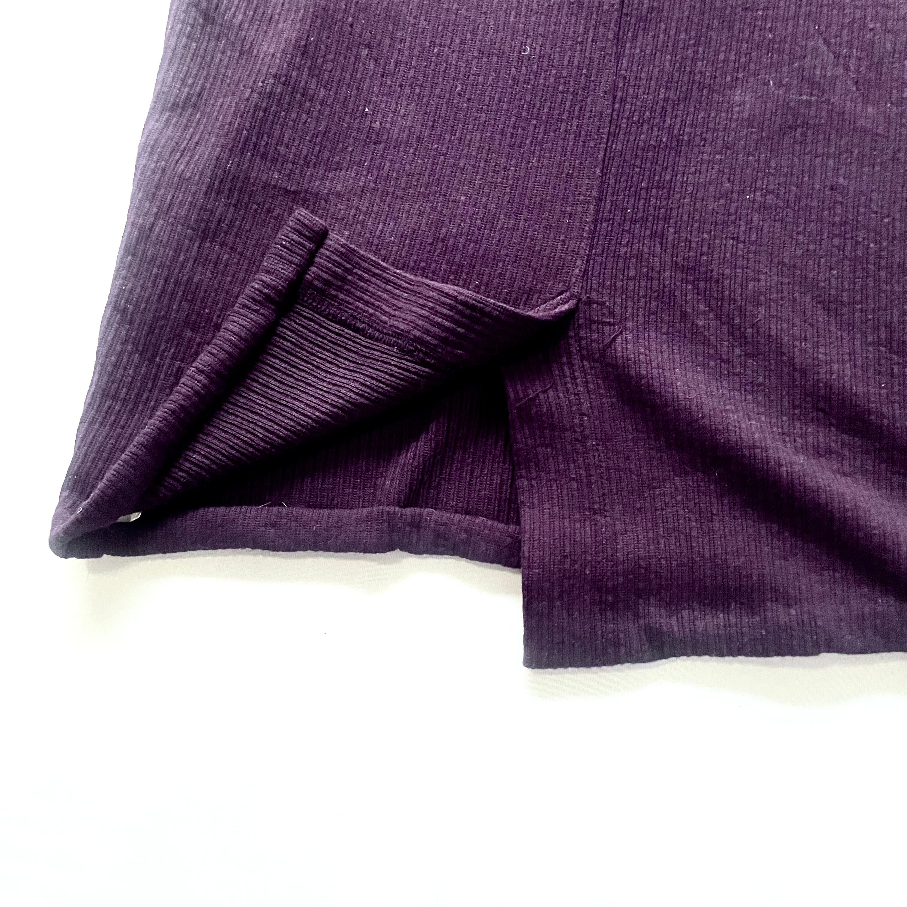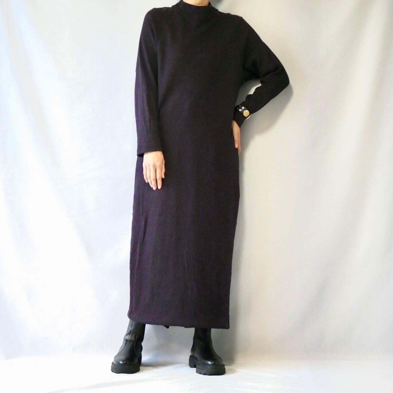 縦リブ編みのコットン地が可愛いダークパープルのアメリカ製ハイネック長袖マキシ丈ワンピースです。後ろ中央が若干長いフィッシュテールのようなシルエットに裾げされています。
