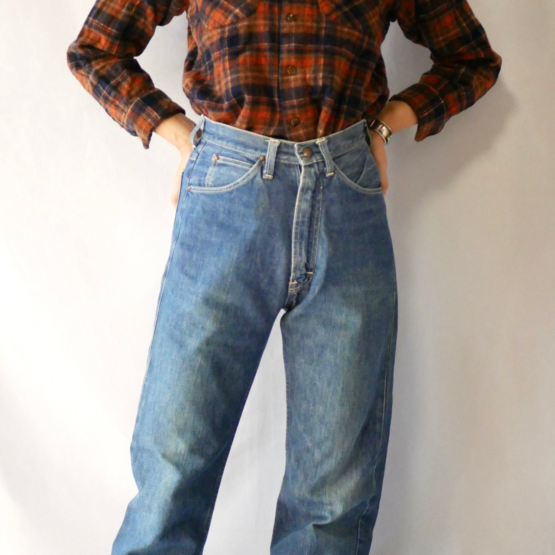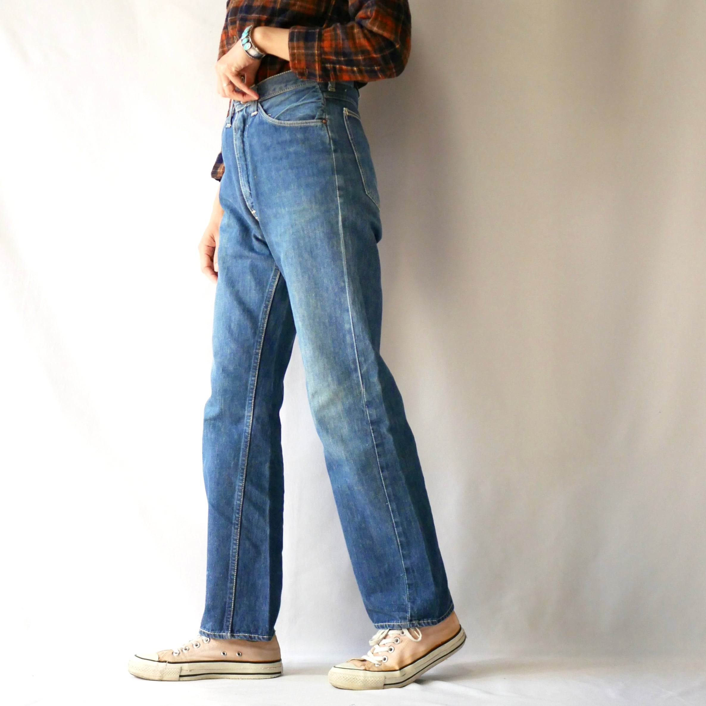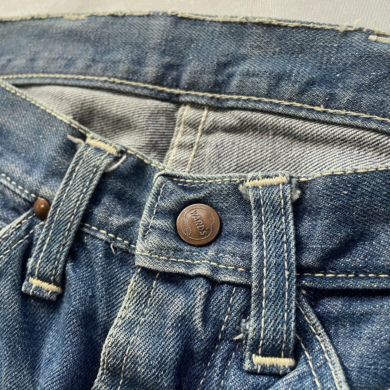 ウエストのスナップボタンはボーイズ物やレディースに使われる事の多い、可愛らしい装飾にwardsという刻印入りの物が使われており、ハイウエストでスタイル良く履けるシルエットで、女性にお勧めなヴィンテージデニムです。pat win zipper